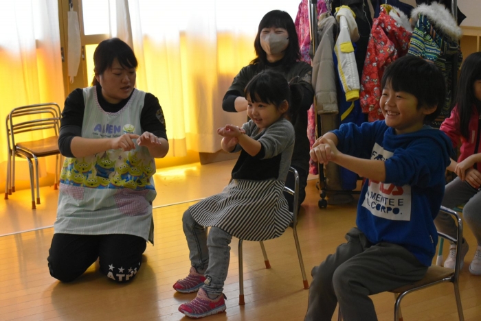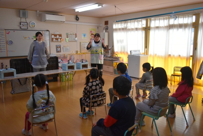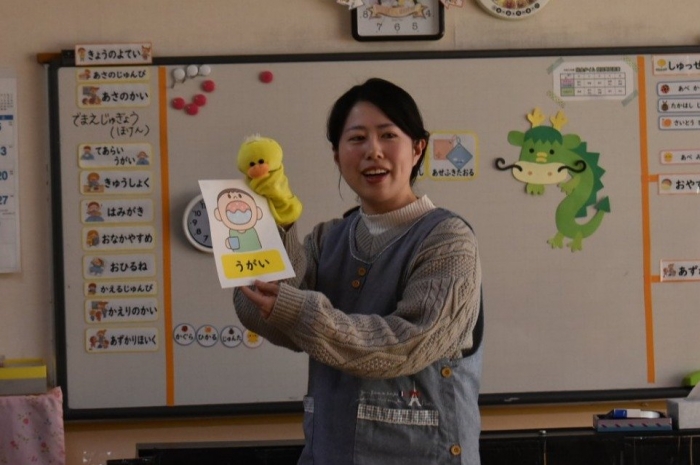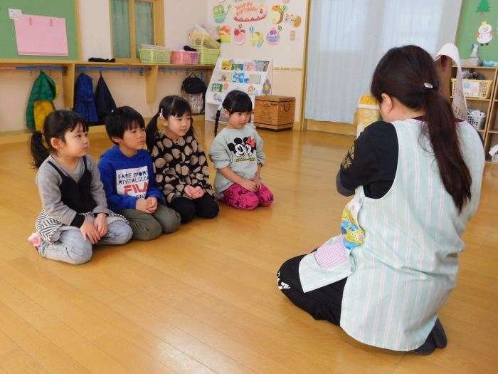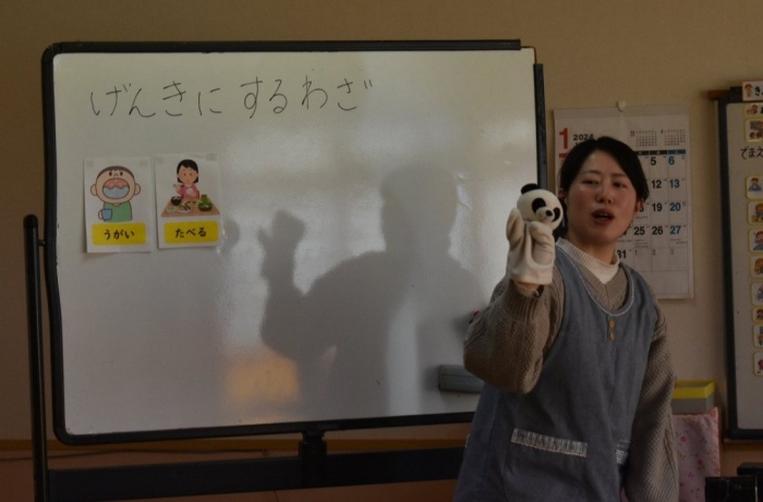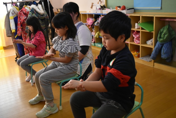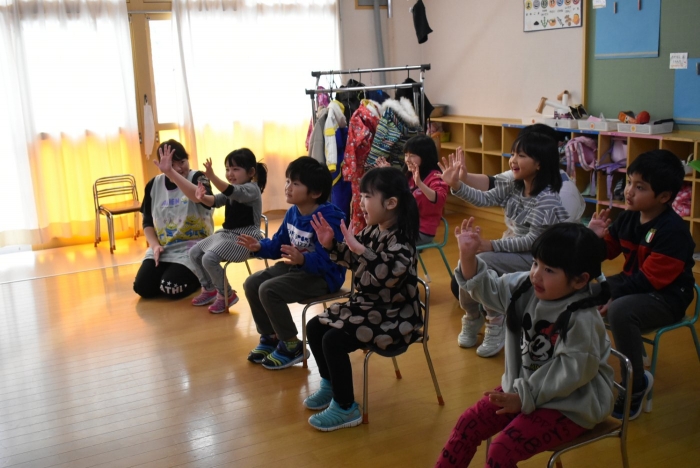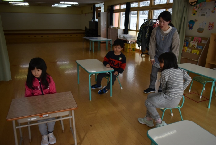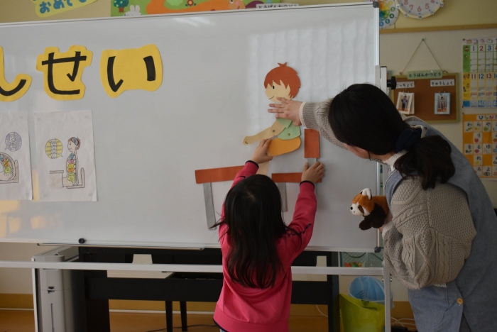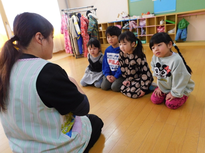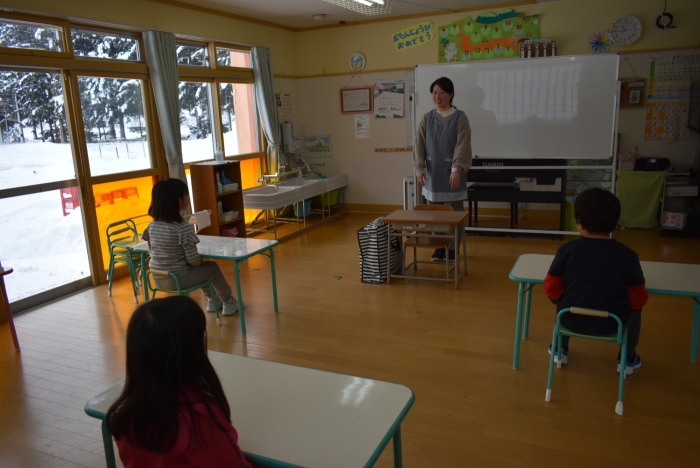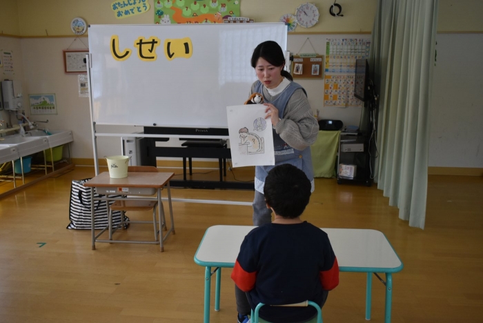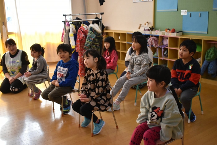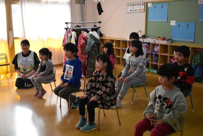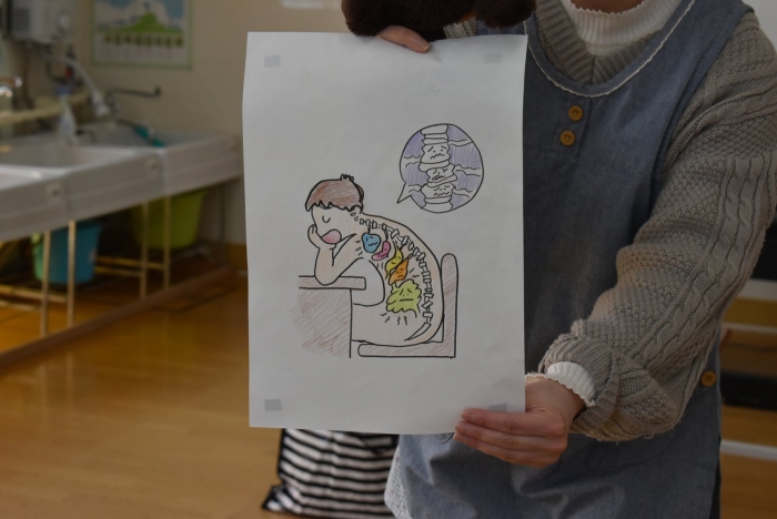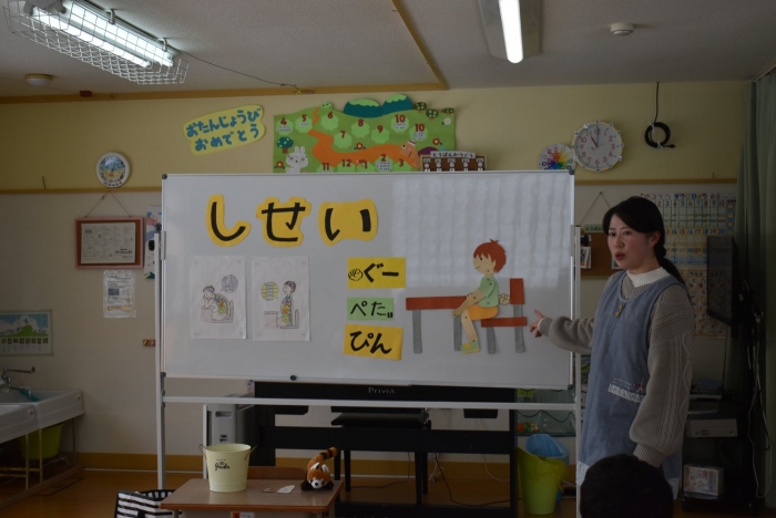 中西別小学校の養護の先生にお越しいただき,出前授業を行っていただきました。全園児向けに風邪予防について,さらに年長組は就学に向け正しい姿勢について教えていただきました。小学校交流や出前授業で,いつもお世話になっている養護の先生に対し,とても親しみを感じている子ども達。今回の出前授業も,わくわく楽しみながら受けていました。
