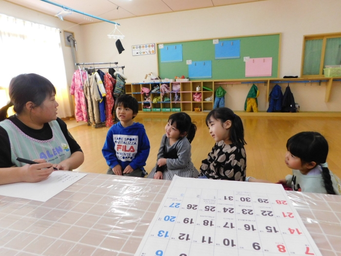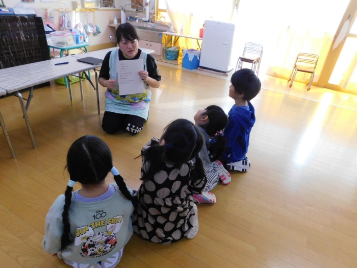 もうすぐ,年長組ひまわりさんが小学校へ行く,今までのように一緒に遊べないことを知った年少・年中児たち。ひまわり組との数々の思い出を振り返り,しみじみしていました。お別れの前に一緒に楽しみたいこと,何かしてあげられることはないか,それをすずらん・たんぽぽ組が考えやってみよう!と,年長組が出前授業を受けている間,ヒミツ会議を開いていました。 昨年度は年長児がいなかったため,お別れ会を主催するのは全員が初体験。今の年長児や2年生が主催した時の写真を見たり,昨年の進級パーティーのことを思い起こしながらイメージをわかせていました。次々と,やってみたいことが出てきたり,「みんなで,エイエイオー! しよう」との言葉も出され,『ひまわりさんのために』『クラスみんなで力を合わせよう!』そんな思いが伝わってきました。もちろん,ひまわりさんには,ヒミツ!ナイショで(^^♪