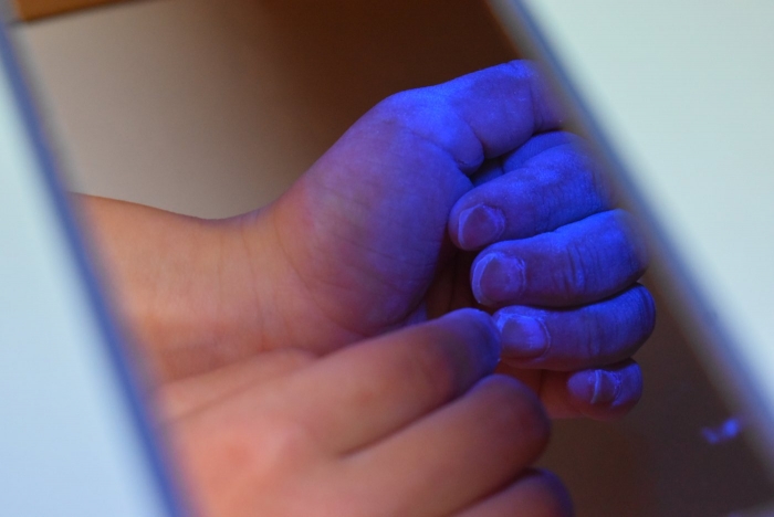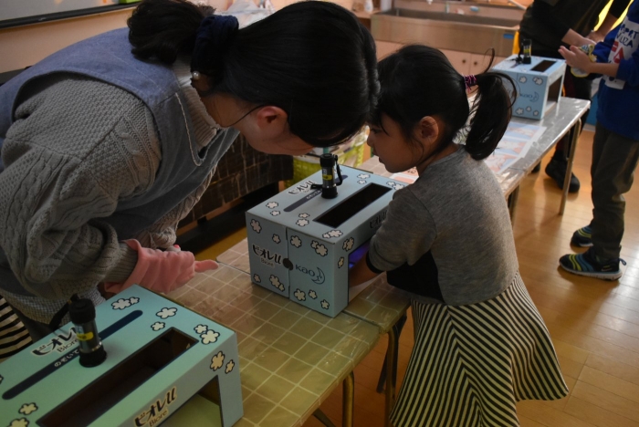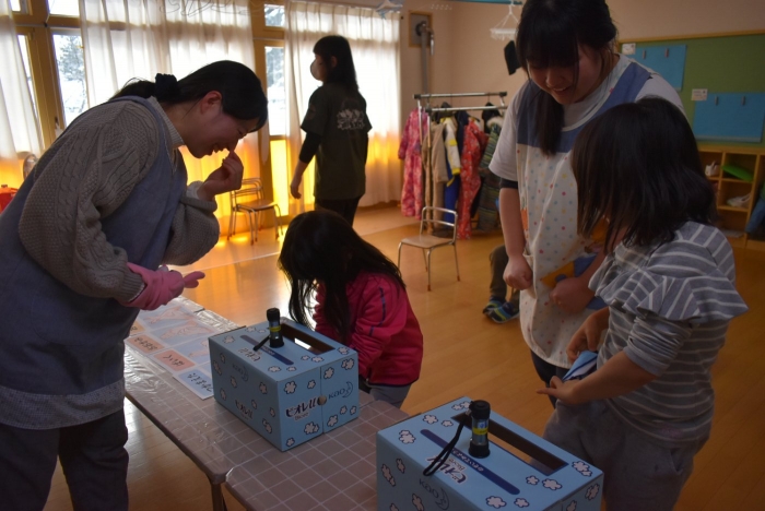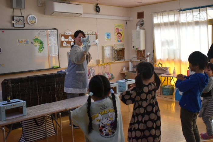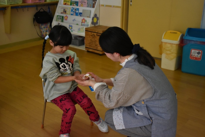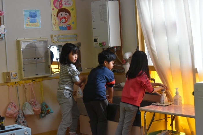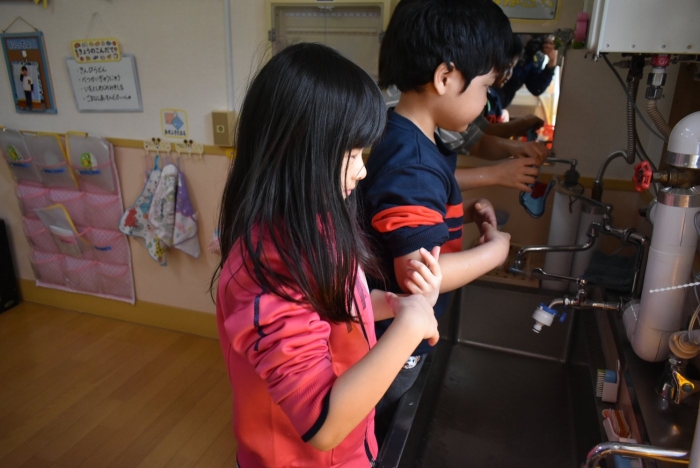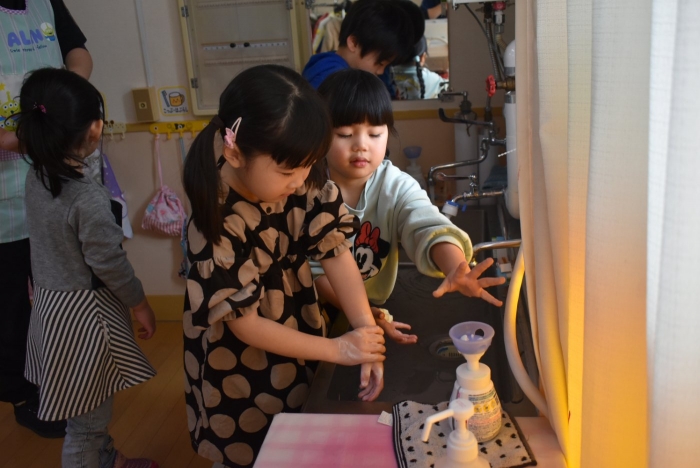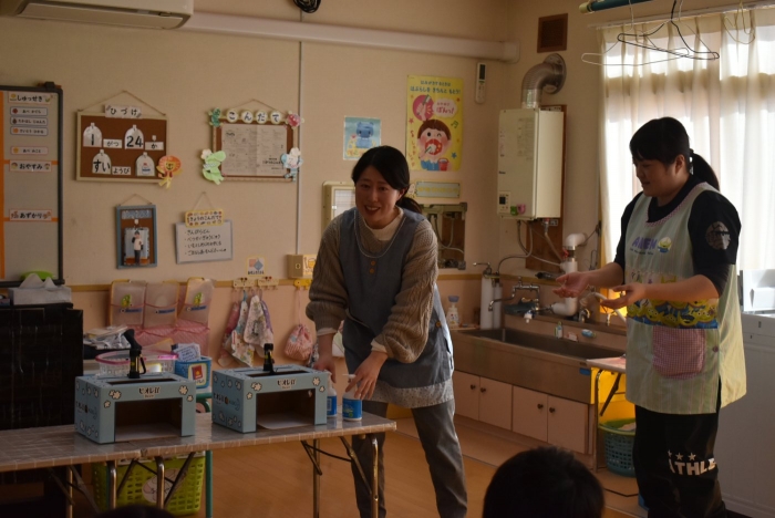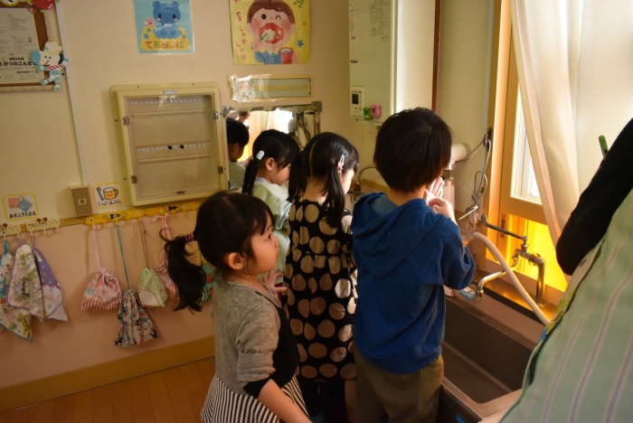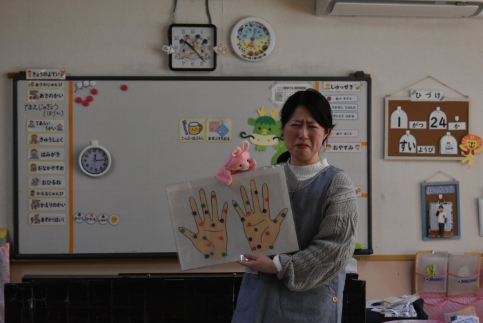 冬場は,ウイルスが活性化しやすい条件が揃う季節。パペット人形とのやり取りで,風邪菌に負けない丈夫な体づくりのために『手洗い』『うがい』『食事』『睡眠』『運動』が大切なことを感じていました。普段の手洗いで雑菌が取れているのか,今年も『手洗いチェッカー』が登場!  手洗いをしたはずなのに…,自分の手に付着している雑菌の多さに驚愕する子ども達の姿がありました。菌を減らす効果的な手洗い方法をおさらいし,入念に手洗いをしていました。今後も,意識・ 継続していけるような援助で,元気いっぱい過ごしていきたいと思います。