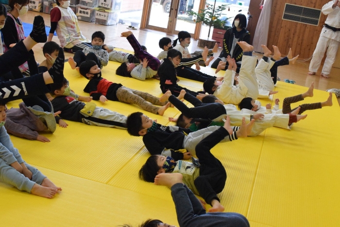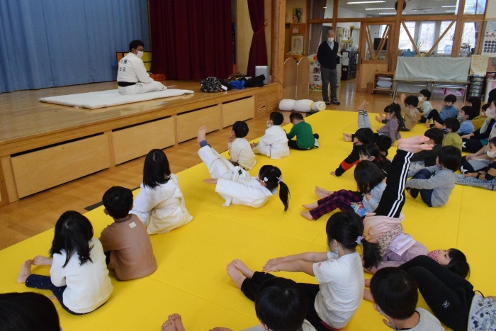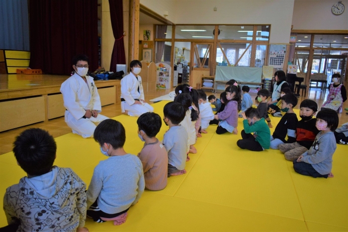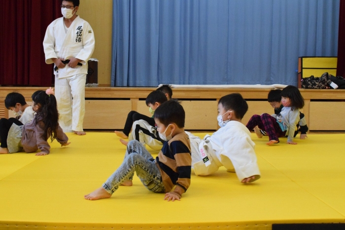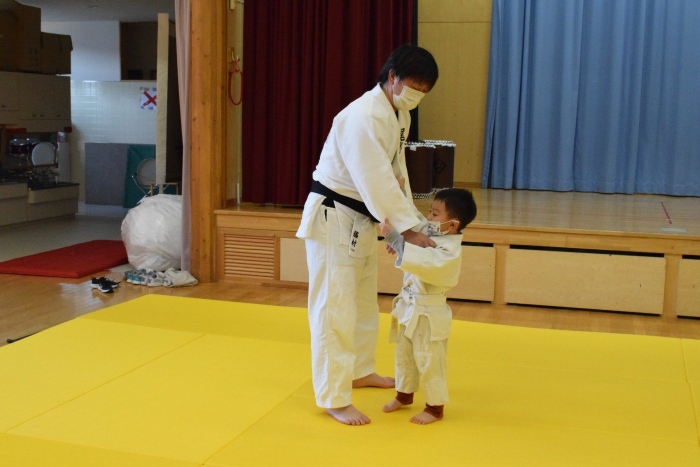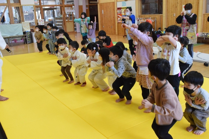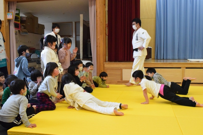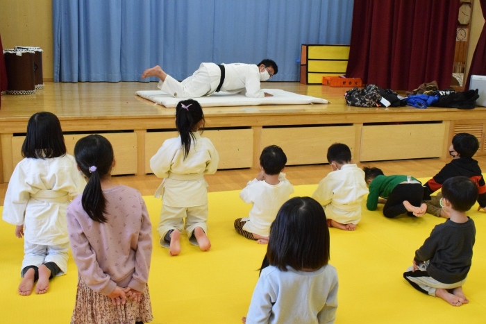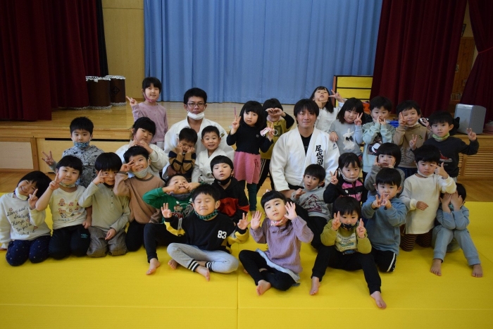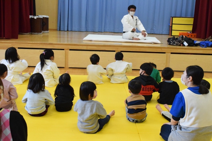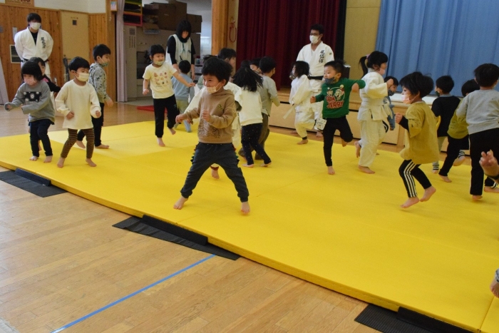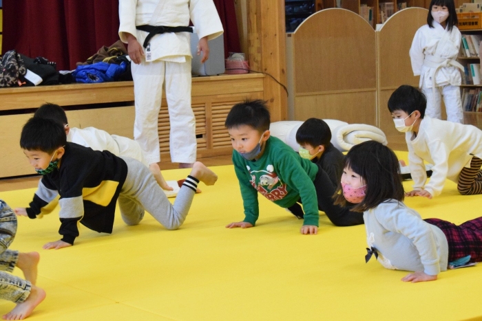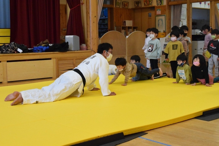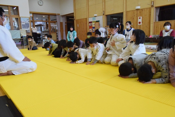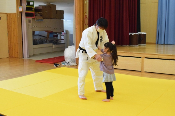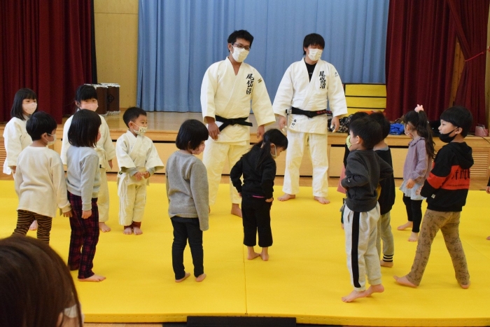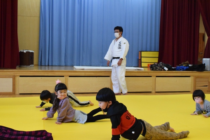 今日は尾岱沼柔道少年団で指導されている2名の先生が体験教室を開いてくださいました。うちの幼稚園にもこの柔道少年団に入っている子が4名います。初めに先生から柔道について簡単にお話があり、技も披露していただきました。ドスン!という迫力ある投げ技にみんなびっくり!すご~いと息をのみました。その後基本の挨拶や受け身、体のこなしなどで1時間ほど体験いたしました。これを機に柔道に興味を持って少年団に入会する子が増えるといいですね。お二人の先生お忙しい中たいへんありがとうございました。