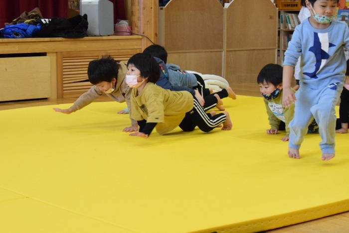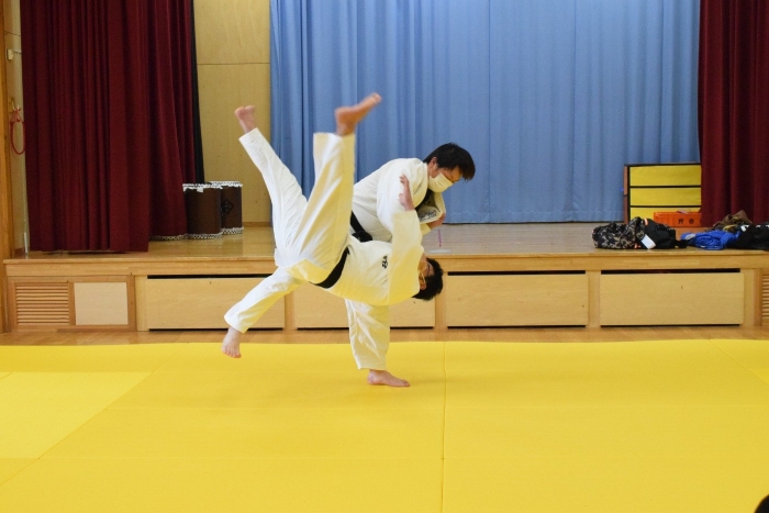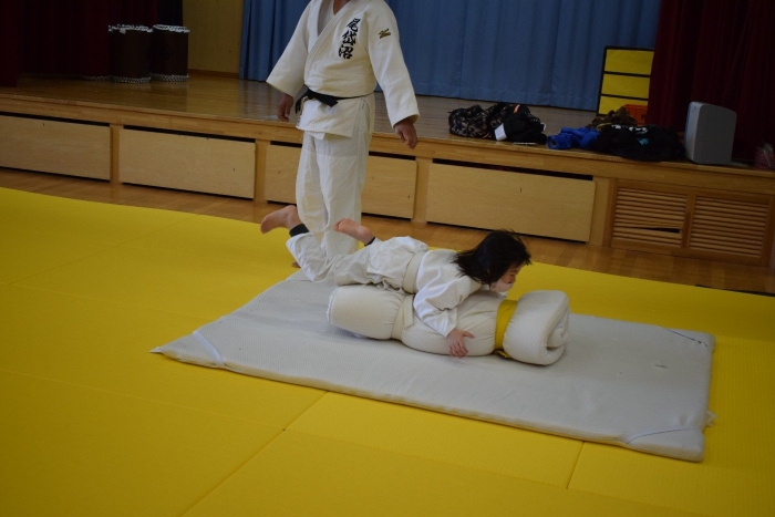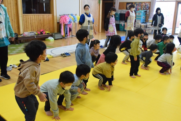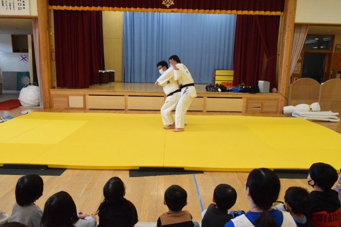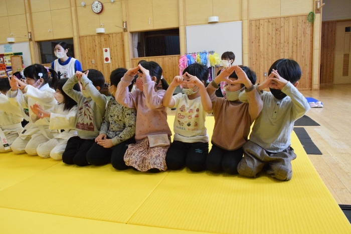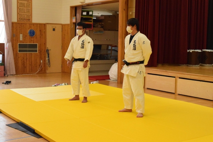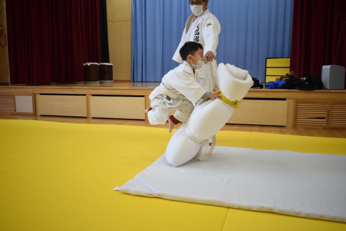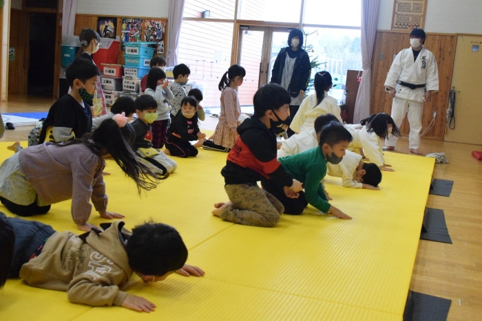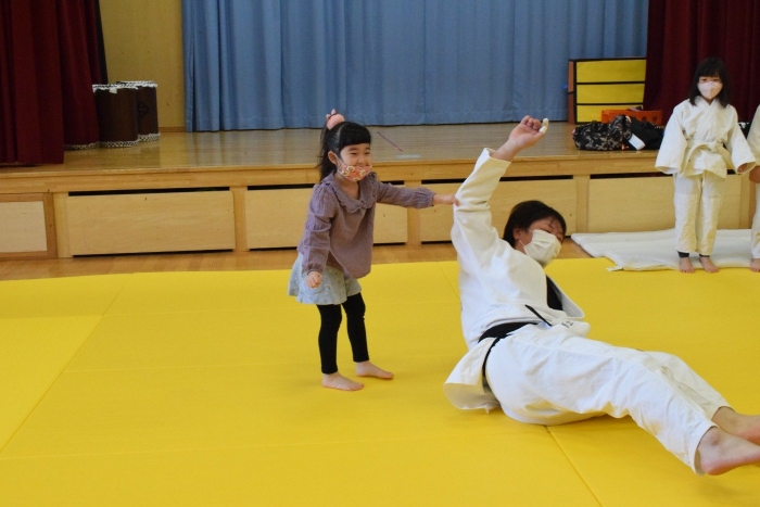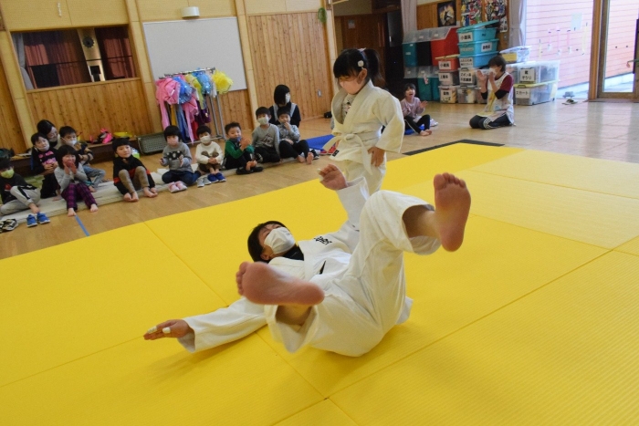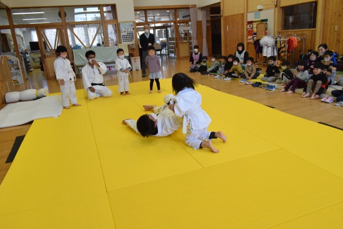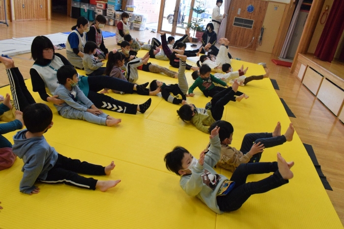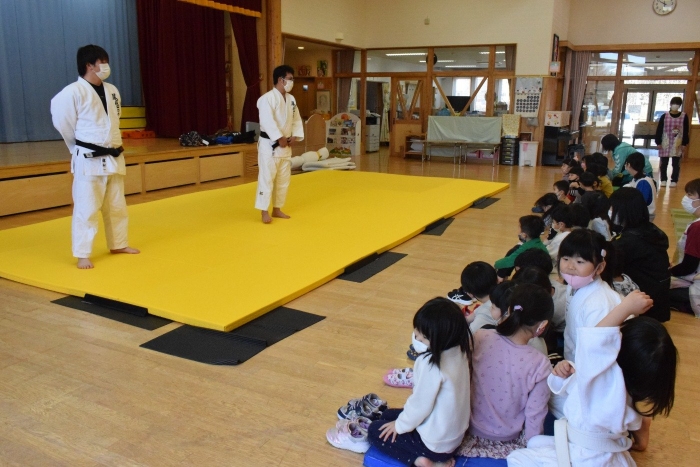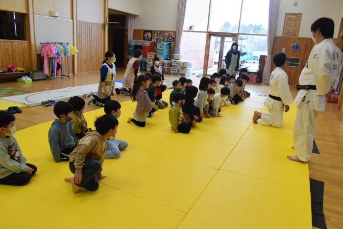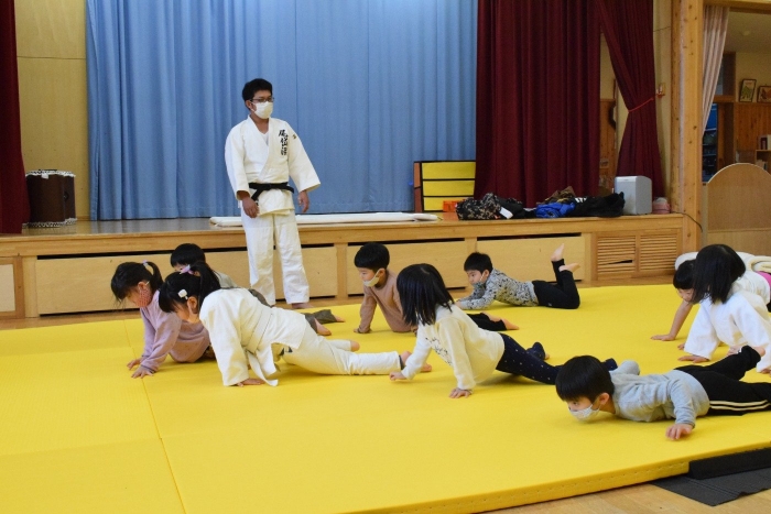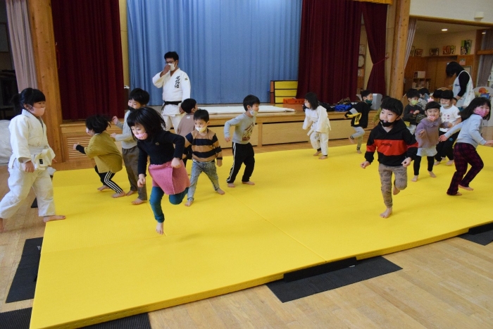 今日は尾岱沼柔道少年団で指導されている2名の先生が体験教室を開いてくださいました。うちの幼稚園にもこの柔道少年団に入っている子が4名います。初めに先生から柔道について簡単にお話があり、技も披露していただきました。ドスン!という迫力ある投げ技にみんなびっくり!すご~いと息をのみました。その後基本の挨拶や受け身、体のこなしなどで1時間ほど体験いたしました。これを機に柔道に興味を持って少年団に入会する子が増えるといいですね。お二人の先生お忙しい中たいへんありがとうございました。