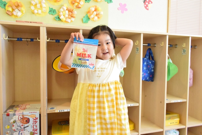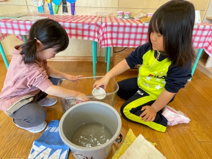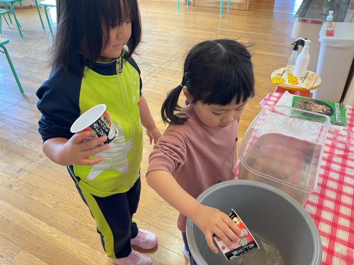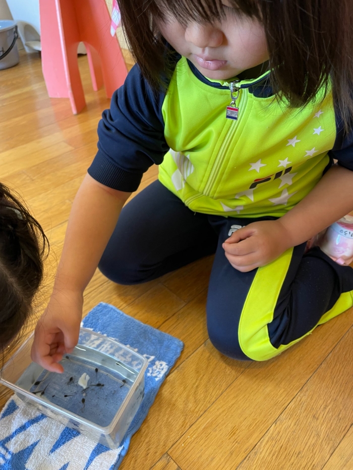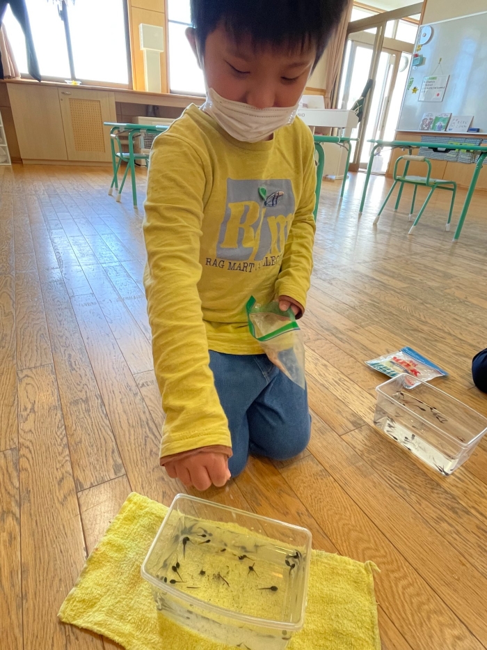 ひとり一人、自分専用のおたまじゃくしを飼っているさくらさん。おたまじゃくしは何が好きなのか気になったようで自分なりに考えて、今日おうちからいろいろなエサをもって来てくれました。かつお節、パン、せんべい、バナナ、キャベツ、なんとホタテも!さて、何が一番食いつきが良かったでしょうか?