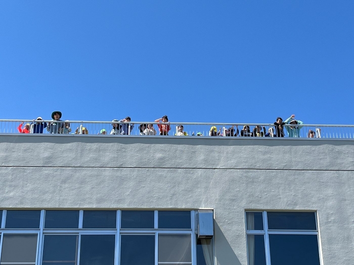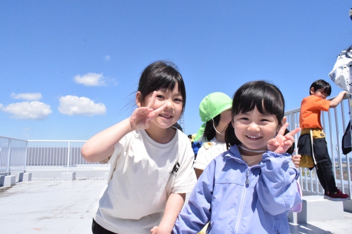 昨日の風で散ったところもありましたが、ハラハラ舞う花びらがまた美しく、集めては自分にかけて花びらのシャワーを浴びてはキャー、また集めて吹いてを繰り返し楽しんでいました!(^^)! 屋上からの景色も、天気が良かったこともあり遠くの山々まではっきり見えて絶景でした!