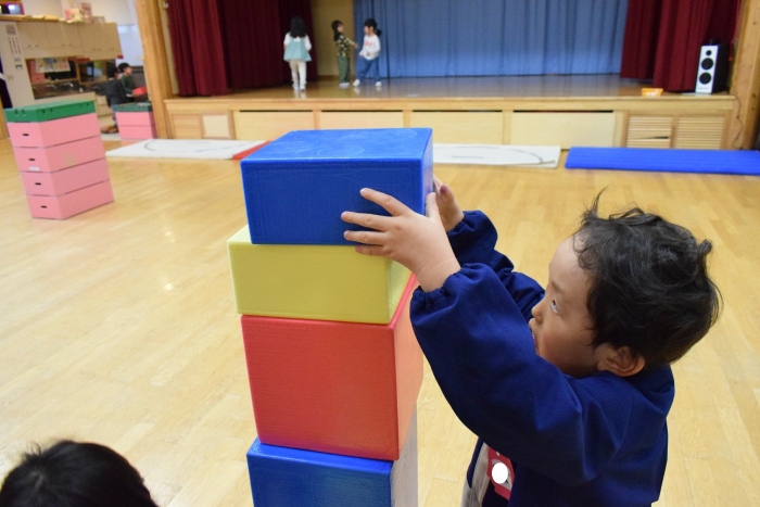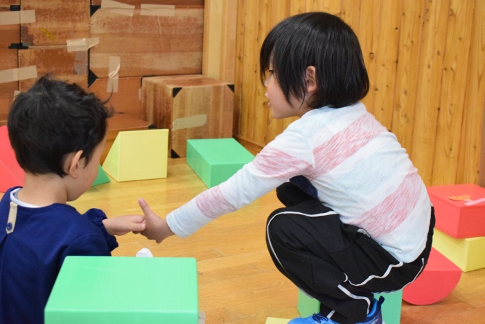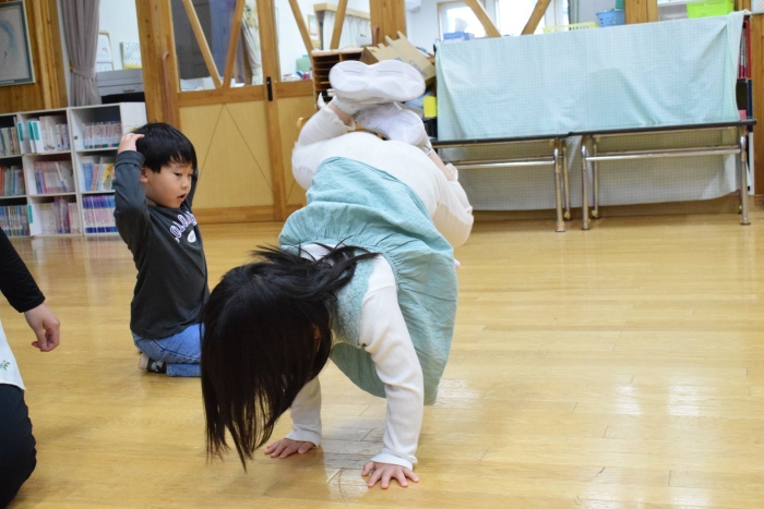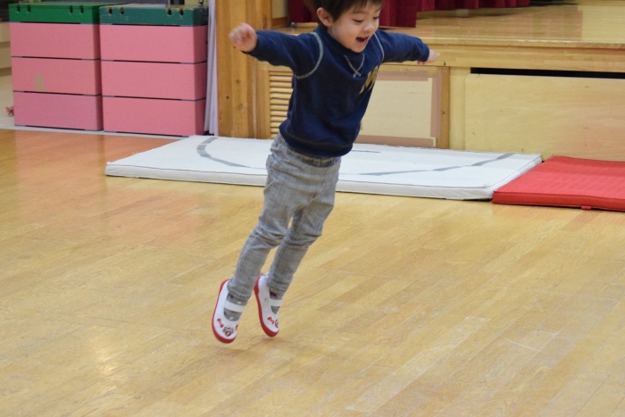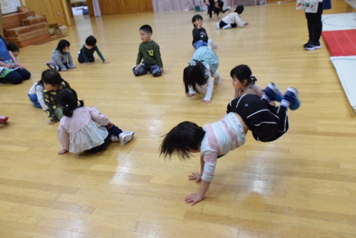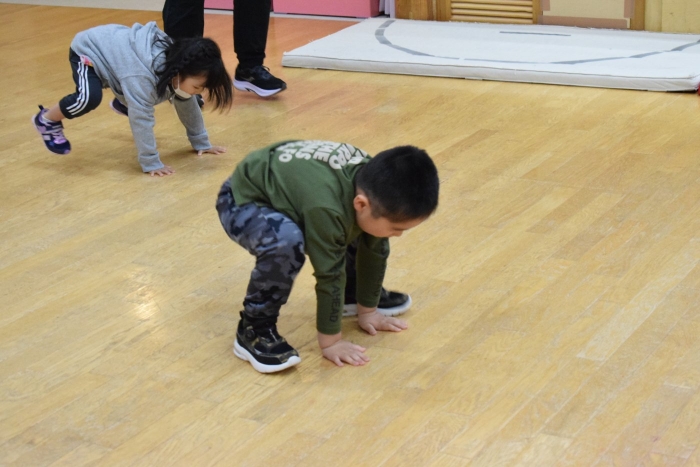 前回に引き続きカエル跳びから。この動きは跳び箱を跳ぶときの体の使い方になります。手を先についてから足を横前方にもってくる動きが大事!