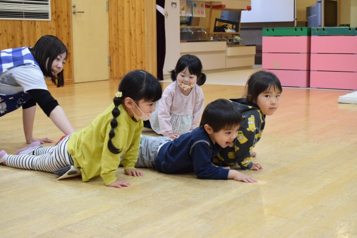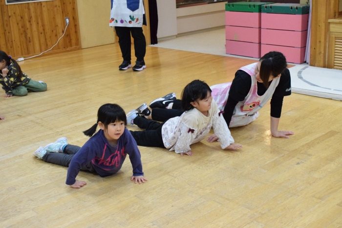 最後にアザラシにも挑戦。腕をピンと伸ばして、お腹を床につけないようにしながら腕だけの力で前進します。