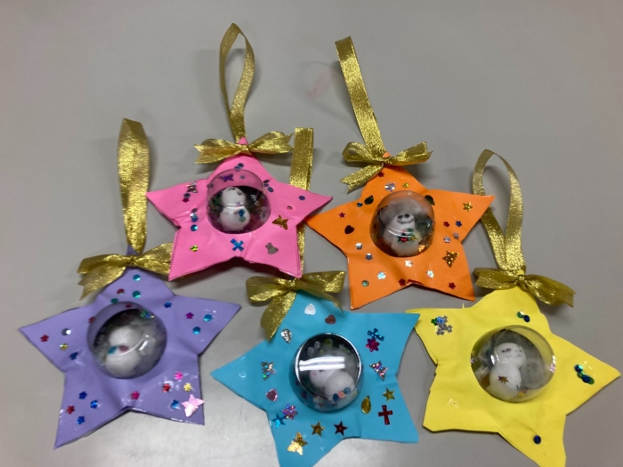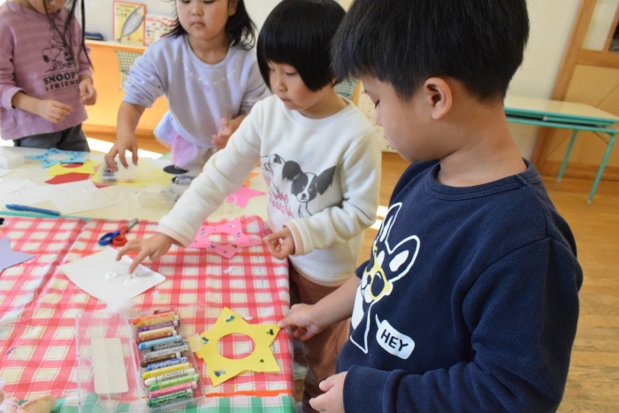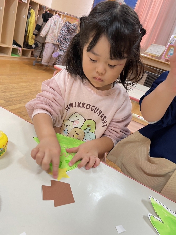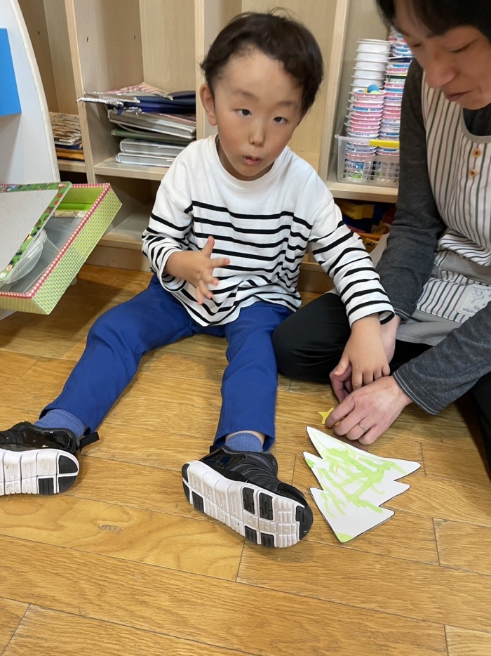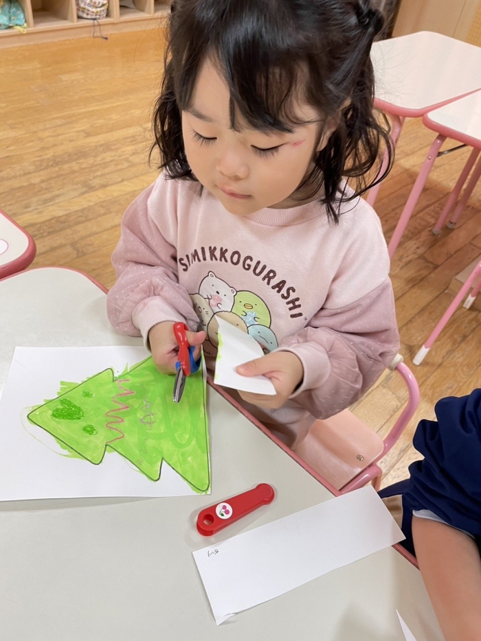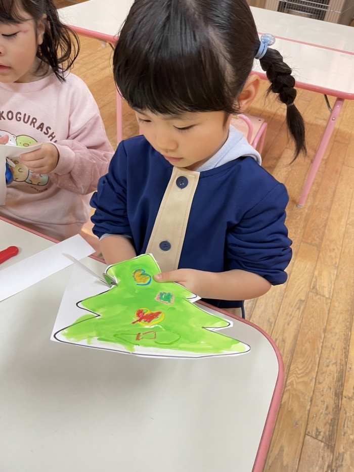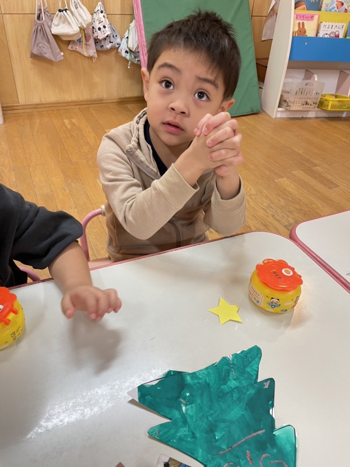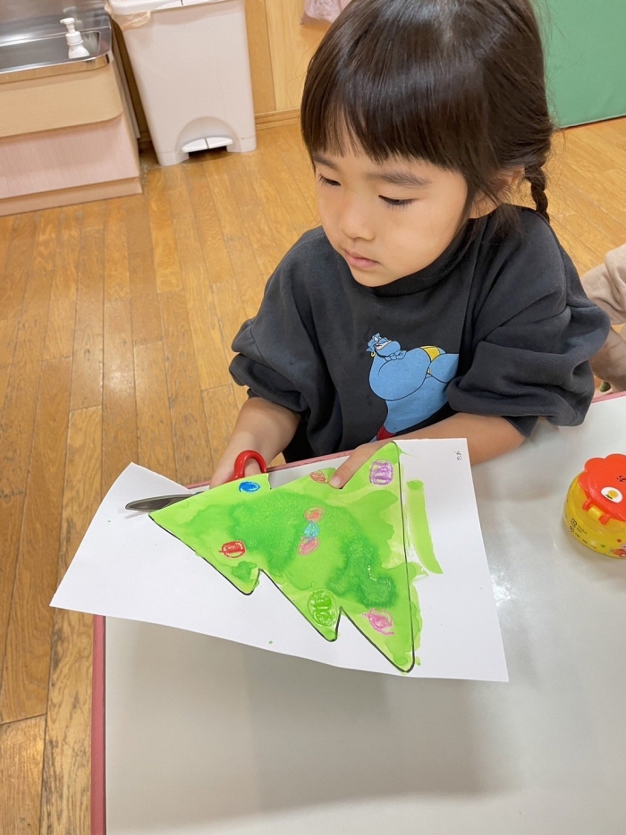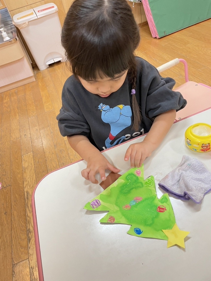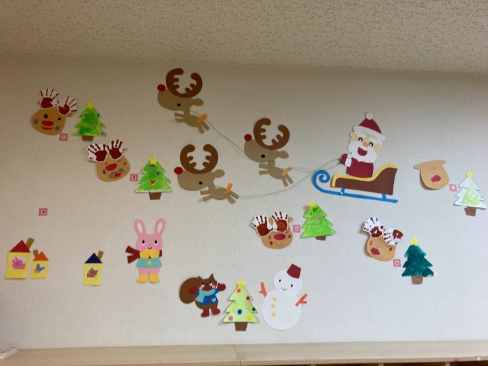 ツリーを絵の具で塗って、飾りつけ、できたツリーとこの前作ったトナカイはお部屋の壁面を飾っています。