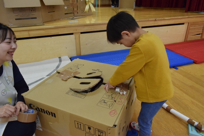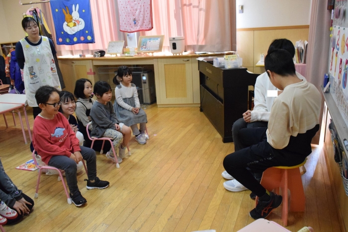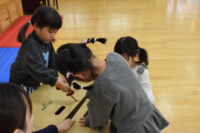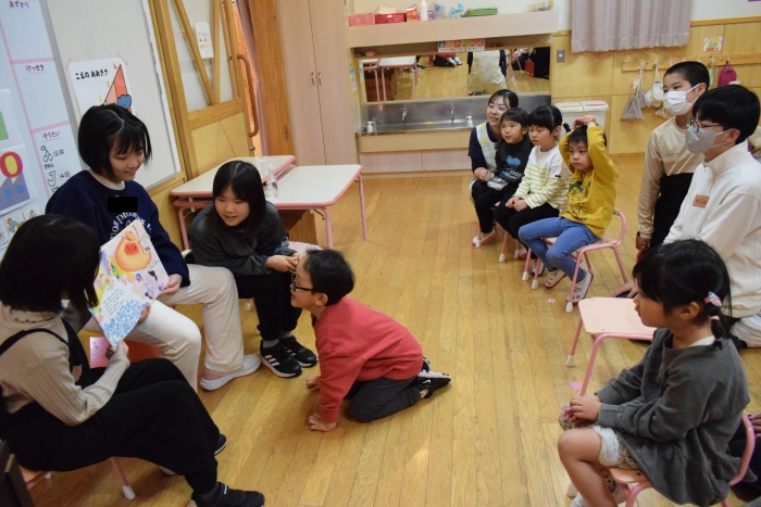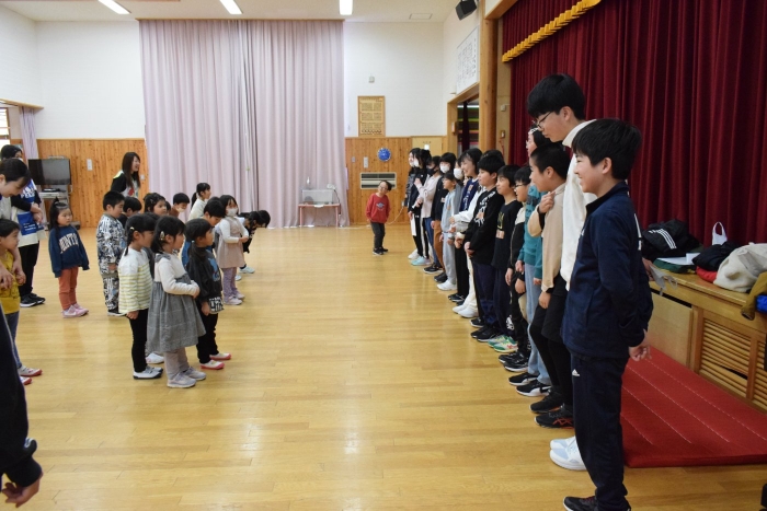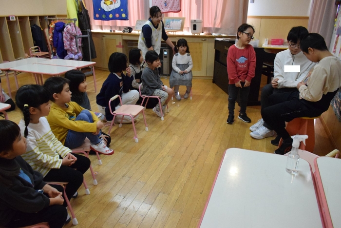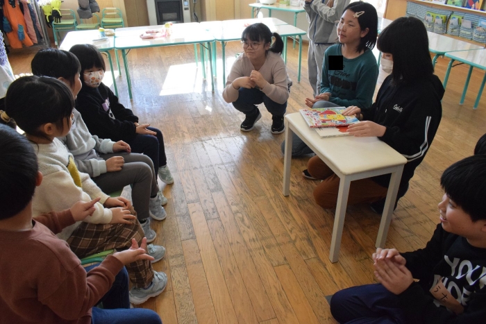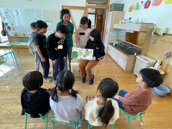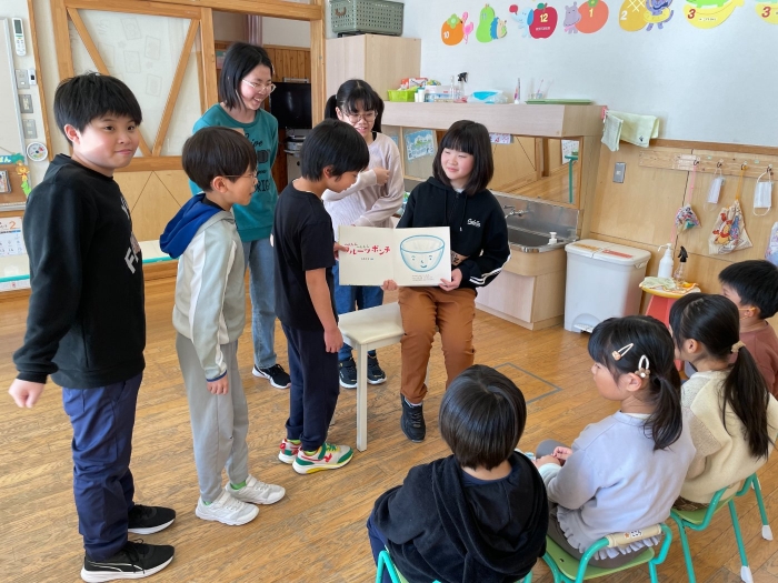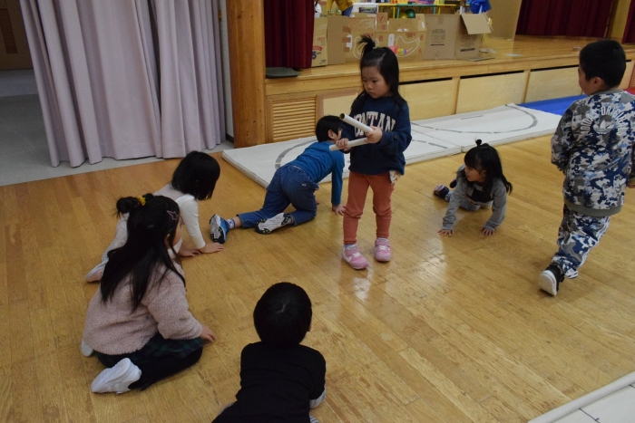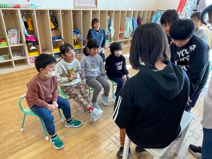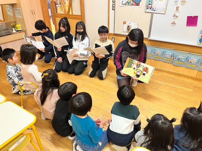 さくらさんが1年生になったときに最上級生として関わるであろう5年生と遊びを通して親しみがもてるようにという思いで交流をしました。5年生は園児が喜びそうな遊びをいろいろ考えてきてくれました。幼児の気持ちを察しながら同じ高さの目線で話しかけてくれたり、入れない子には優しく手を添えてくれたりと、細やかな配慮も見られて、子ども達も安心して自然と関りを楽しめるようになっていました。帰る頃には名残惜しそうにいつまでも見送る姿がありました(*^-^*) 5年生の名前も思っていた以上に覚えていて、憧れの存在になったようです(*^-^*)