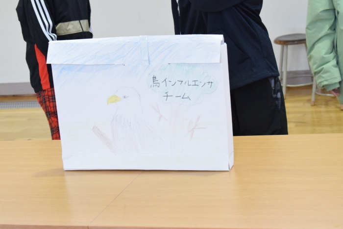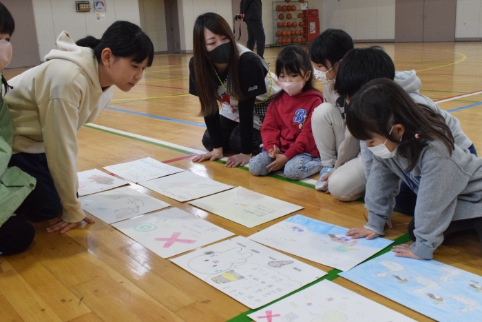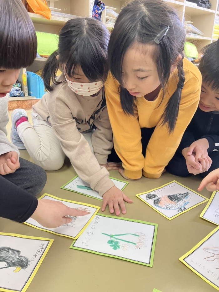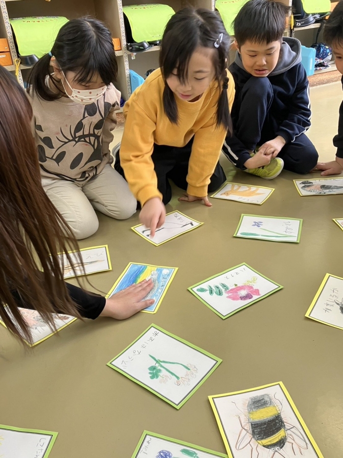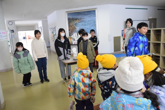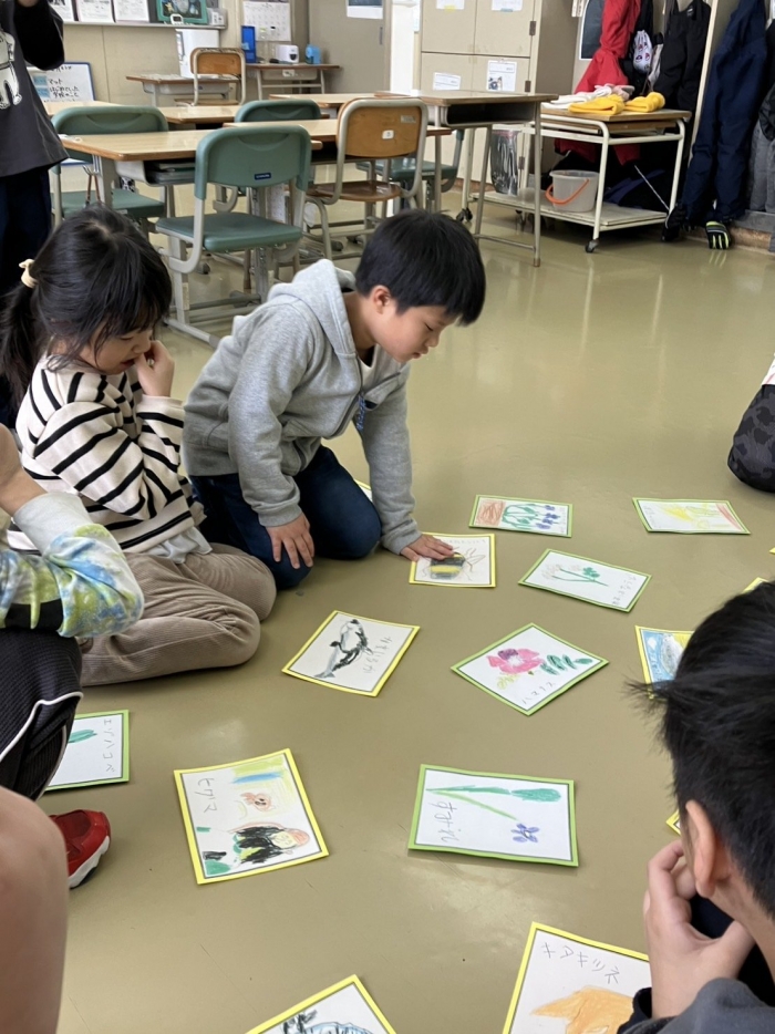『野付の自然』をテーマにしたカルタを1年生が制作。一緒に遊んだ後は園児にプレゼントしてくれました!