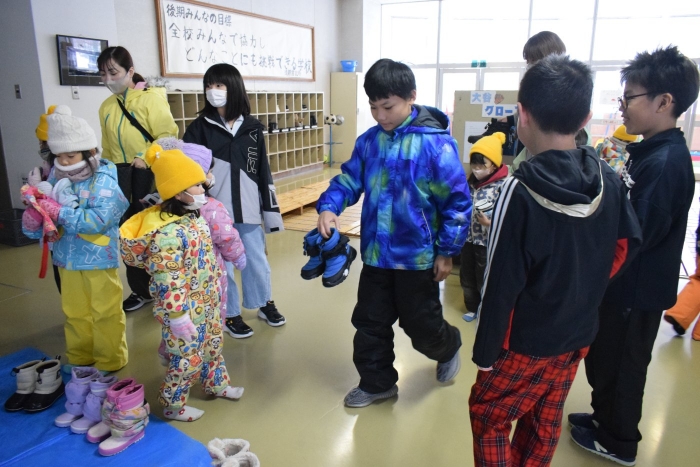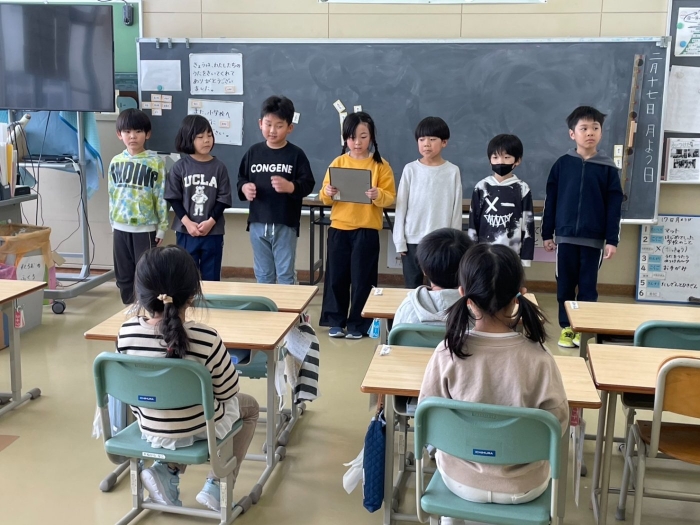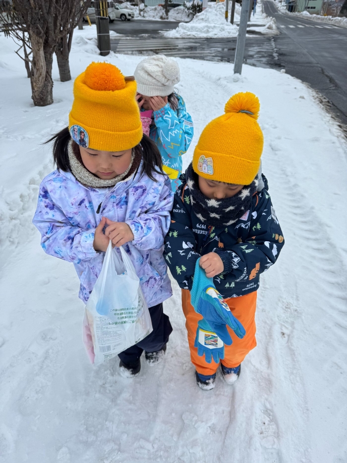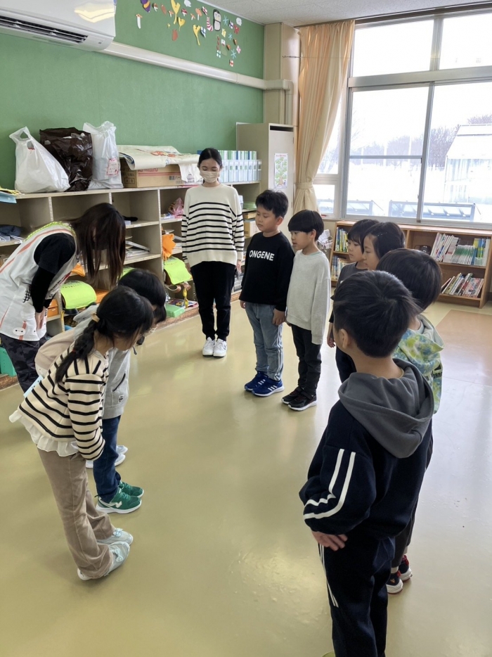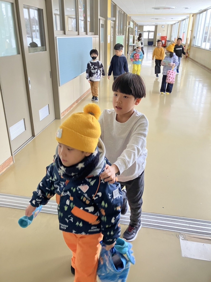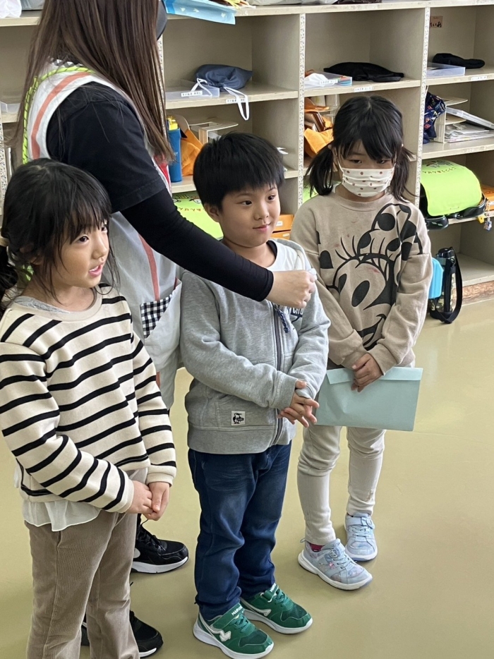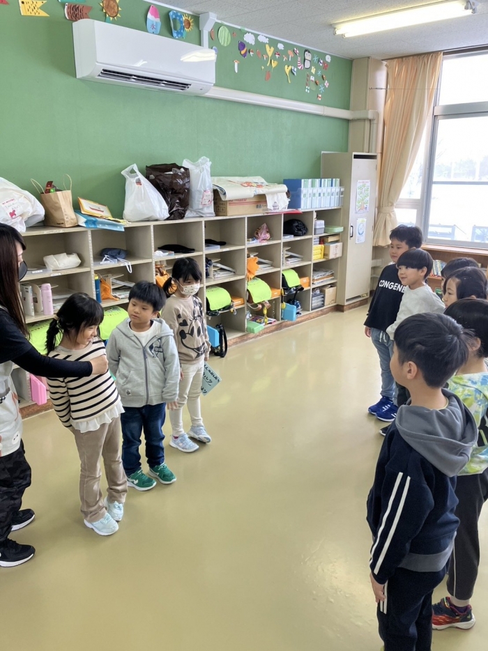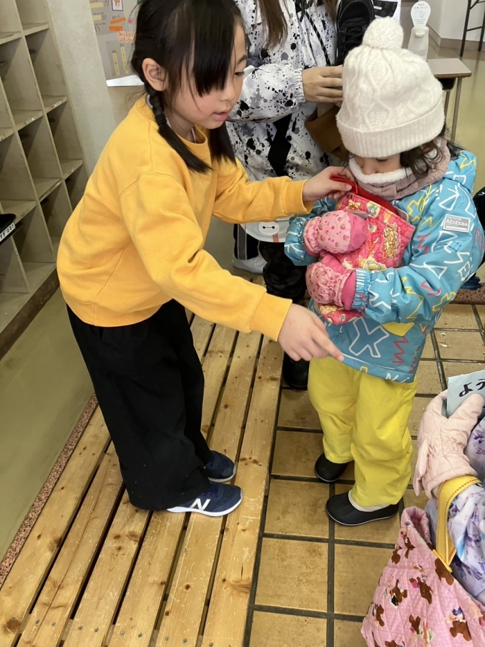 先日の5年生に続き、今日は4年生と交流をしに小学校に出かけて行きました。健康休業日の関係でお休みが多く9名と少ない園児たちでしたが4年生は喜ばせてあげよう頑張ってくれました。手作りの紙芝居を観たり、慣れ親しんだ遊びの『だるまさんの一日』でスキンシップを図ったり・・・と短時間で心は急接近したようです(*^-^*) うめ、ももさんは先に帰ってきましたがさくらさんは残って1年生との交流もしてきましたよ! 今回の交流で今年度は小学生全学年と触れ合うことが出来ました。幼小の連携の意味でも実りの多い活動になり、更に深い連携へと来年度以降もつなげていきたいと思います。