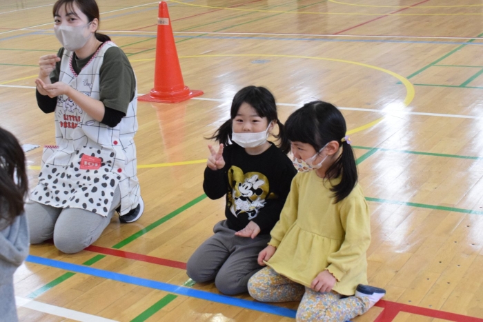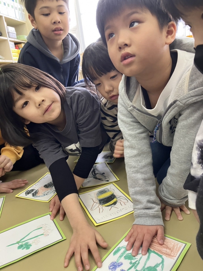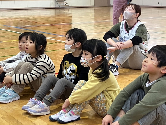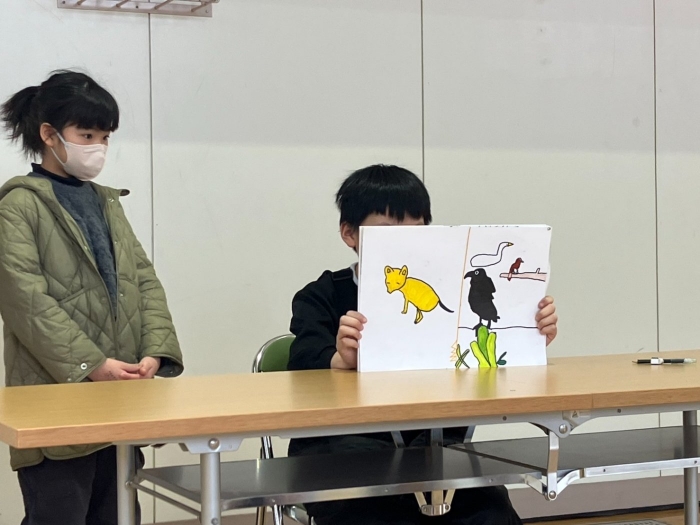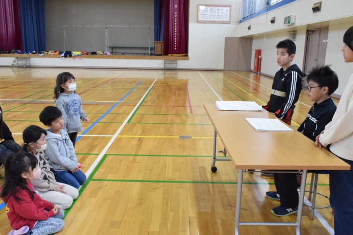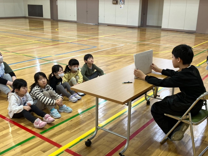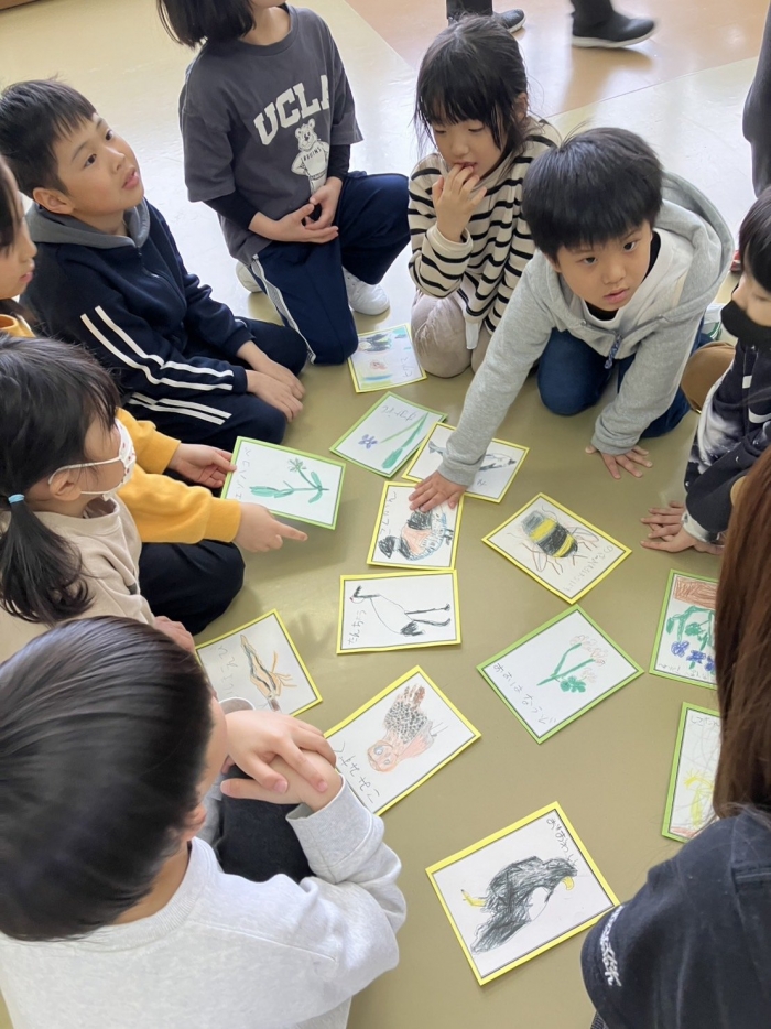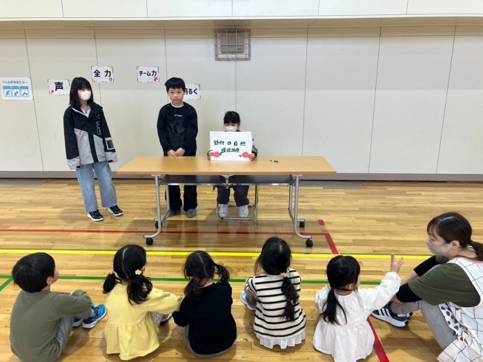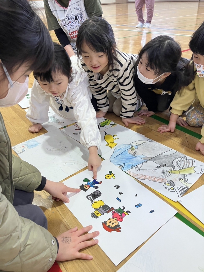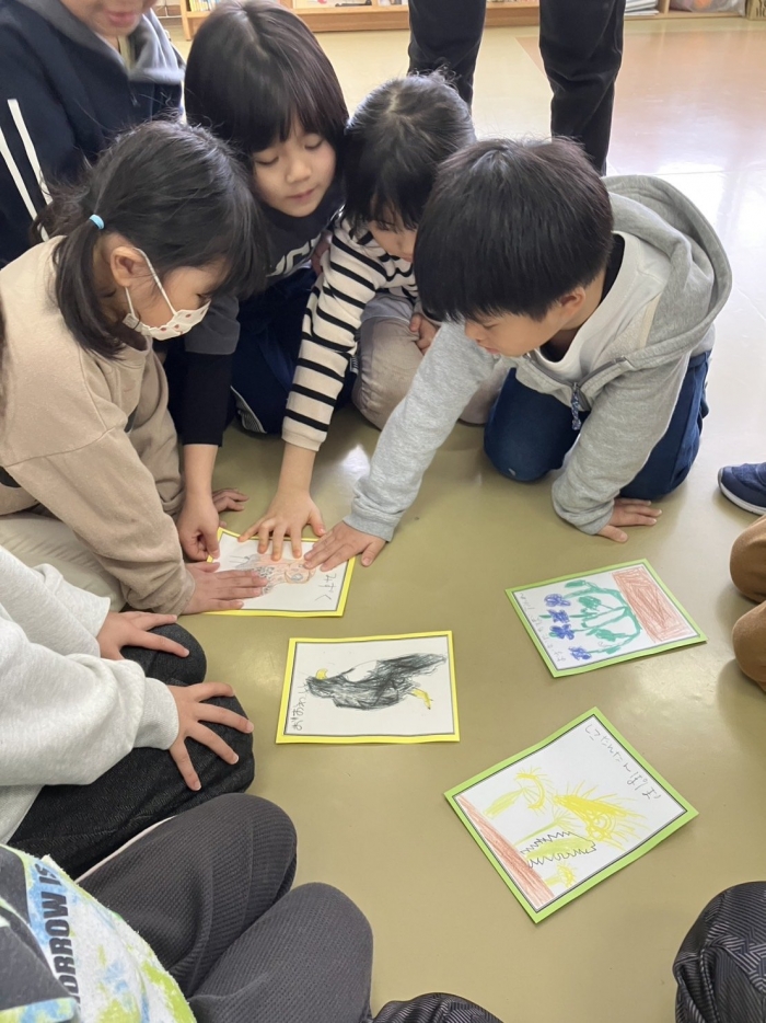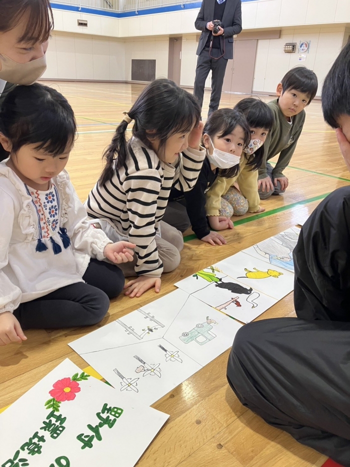 2グループに分かれて読み聞かせをしてくれました。テーマがさすが小学生。内容は環境問題に関わる紙芝居で園児たちにはちょっと難しかったようですが、「死んだ鹿は菌をもっているので触らないように」など、一生懸命読んでくれて上手な絵と説明に引き込まれていったようです!(^^)!