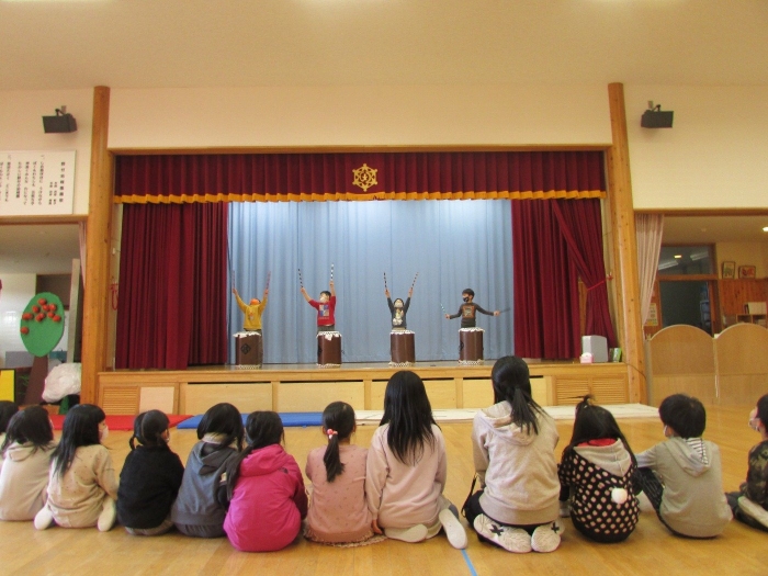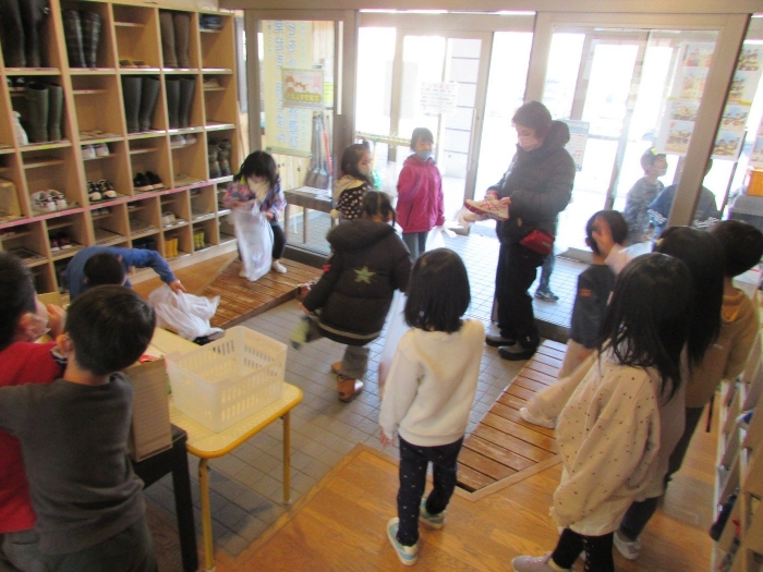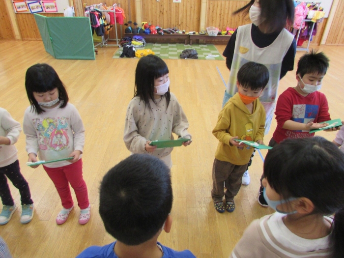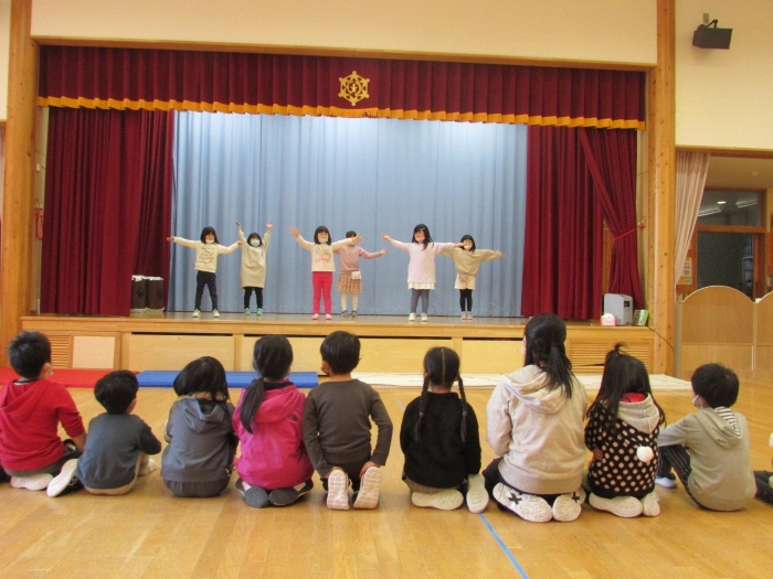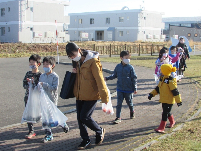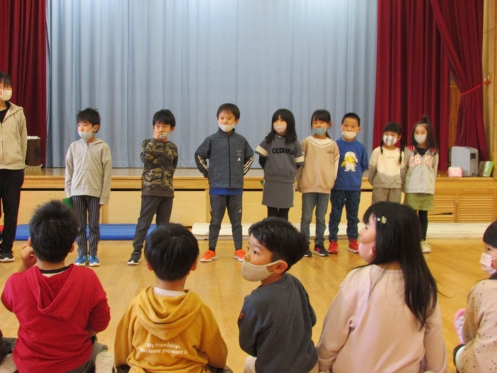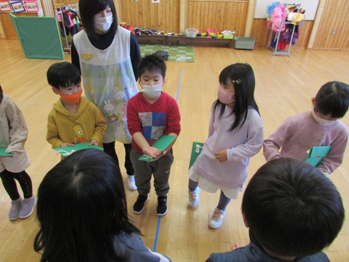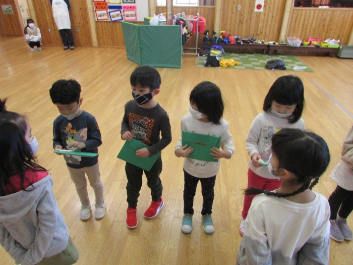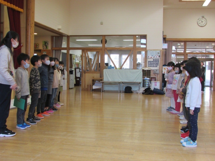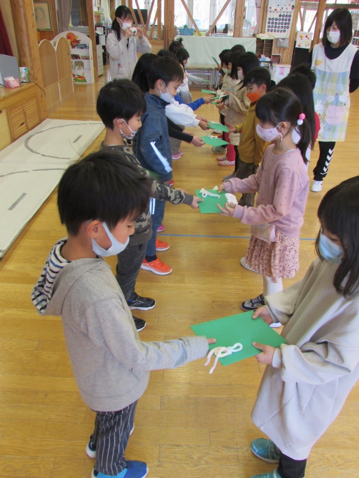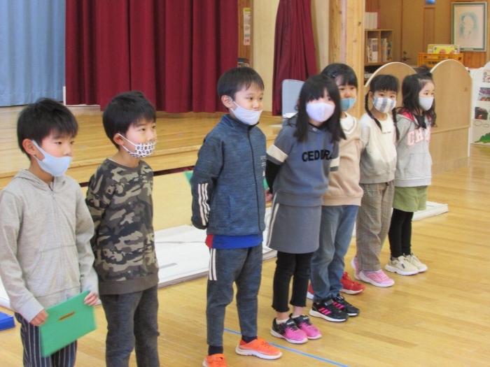 今日おとなりの野付小学校1学年の皆さんが来園してくれました。「ひさしぶり~元気?」と挨拶が飛び交い再開を喜びました。来園していただいた目的は来週さくら組のお友だちが生活科交流で小学校に招待されていて、その手作りの招待状を携えて来てくれたのです。一人一人1年生の先輩から受け取り来週遊ばせてもらいに行く約束を交わしました。お遊戯会直後ということもあり、1年生の先輩の皆さんへさくら組がおゆうぎ二つを披露して御礼に替えました。どうもありがとうございました。来週必ず行きますよ~!