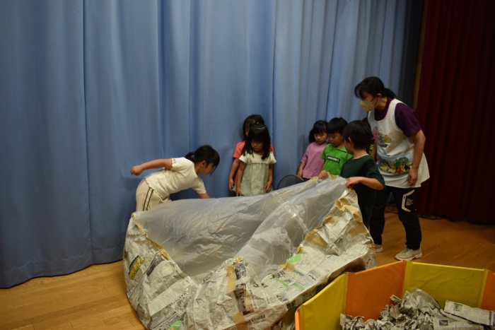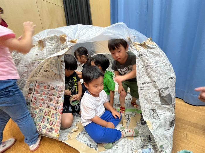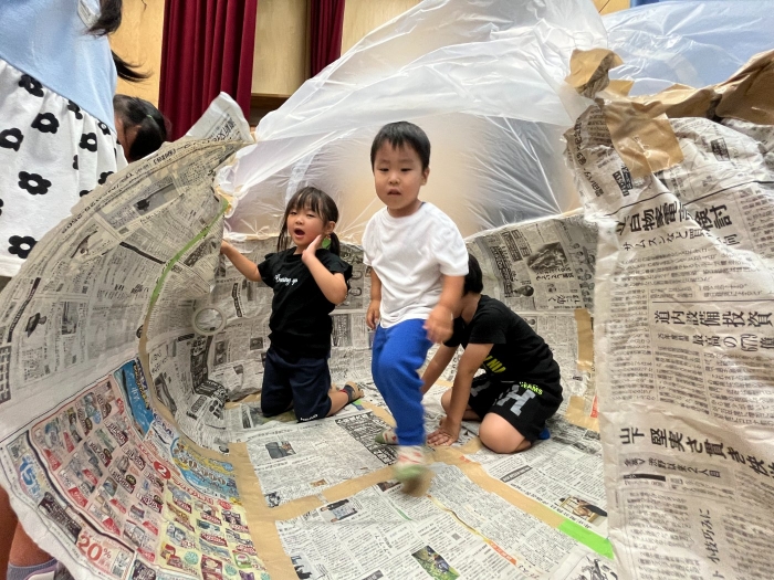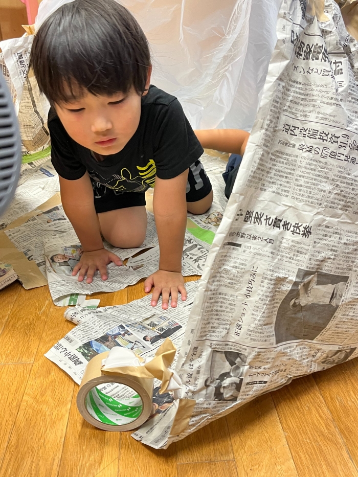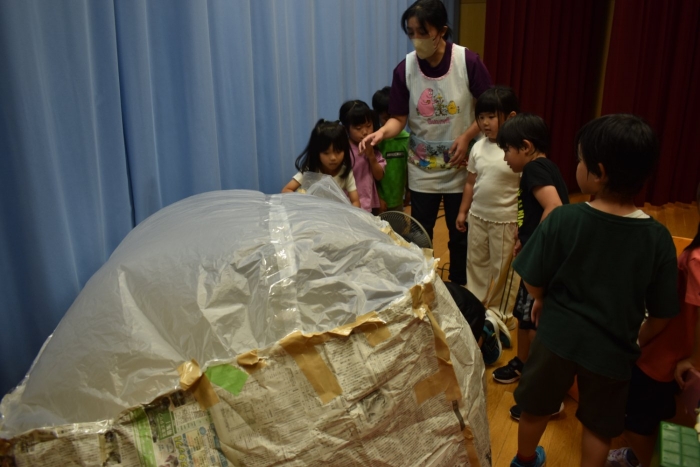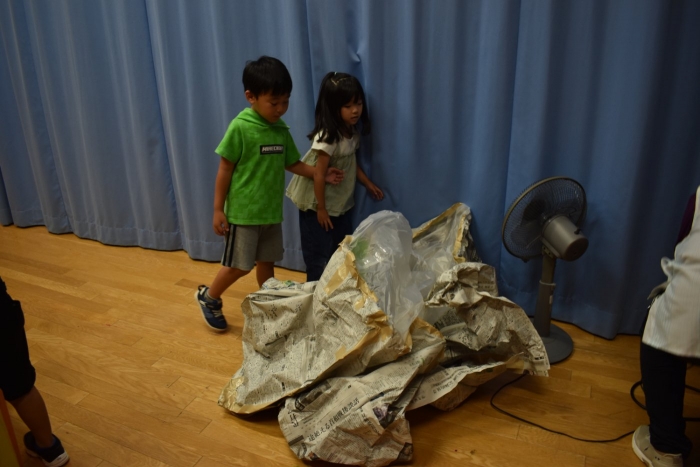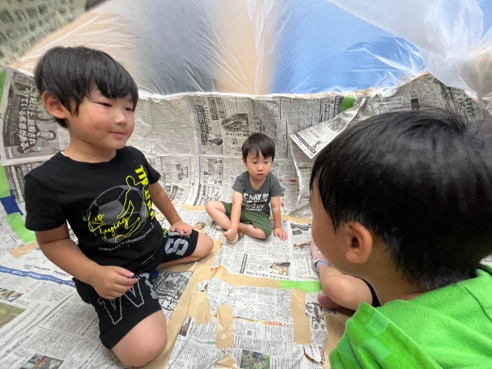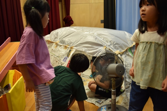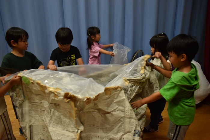 なんとなく,どっきり大作戦の内容・雰囲気がわかってきましたね。最初はお化け屋敷をイメージして始めたとのことでしたが,少しずつ,子どもたちのやりたい,作りたいもののイメージが変化していき「どっきり大作戦」になったみたいです。さくら組さんのイメージ,実現できたのかな?あとは給食後に行うため,もりもり給食を早く食べ終わる!と意気込んでいたさくら組さんです!