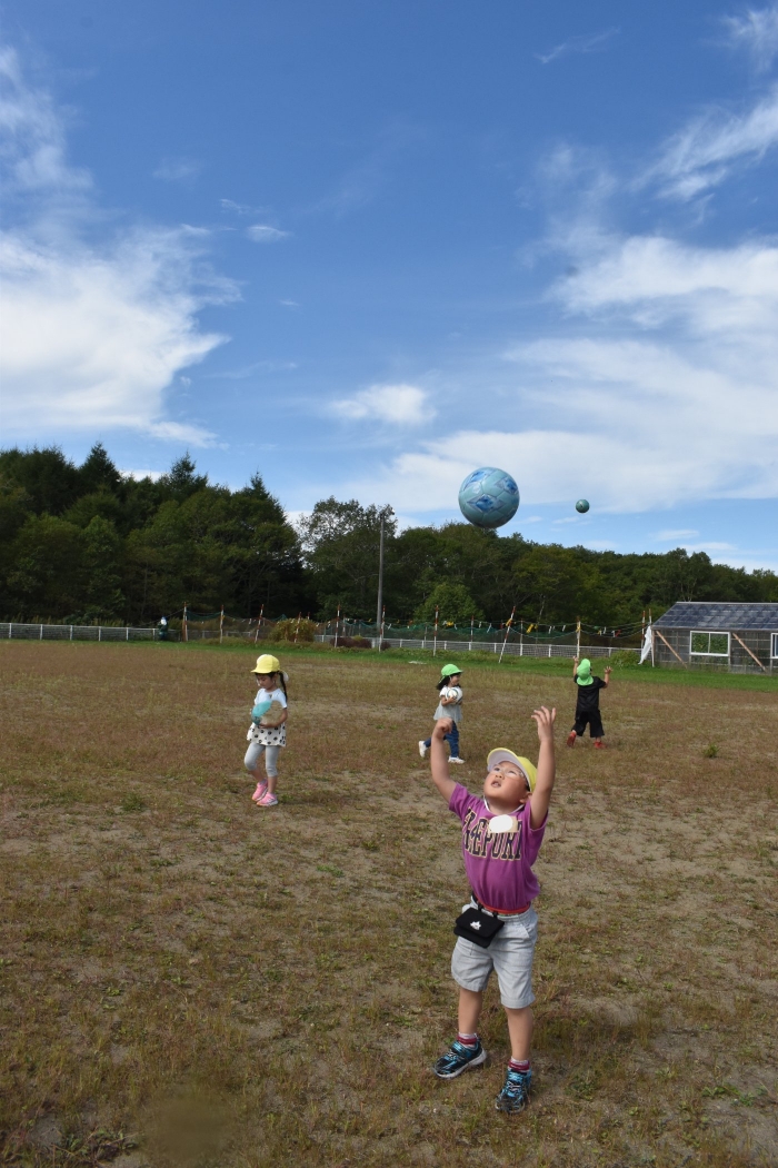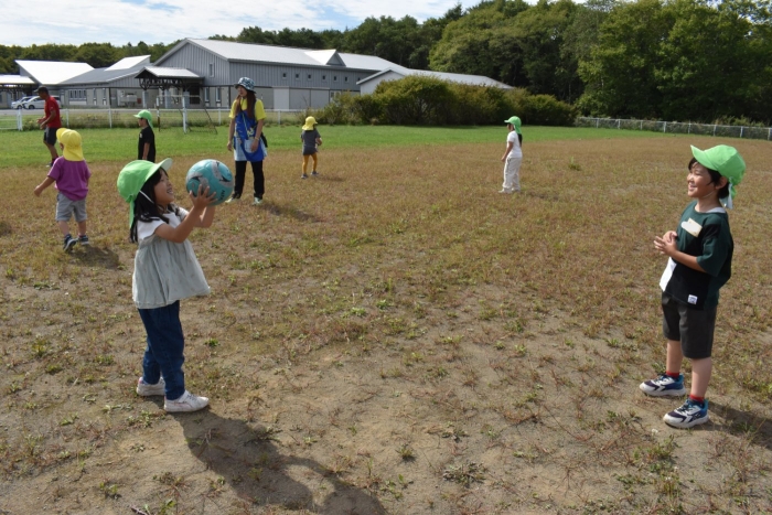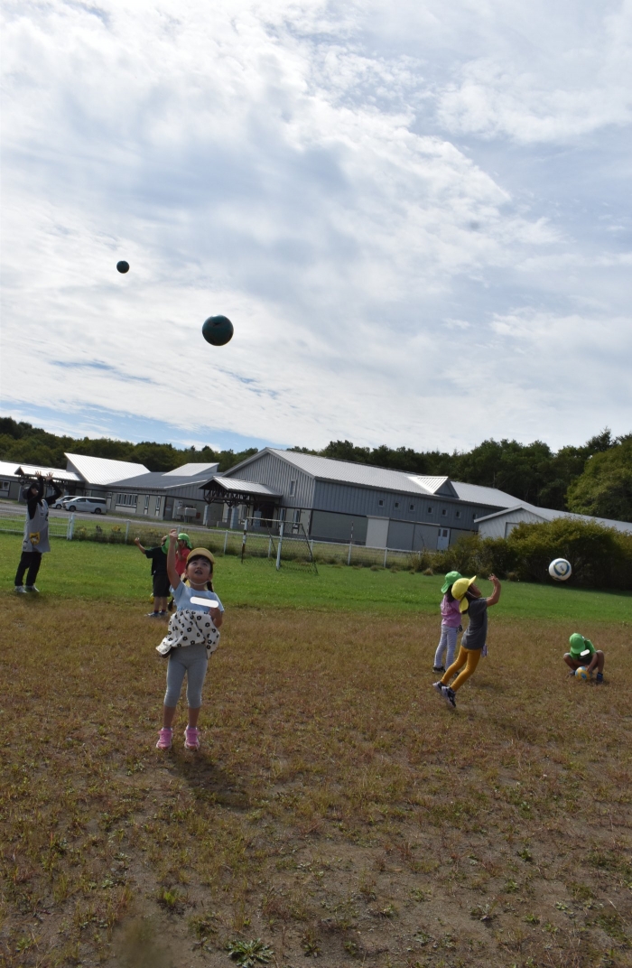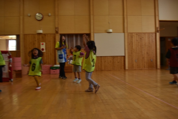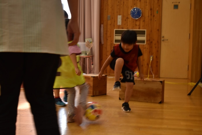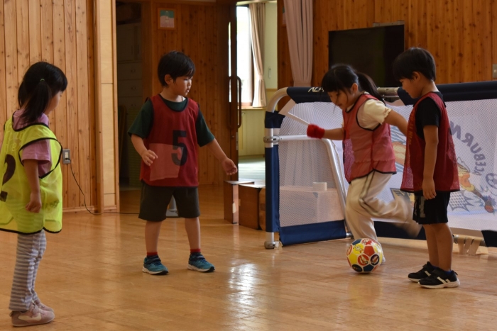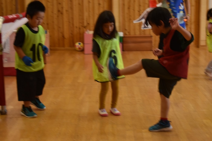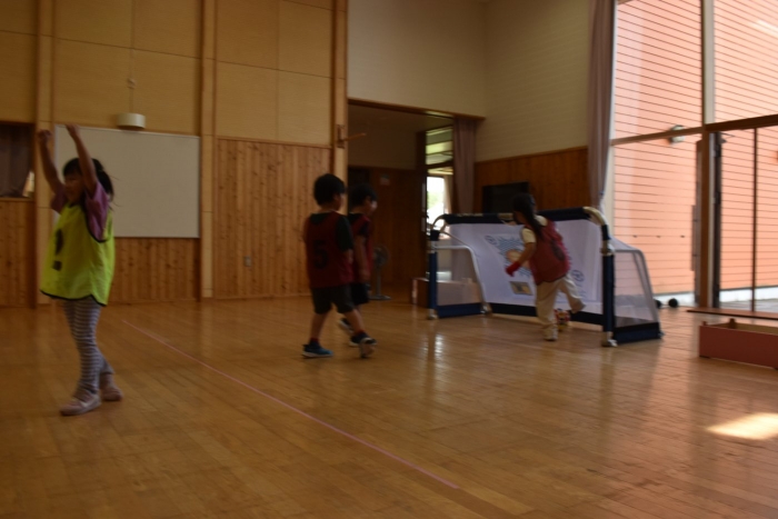 今日はこのあと3回目のサッカー教室があるのですが,朝からもうサッカーが始まっていました。ビブスを着て気分はもうサッカー選手!チームの仲間も,より見分けやすくなったみたいですね。風邪の症状等で欠席するお友達が多く,人数は少なかったのですが,にぎやかに朝の遊びは行われていました。そのほかにも,中学生にいただいた,縁日ごっこの遊びが今日も人気で,友達と楽しんでいる様子がありました。