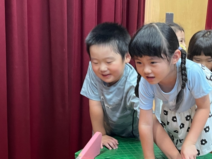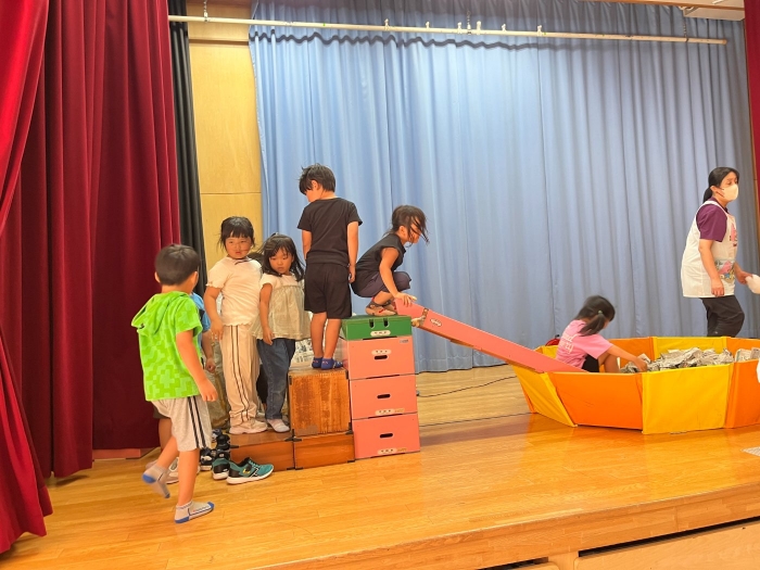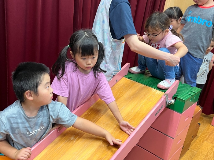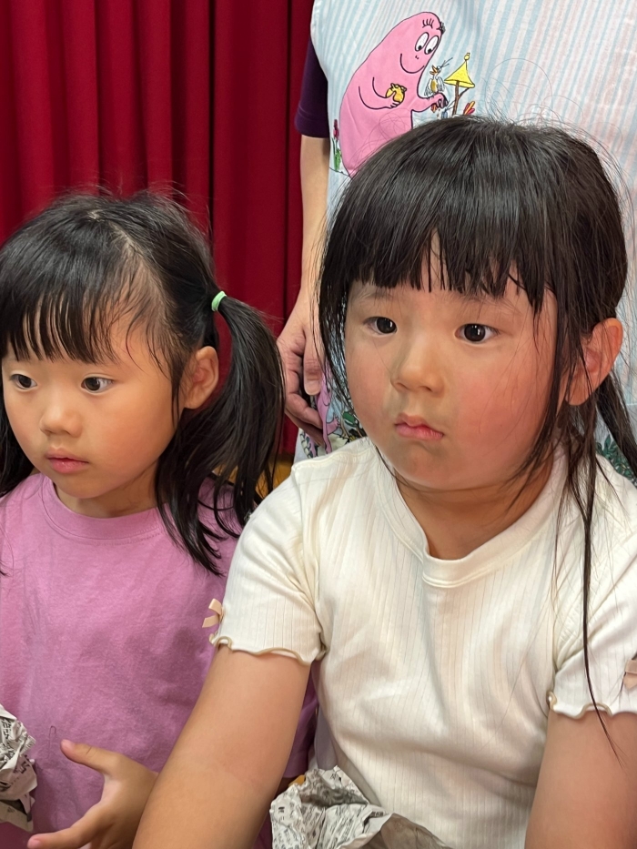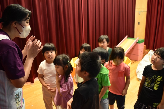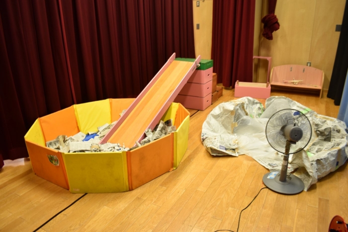 昨日,どっきり大作戦の準備をしていたさくら組さん。今日のお腹やすめの時間にうめ組さんともも組さんを招待することになり,朝はその仕込み?の作業に取り組んでいました。場所はステージの上に決まり,幕を閉めて,うめももさんに見られないよう,朝の会の間にこっそり準備していました。