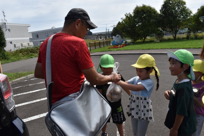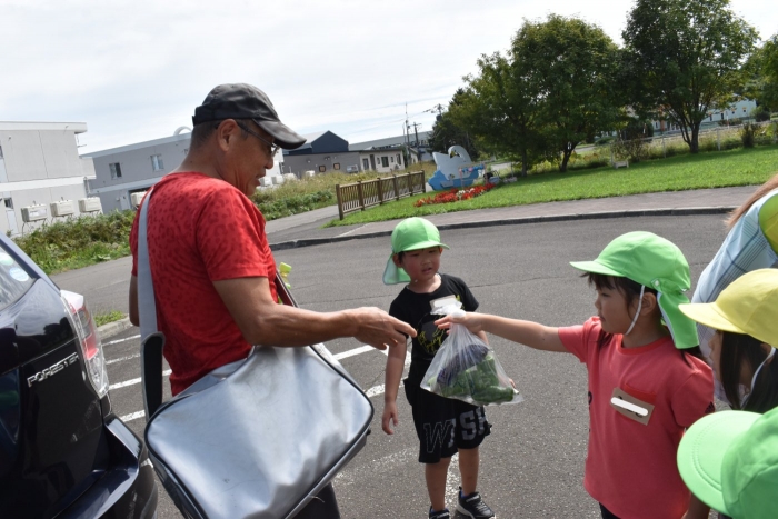 今日が最後のサッカー教室でした。講師の先生は,サッカー以外でも体を動かして遊ぶこと,体力をつけて健康な体をつくってほしいとお話をいただきました。お見送りの時には,お礼の気持ちとして,畑でとれた野菜を差し上げました。