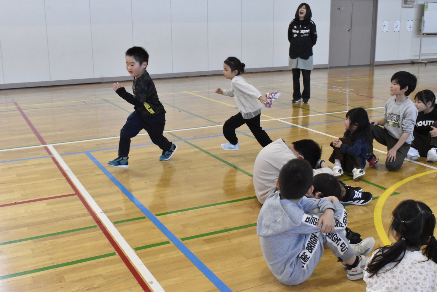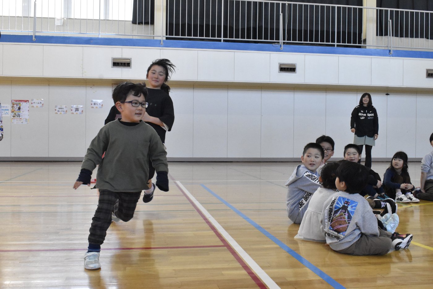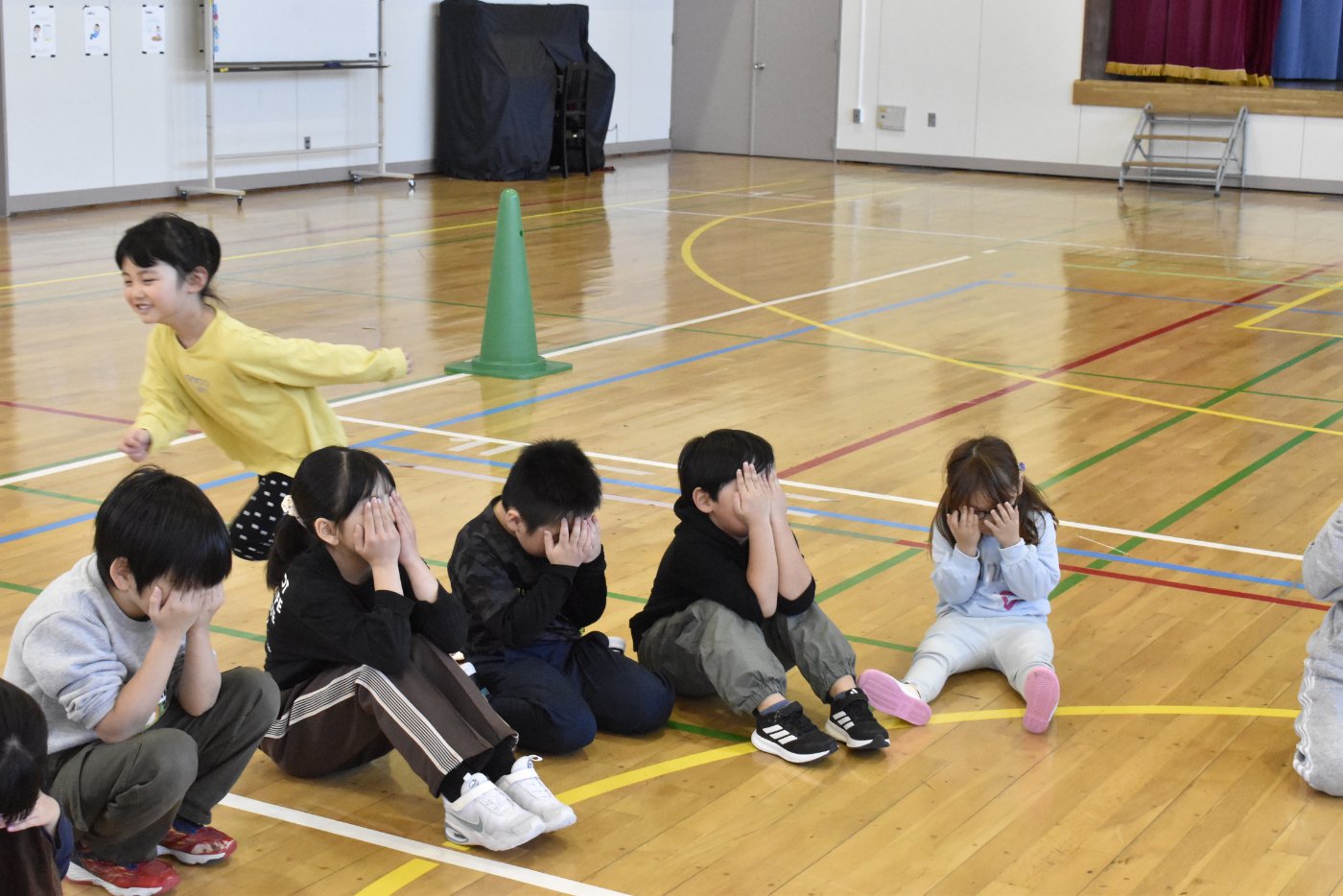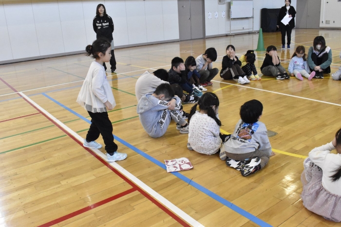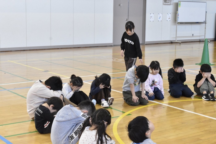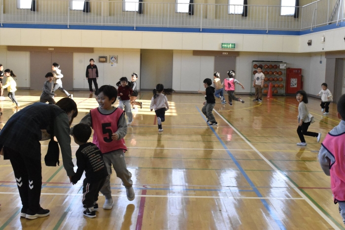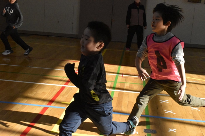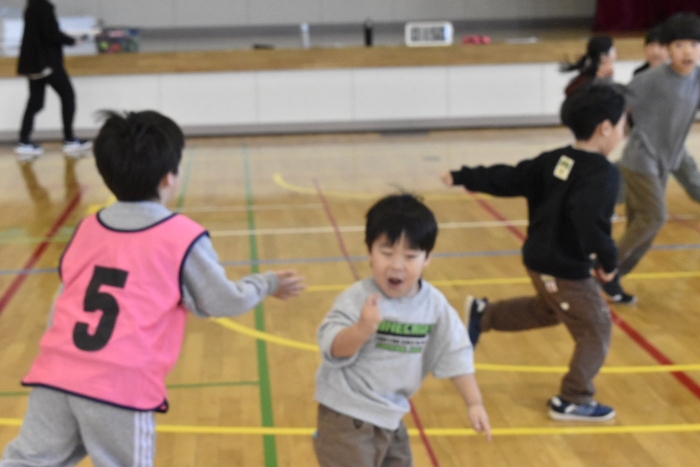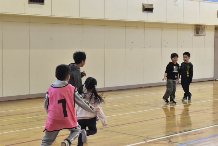 2年生が氷鬼のルール説明をしてくれました。ビブスを着た2年生が鬼です。広い体育館で思い切り走ると楽しいですね。