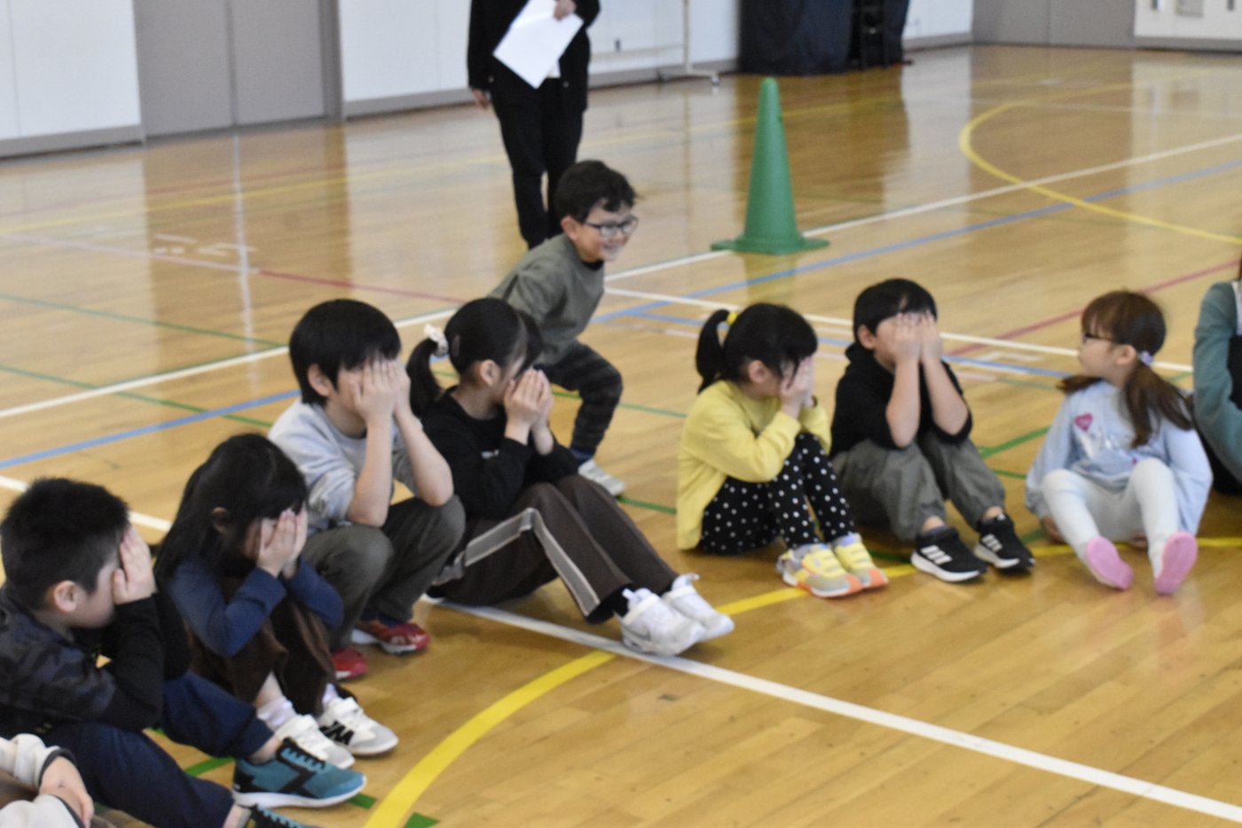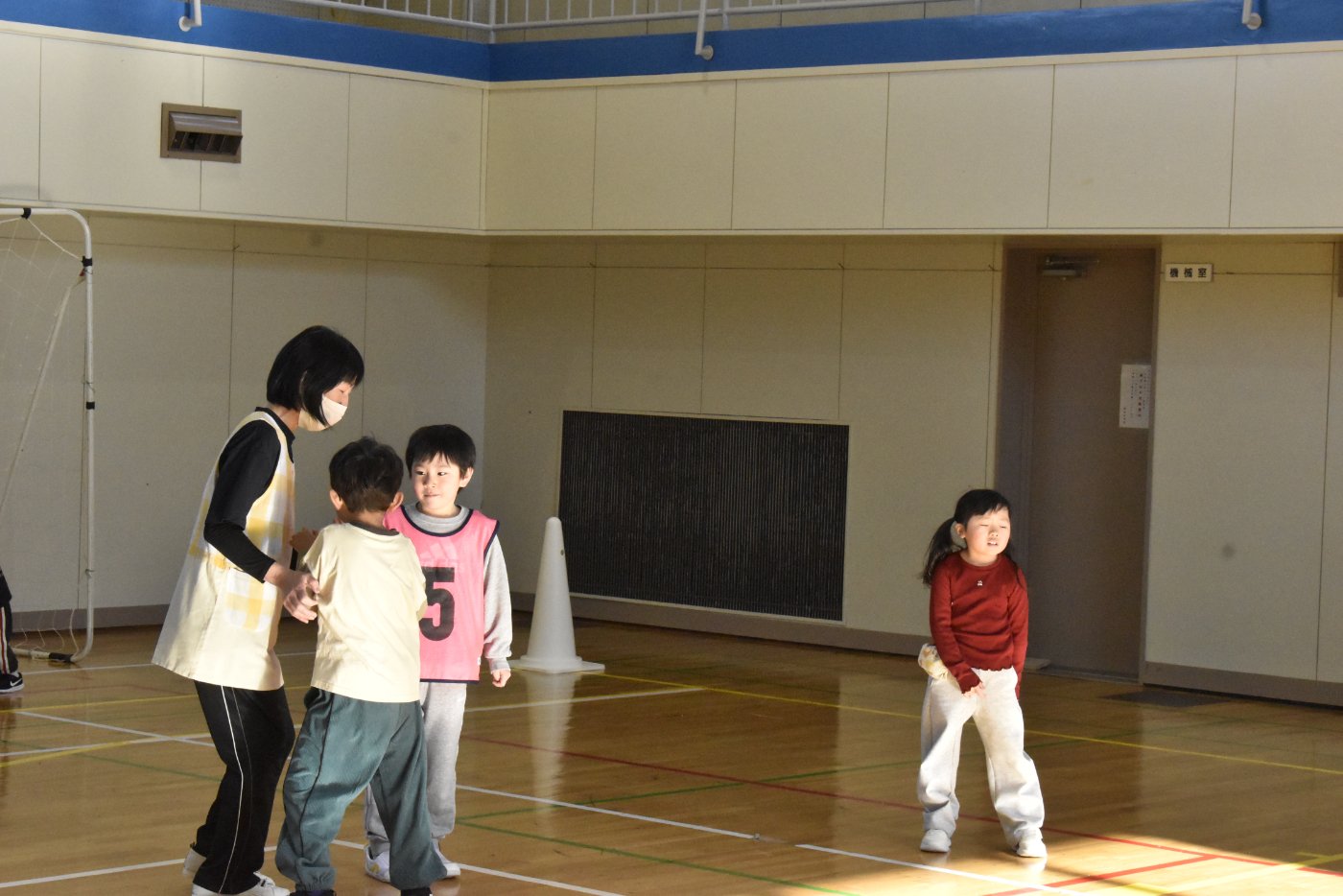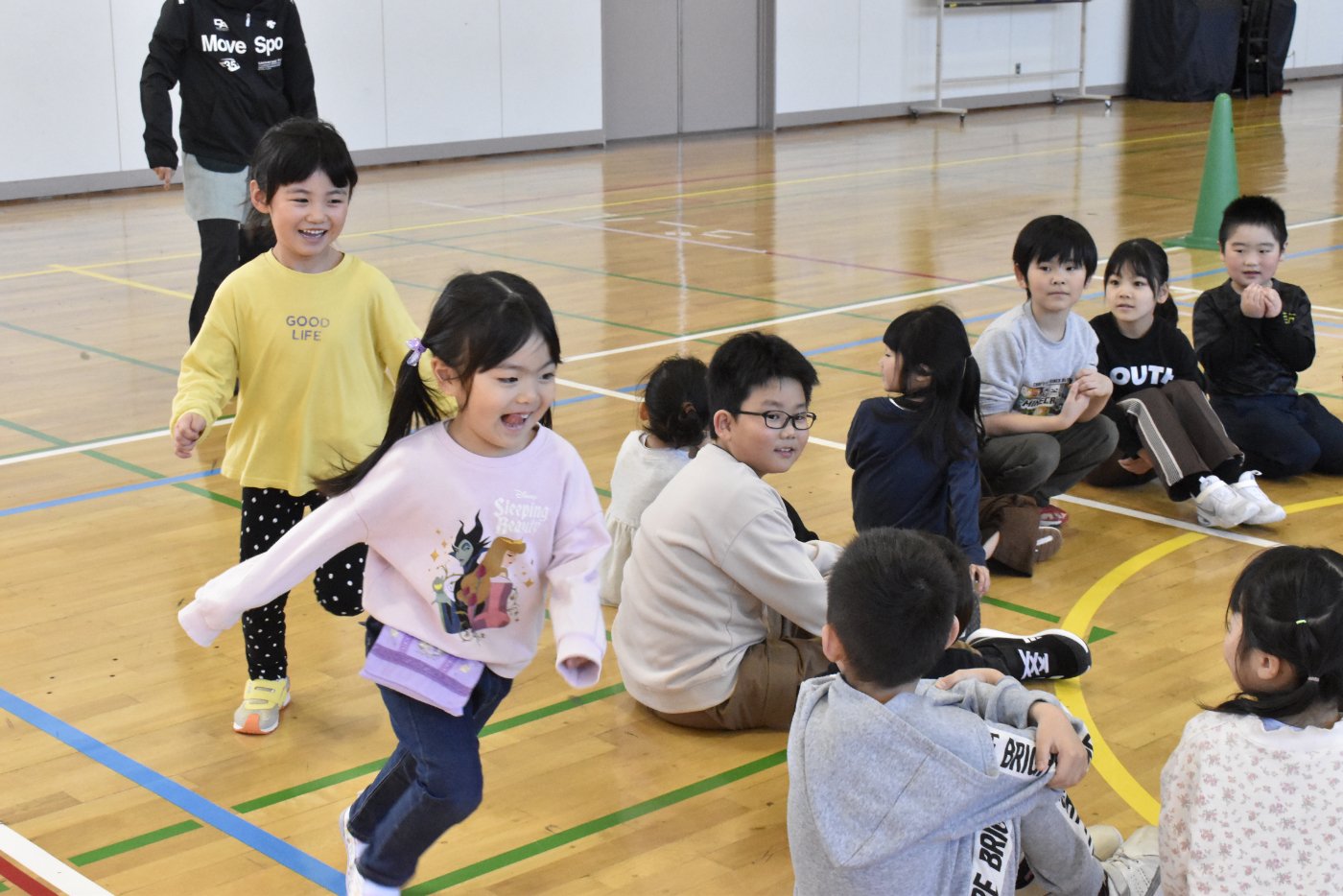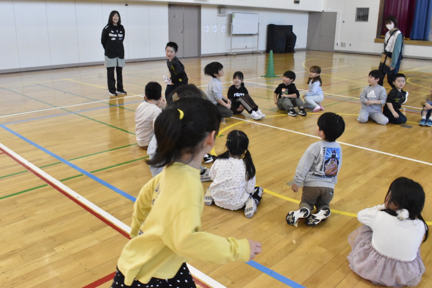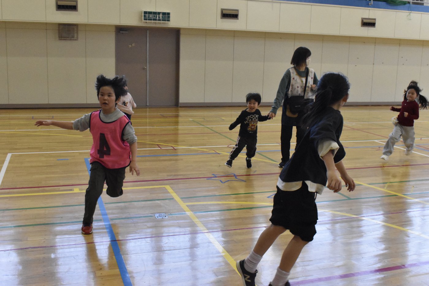 2年生が氷鬼のルール説明をしてくれました。ビブスを着た2年生が鬼です。広い体育館で思い切り走ると楽しいですね。