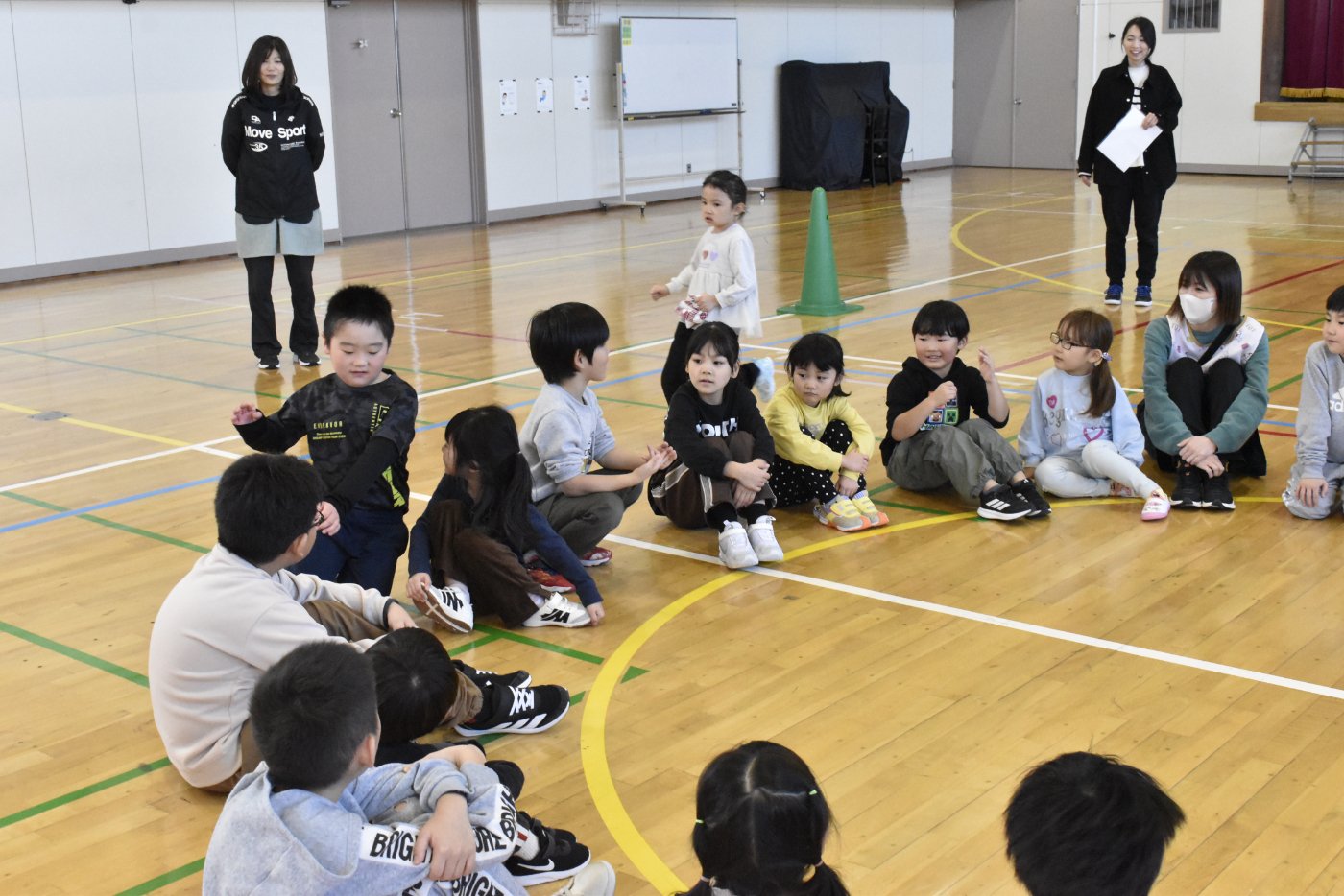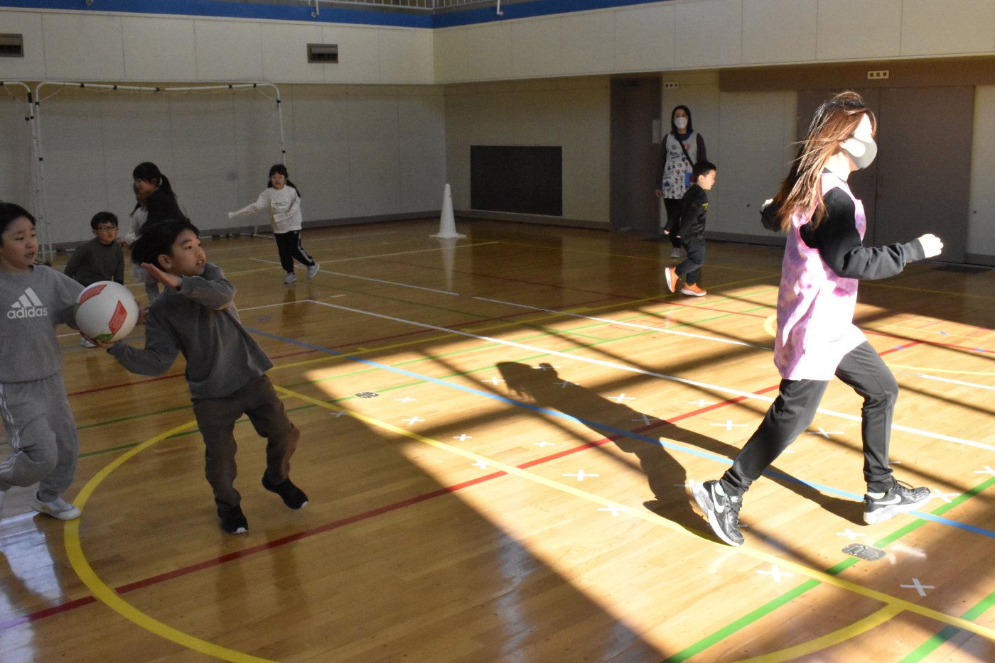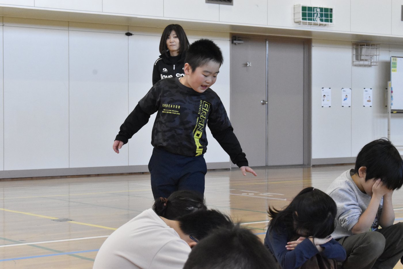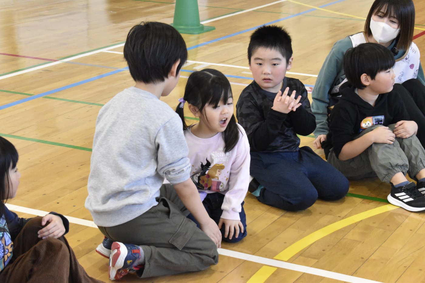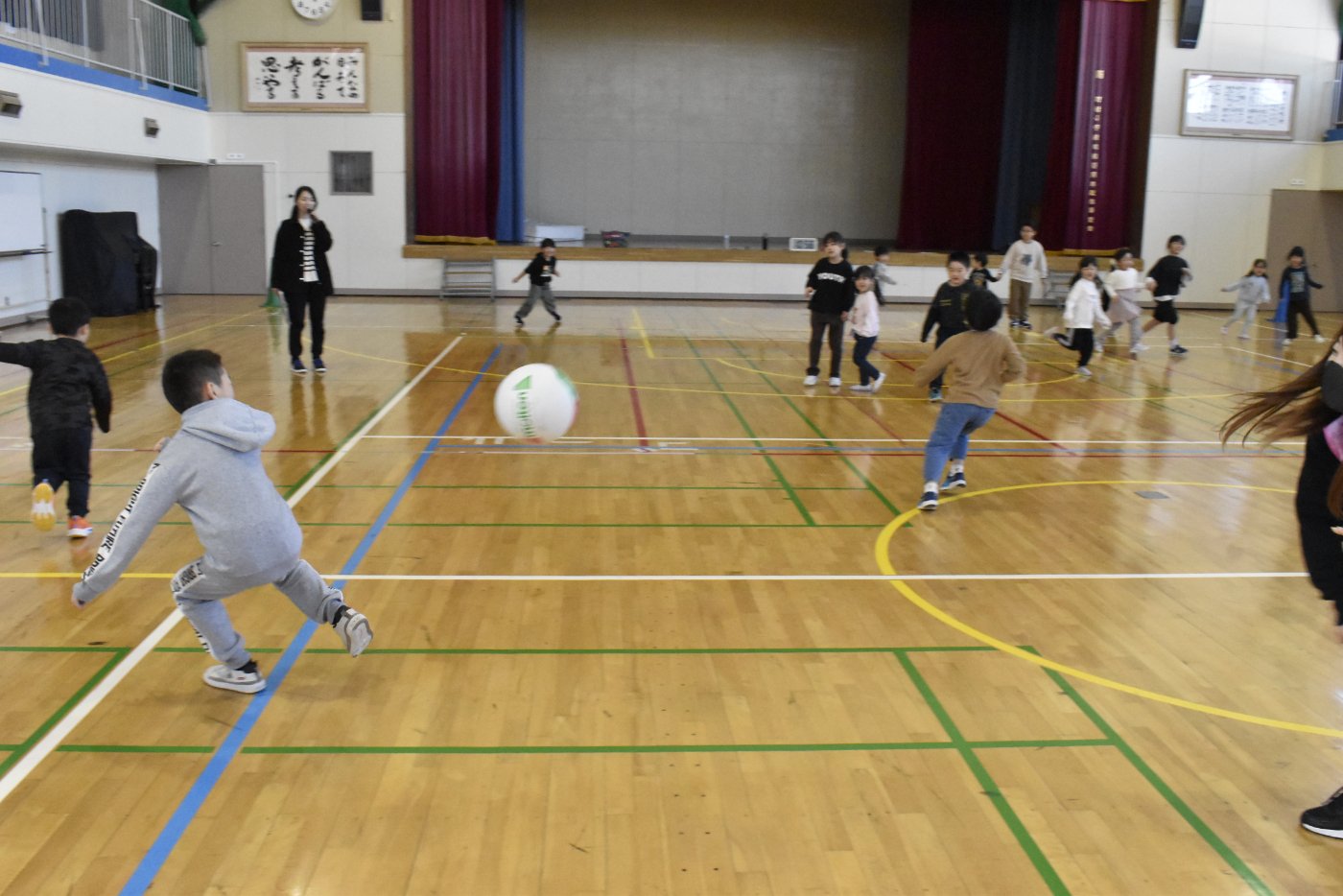 2年生が氷鬼のルール説明をしてくれました。ビブスを着た2年生が鬼です。広い体育館で思い切り走ると楽しいですね。