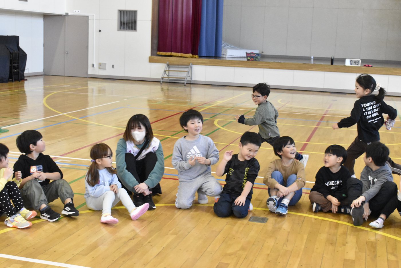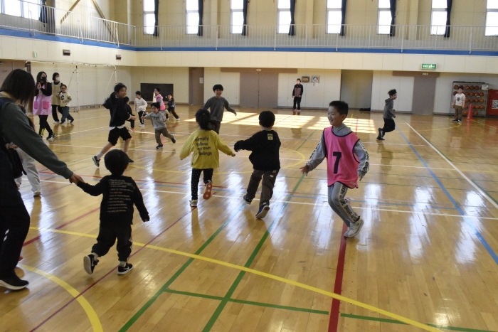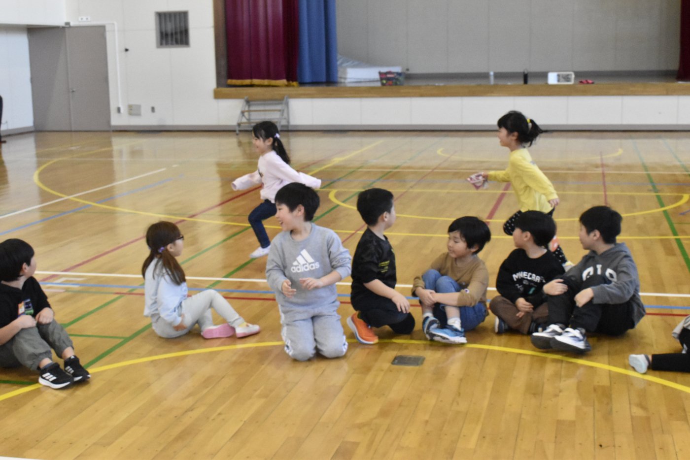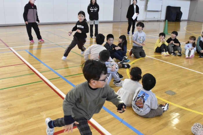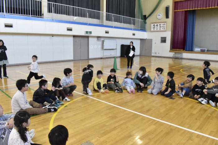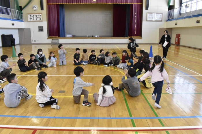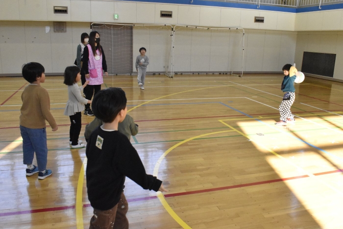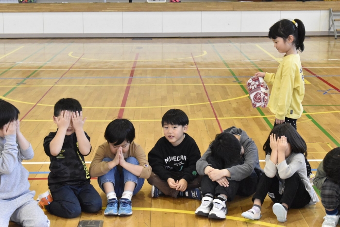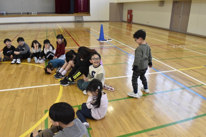 ハンカチ落としは,うめさんやももさんは,経験がなかったのですが,2年生がルールも教えてくれました。みんなで大きな輪を作って座ります。自分の後ろにハンカチが落とされたら…と,ちょっとドキドキする遊びですね。勘違いして,オーバーランしたりすることもありましたが,新しい遊びを経験して新鮮だったみたいです。