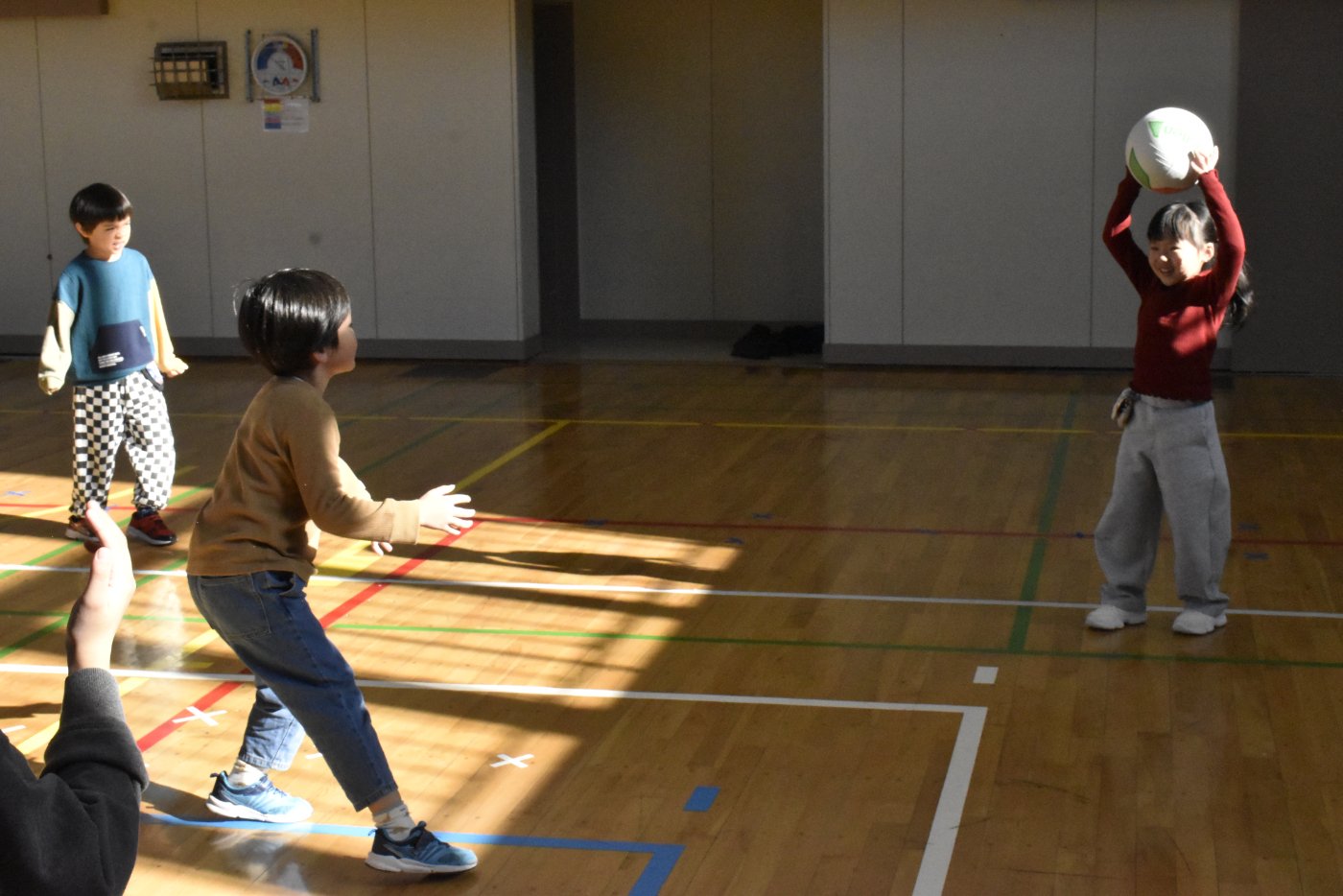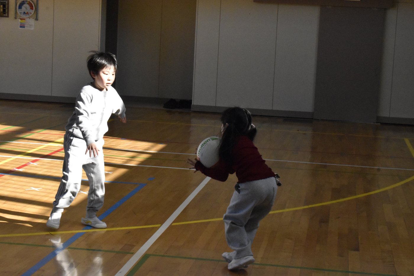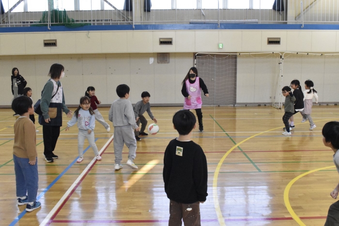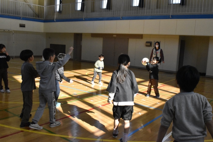 最後はみんな大好きな馴染みのある遊び「かたき」を2年生と一緒に楽しみました。2年生の投げるボールが速くて,さすが小学生!迫力も感じられました。当てられてしまったお友達を助けるために,一致団結して2年生が幼稚園の先生をねらう…という場面もあり,盛り上がりました(*^-^*)