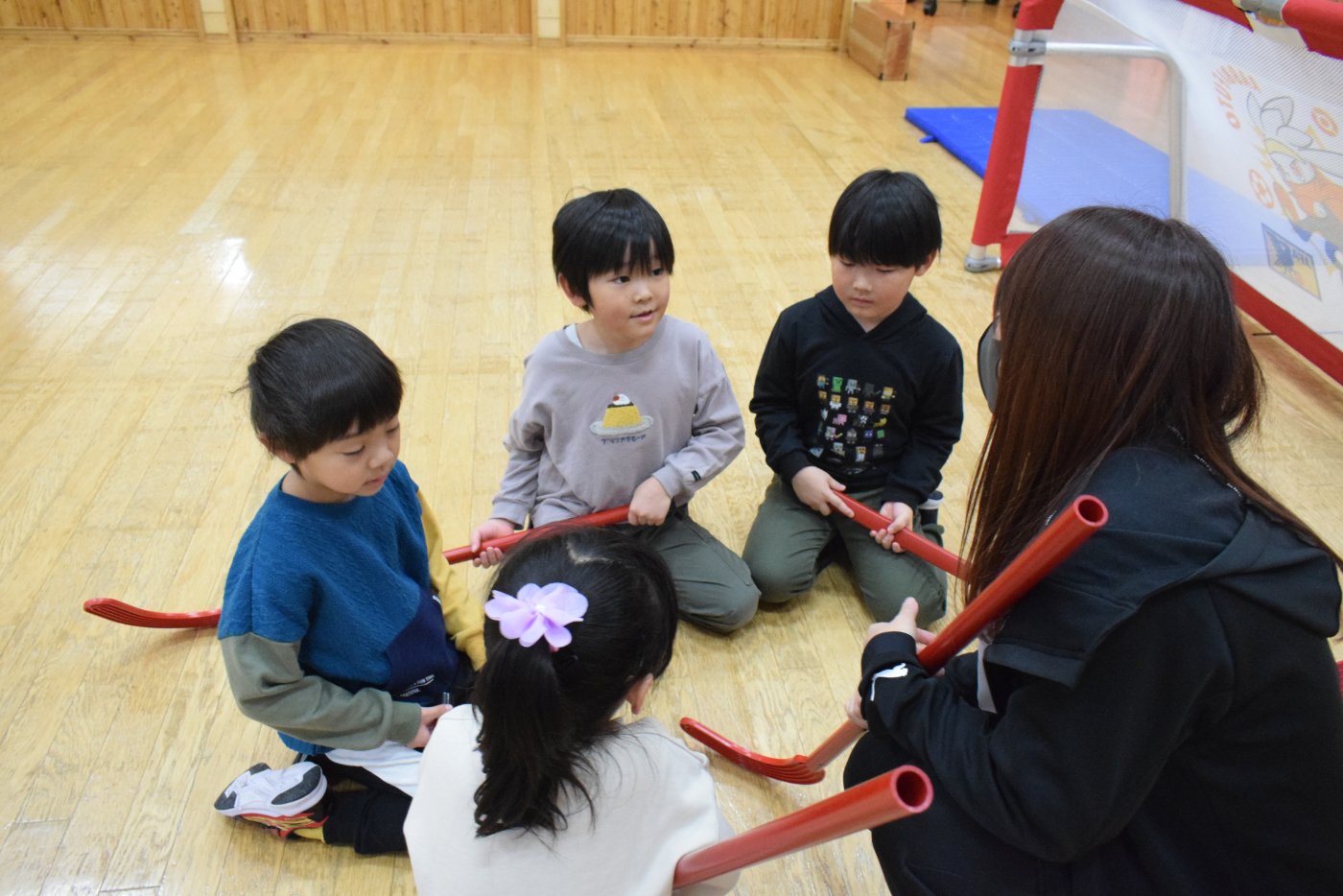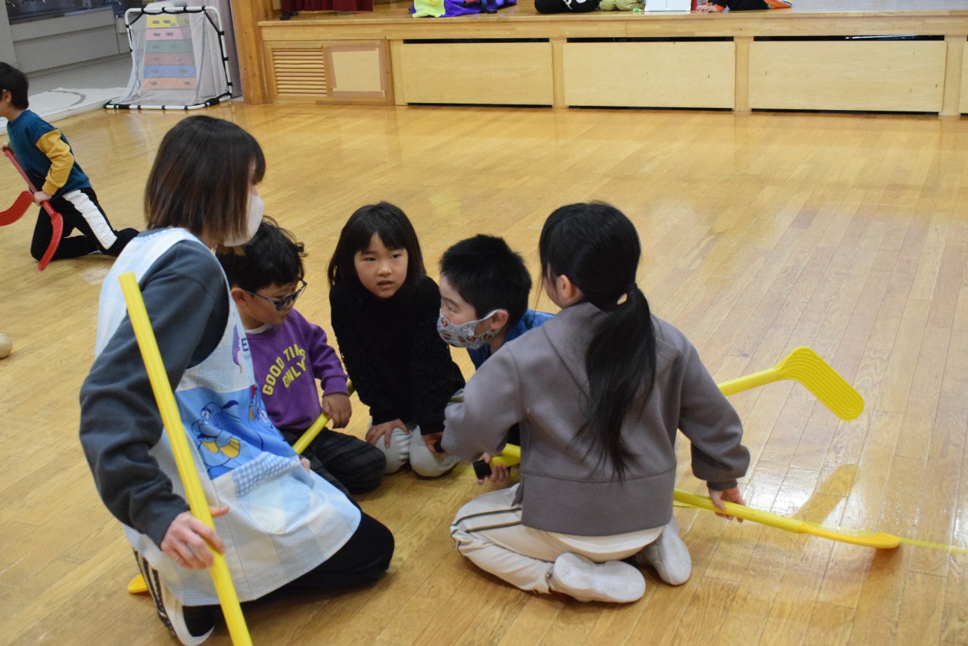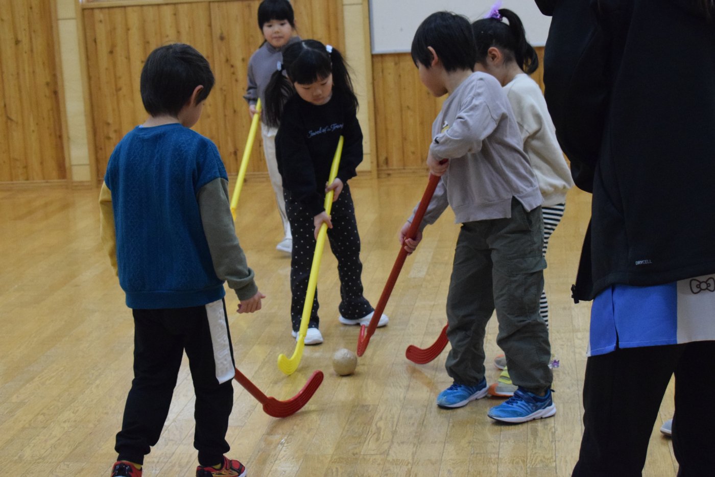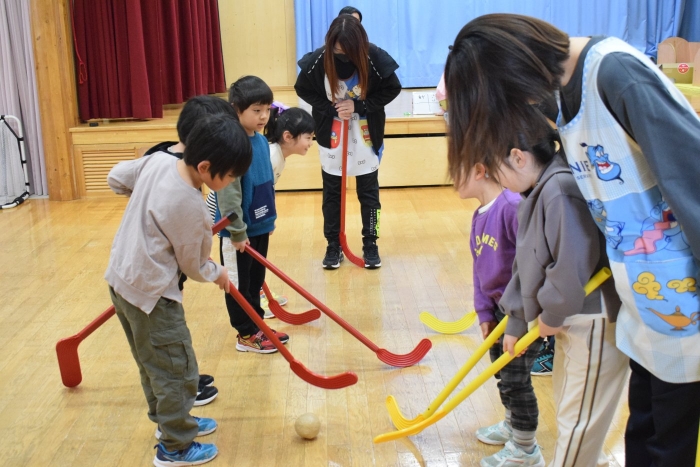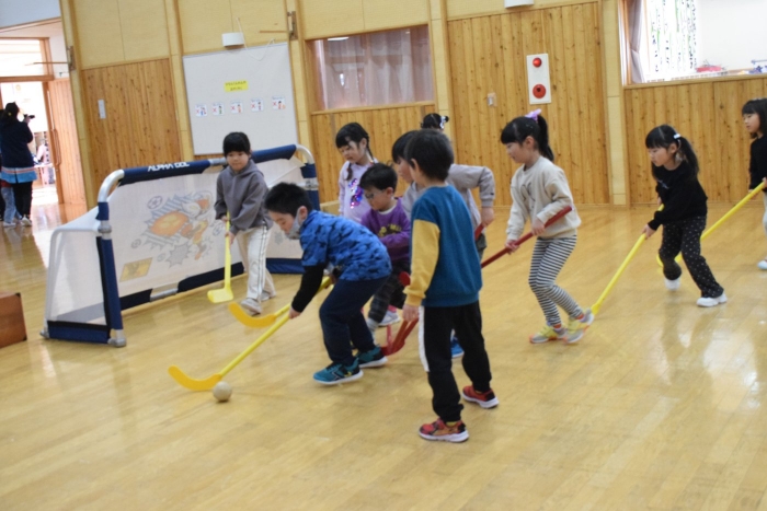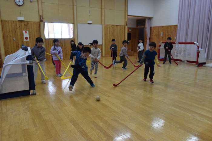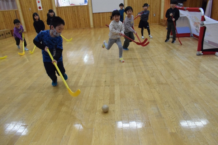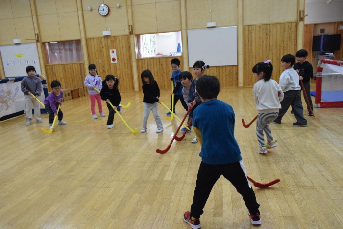 今朝もホッケーが人気で,人数が揃うとすぐに試合が始まりました。遊びこんでいくうちに,プレーする楽しさがだんだん膨らんでいくようです。まずは並んで,挨拶をします。チームごとに作戦会議も行い,「今日は負けないぞ~!」と気合も十分なようです!ステージ上では審判役のお友達が試合を見届けます。
