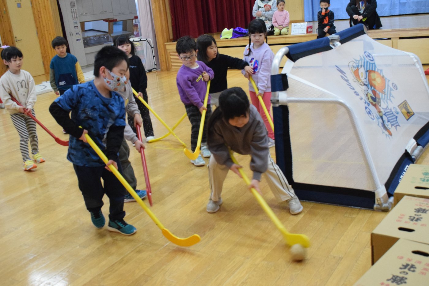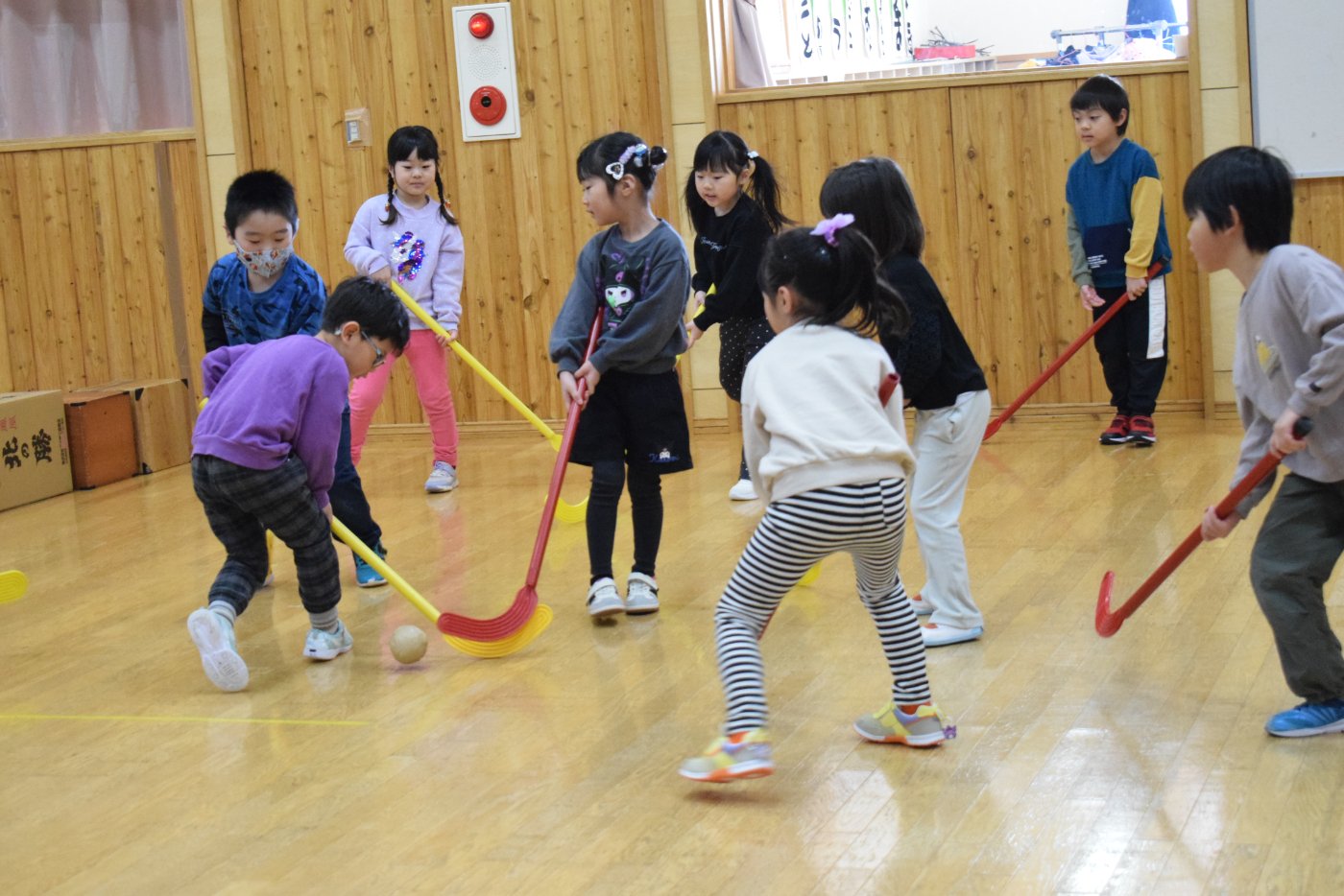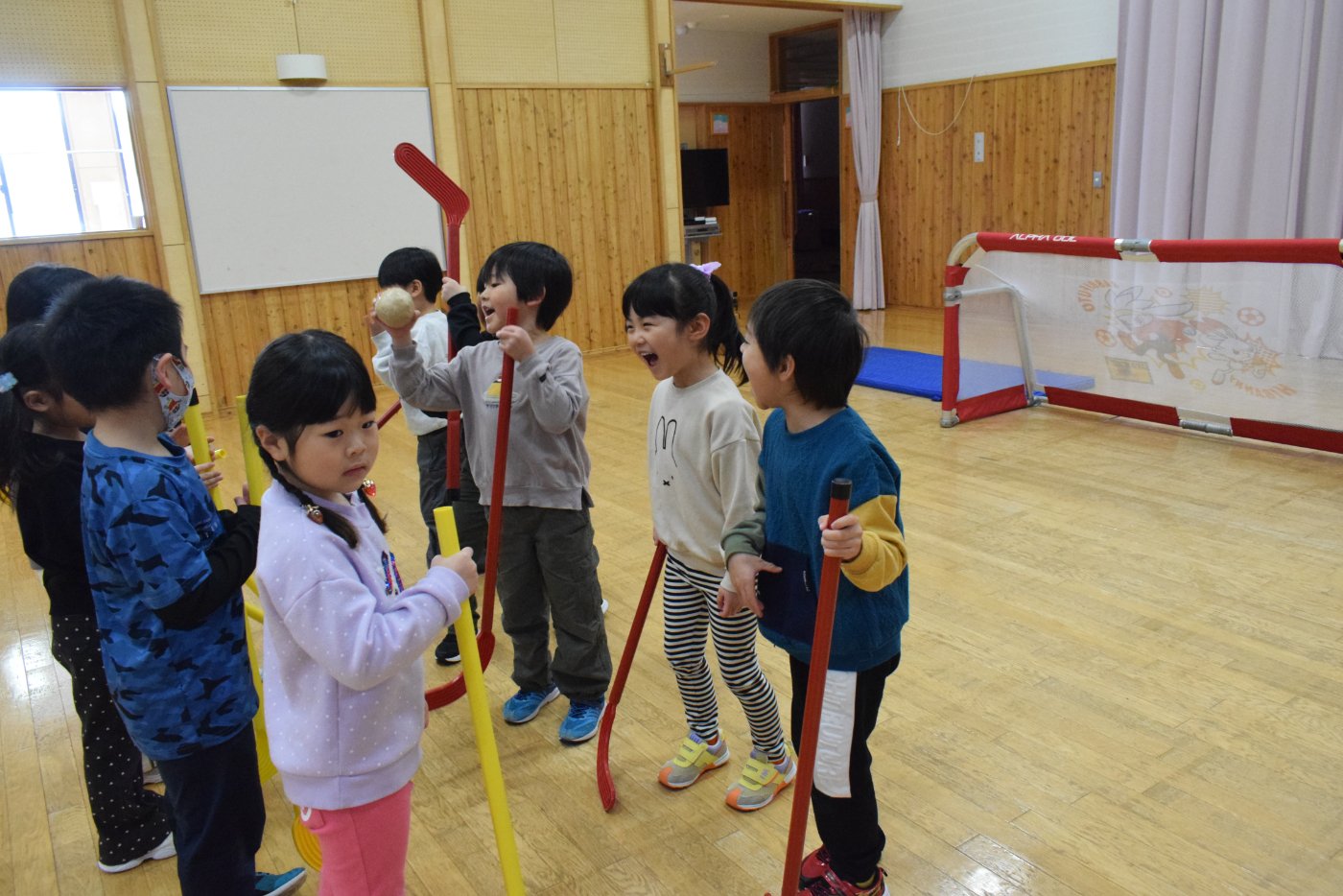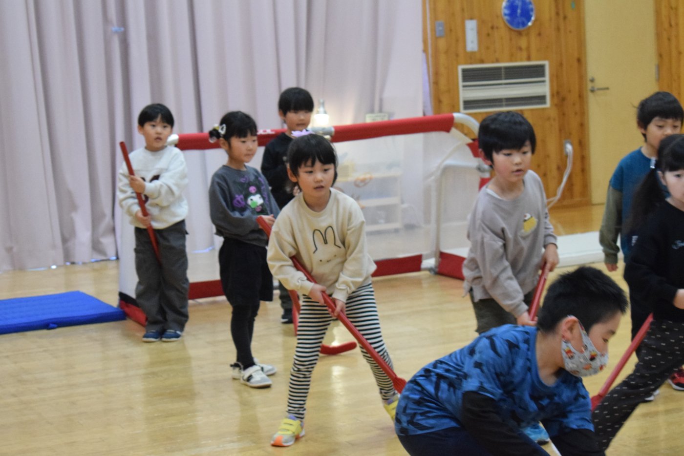今朝もホッケーが人気で,人数が揃うとすぐに試合が始まりました。遊びこんでいくうちに,プレーする楽しさがだんだん膨らんでいくようです。まずは並んで,挨拶をします。チームごとに作戦会議も行い,「今日は負けないぞ~!」と気合も十分なようです!ステージ上では審判役のお友達が試合を見届けます。
