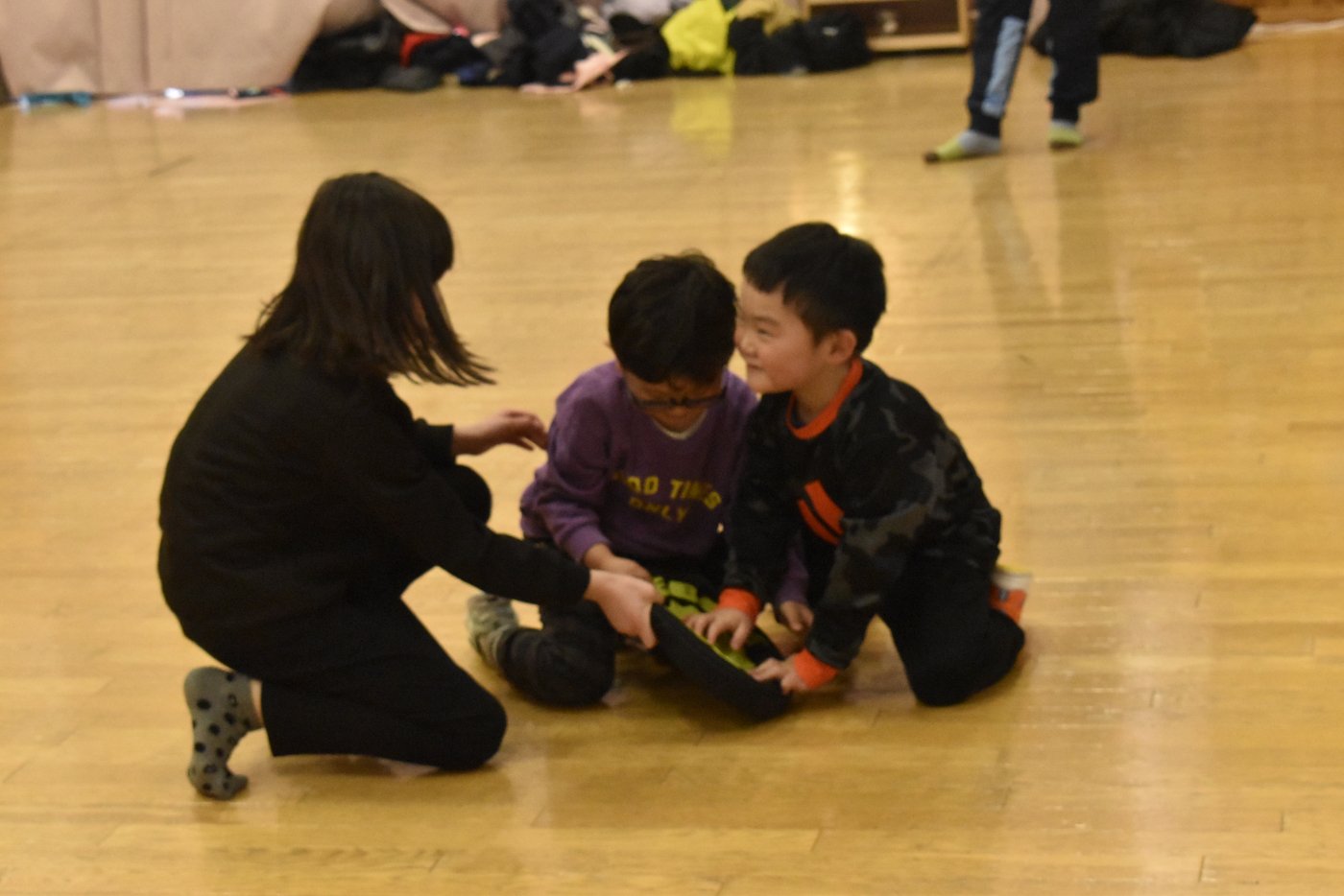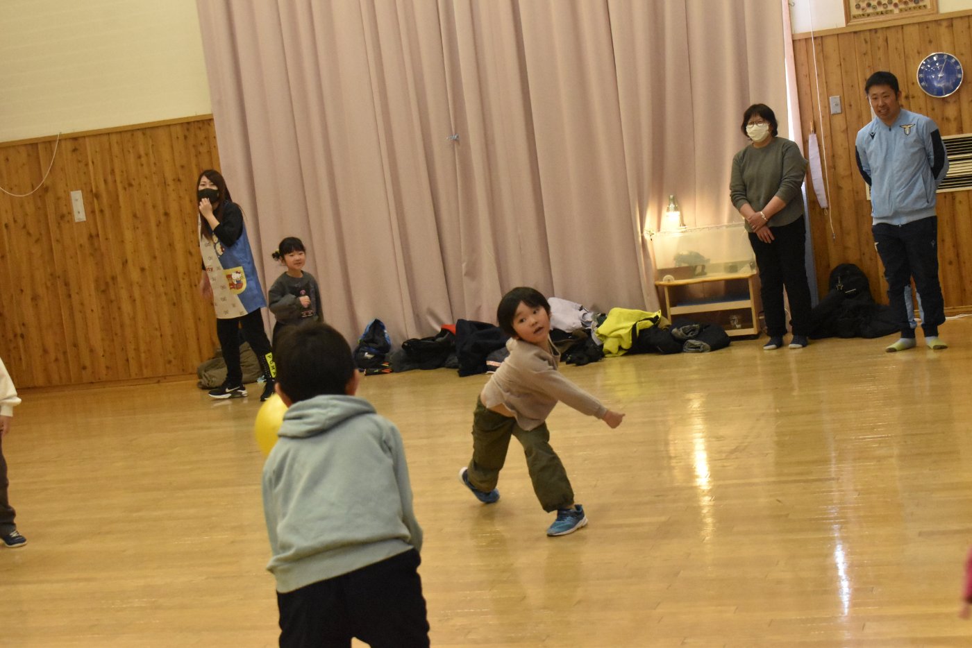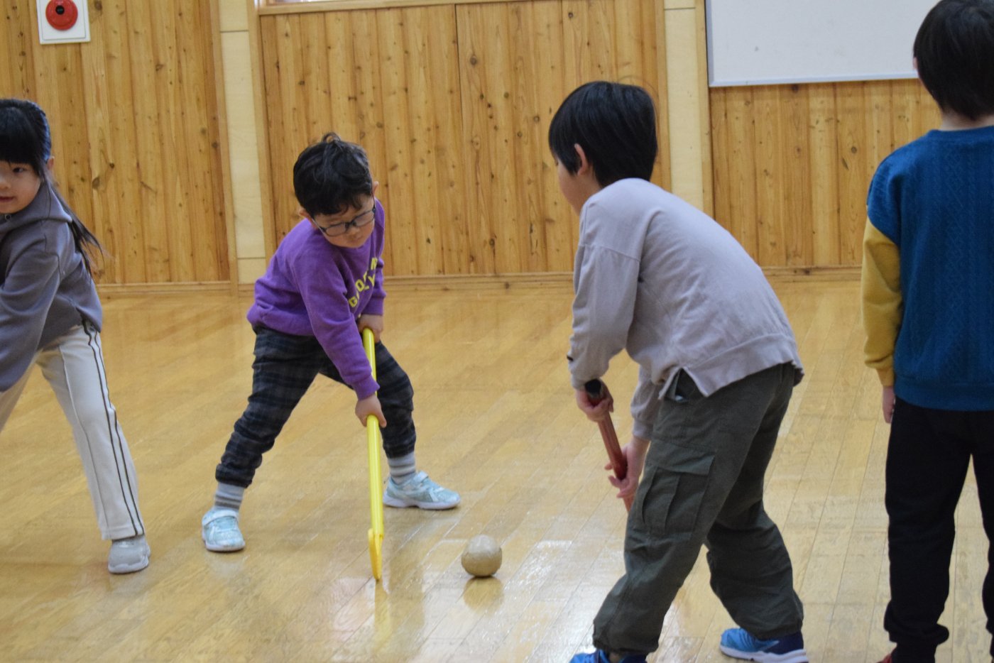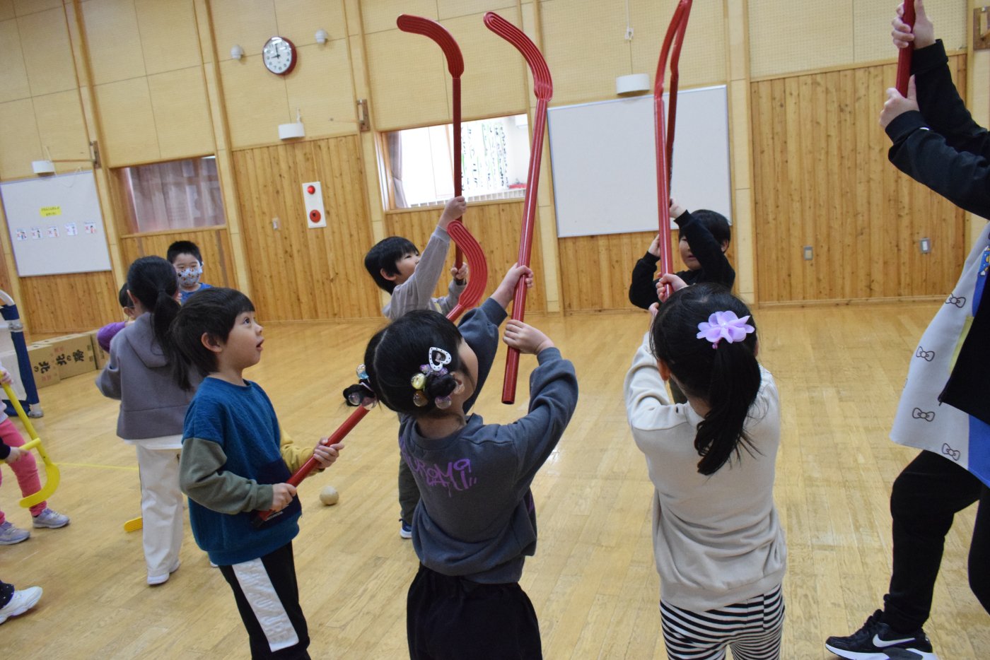 今朝もホッケーが人気で,人数が揃うとすぐに試合が始まりました。遊びこんでいくうちに,プレーする楽しさがだんだん膨らんでいくようです。まずは並んで,挨拶をします。チームごとに作戦会議も行い,「今日は負けないぞ~!」と気合も十分なようです!ステージ上では審判役のお友達が試合を見届けます。
