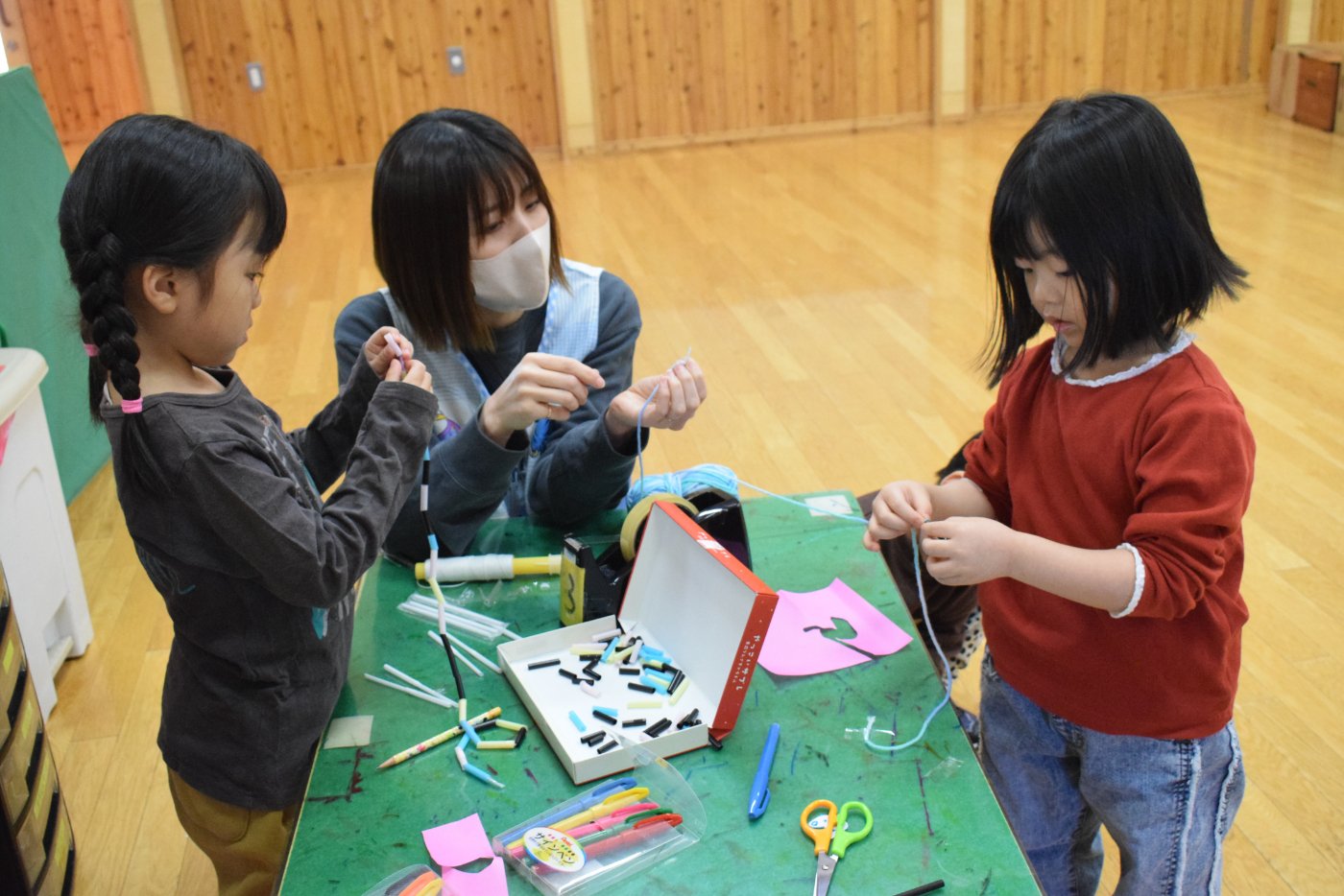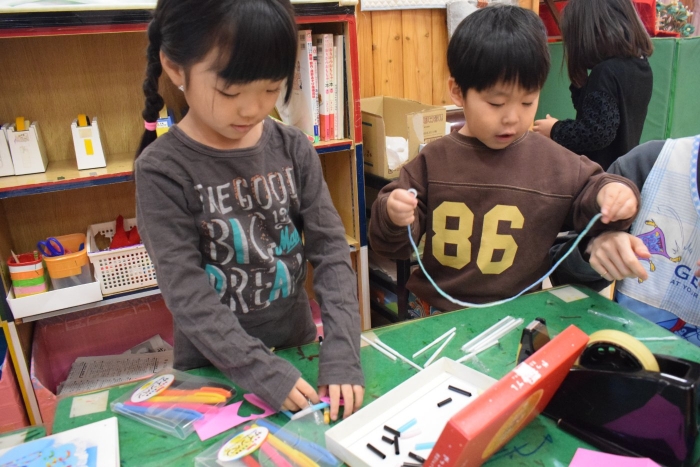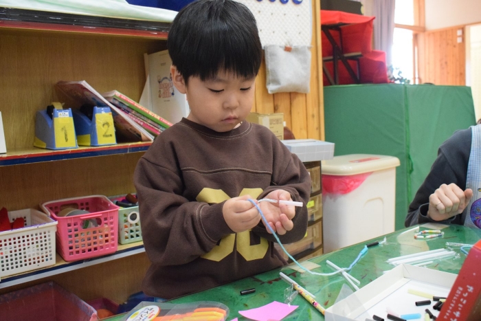 製作コーナーではネックレス作りに集中するお友達。妹にネックレスをあげたい!と取り組むお友達もいました。