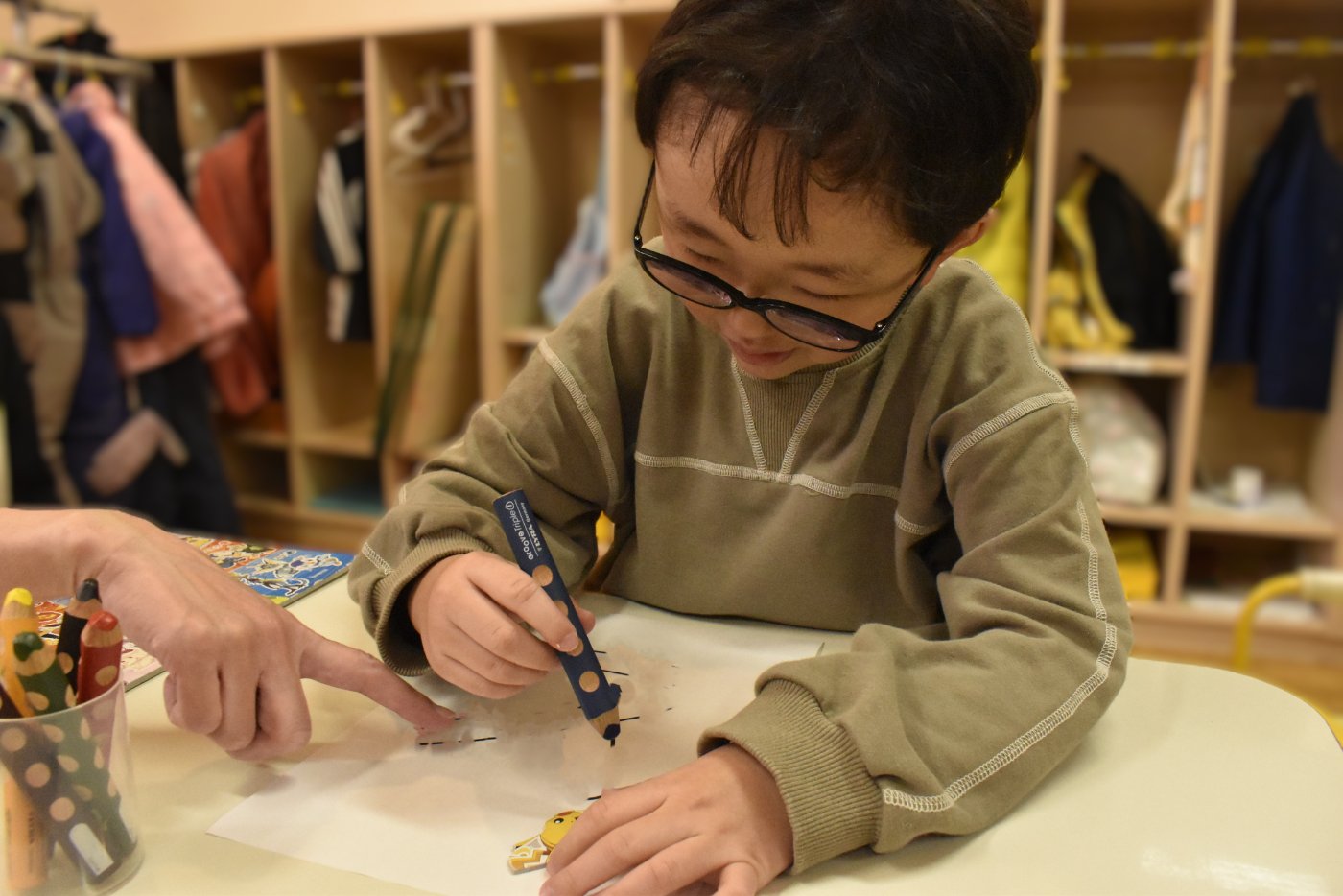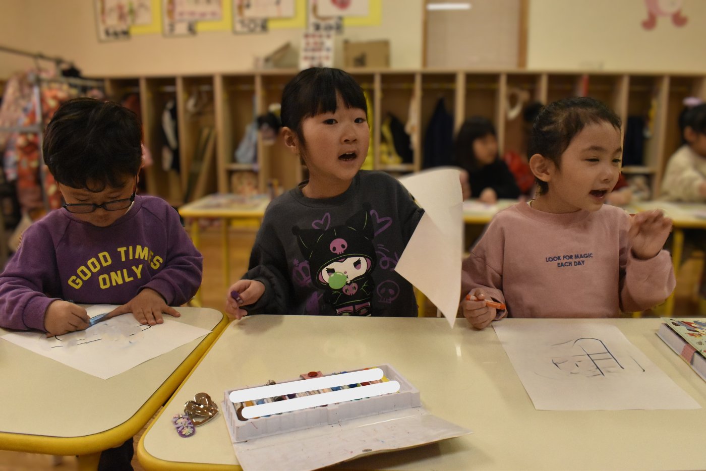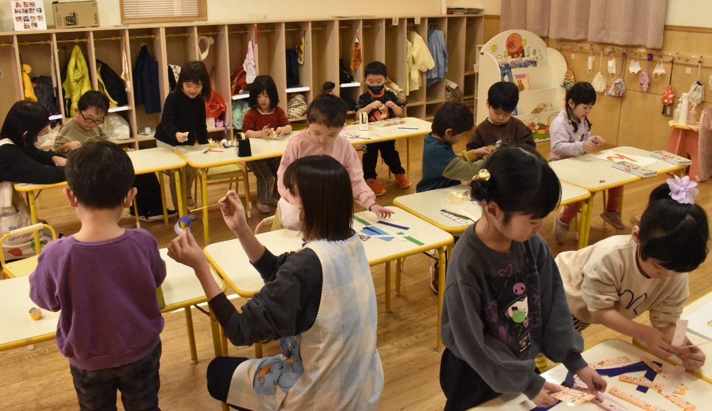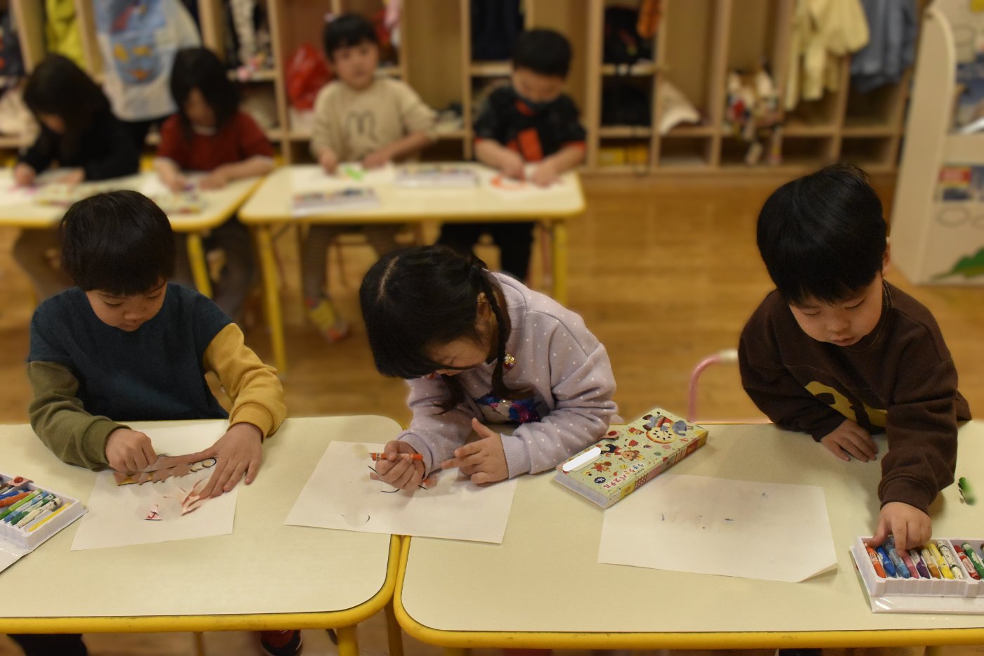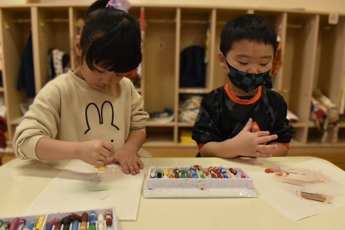 もも組さんのお部屋に,今日もうめ組さんがやってきて,昨日と同じくさくら組さんには秘密の作業のようです。クレヨンを出して,みんなで色塗りをしたり,折り紙で何やら作ったり・・・と,楽し気に取り組んでいる様子です。