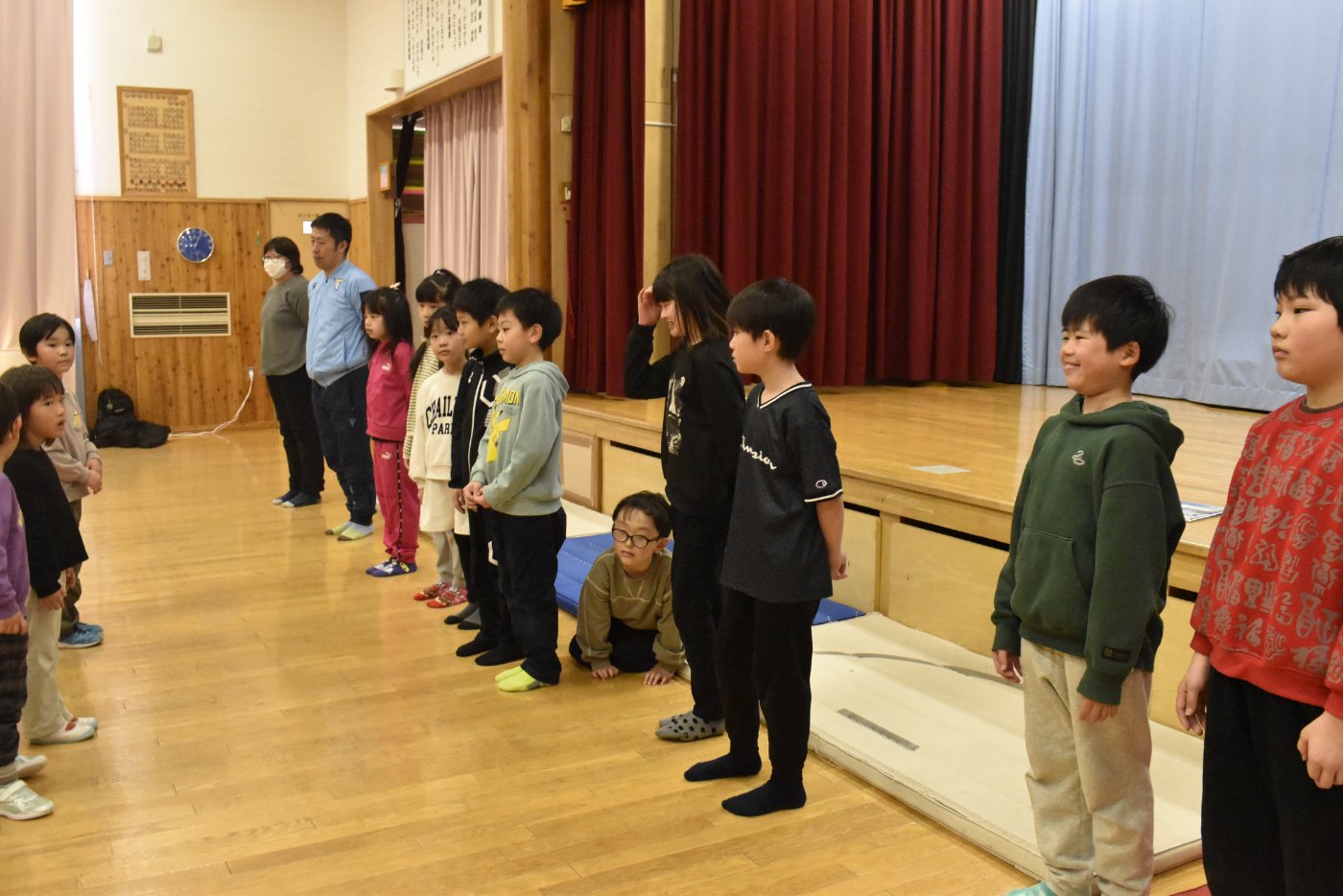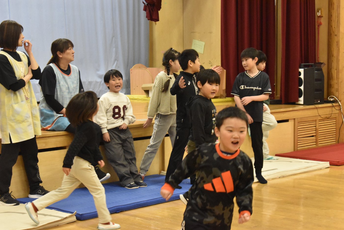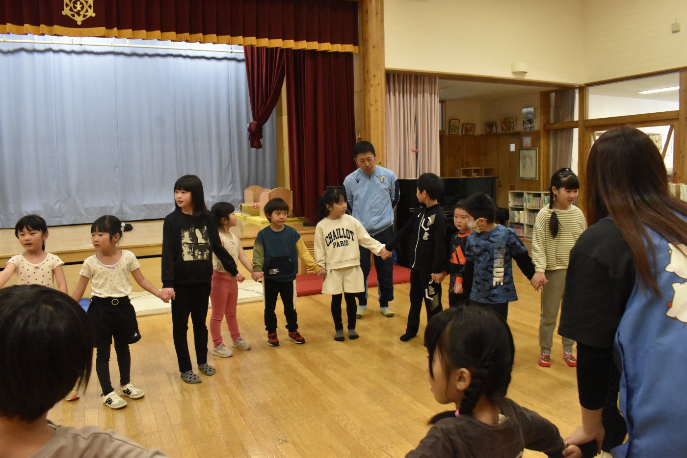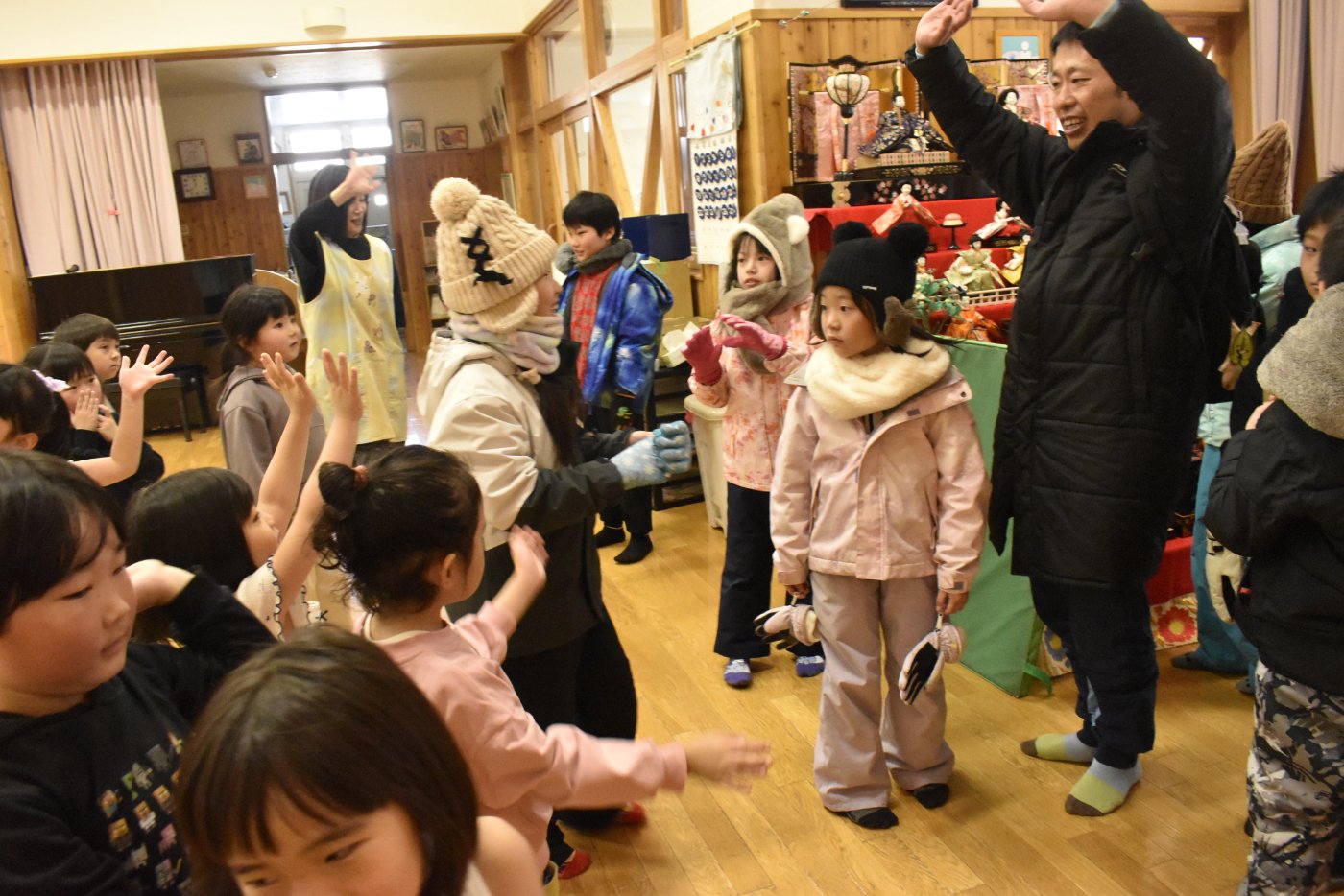 続いても,園児からのリクエストで「むっくりくまさん」をみんなでやることになりました。3年生ともなると,幼稚園時代にやっていたむっくりくまさんの歌の記憶は薄れていたようですが,園児たちに合わせて歌ってくれて,振り付けも照れずにやってくれる3年生の姿が,かわいいね~と,先生方も目を細めていました(^^)