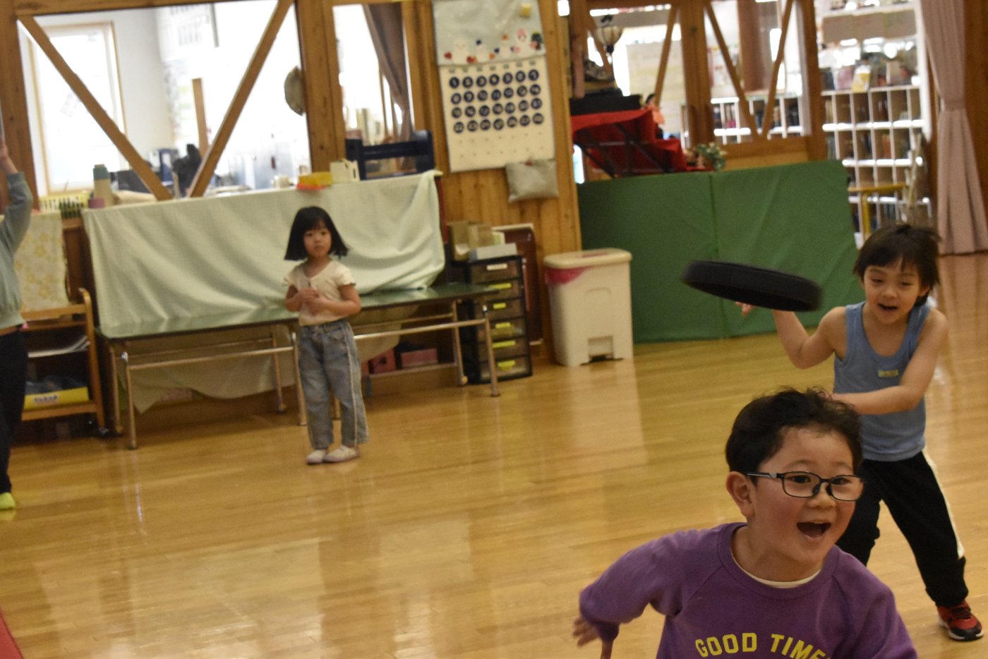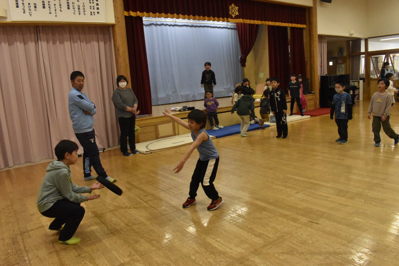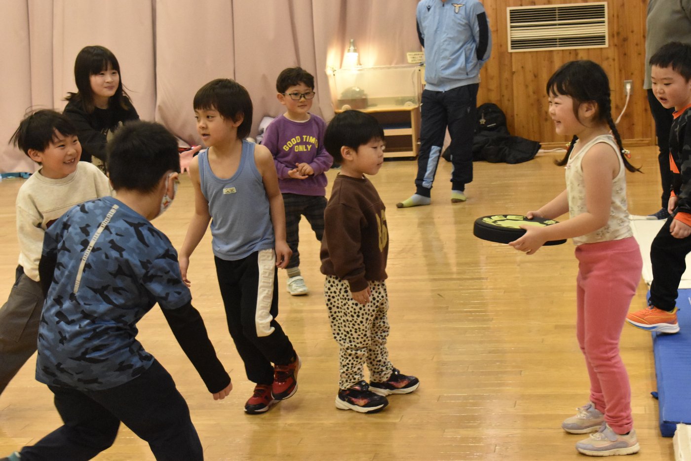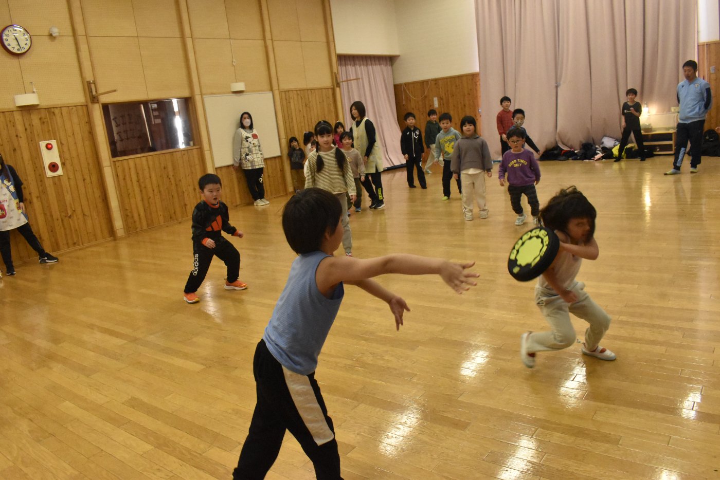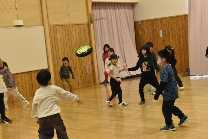 また遊びにきてね~!と,これでお別れかと思いましたが「まだ少し,時間あるんだよな~」と3年生のお友達の一言で,「まだ遊べるの!?」という雰囲気になってきて,さらに延長して一緒に遊べることになりました(笑)この後はドッチビーをして遊びました。もう,みんな汗だくでした(^-^;
