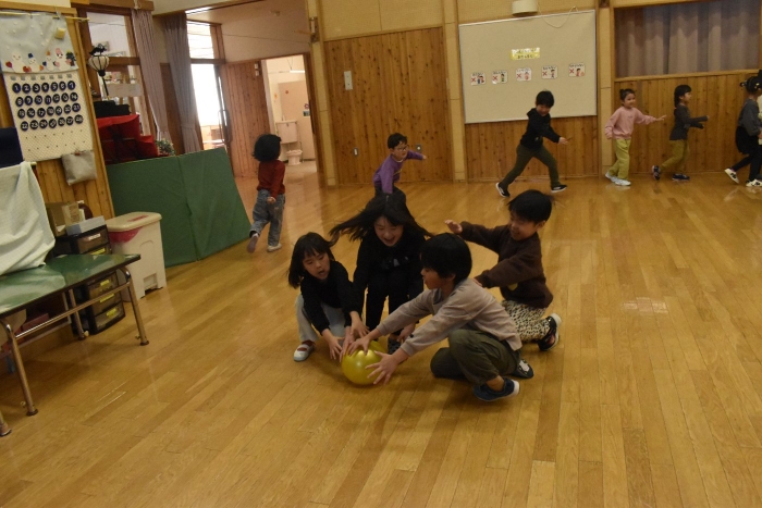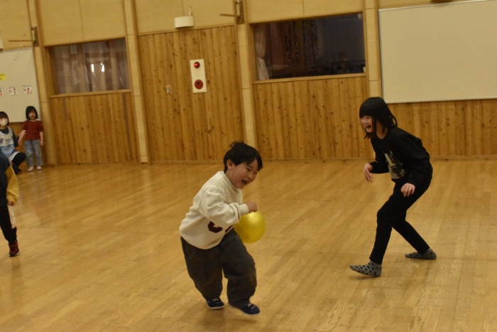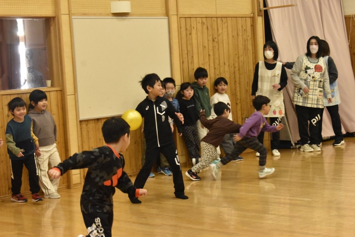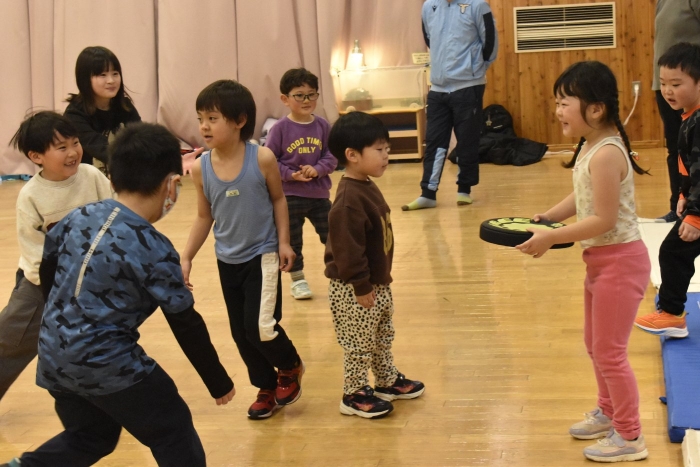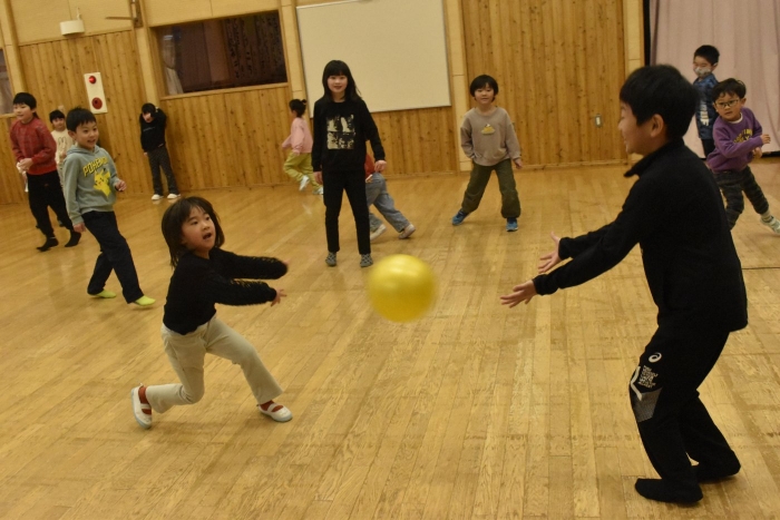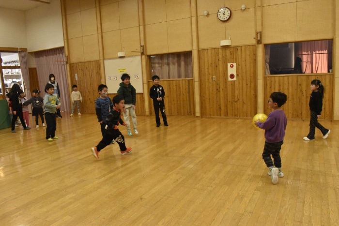 発表後,子どもたちのリクエストで「かたきうち」をしてみんなで遊ぶことになりました。普段より,人数も多くなり,相手が3年生となると,子どもたちも気合がだいぶ入ったようです。3年生は,園児には手加減して投げたり,パスしてボールを譲ってくれたりなど,優しいお兄さんお姉さんでした。