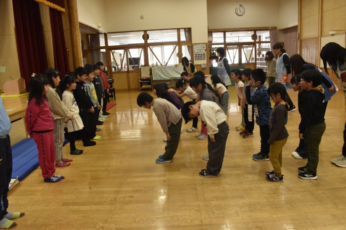 3年生が帰る時間となりました。みんなで別れを惜しみつつ,ご挨拶。今日はありがとうございました!