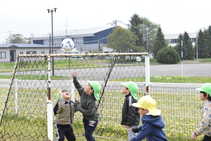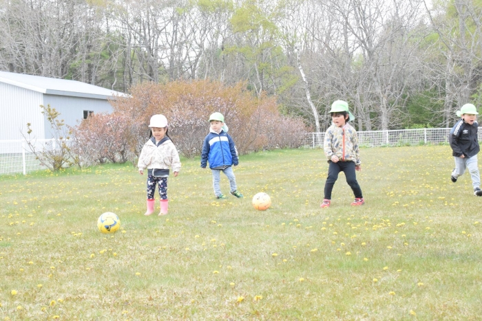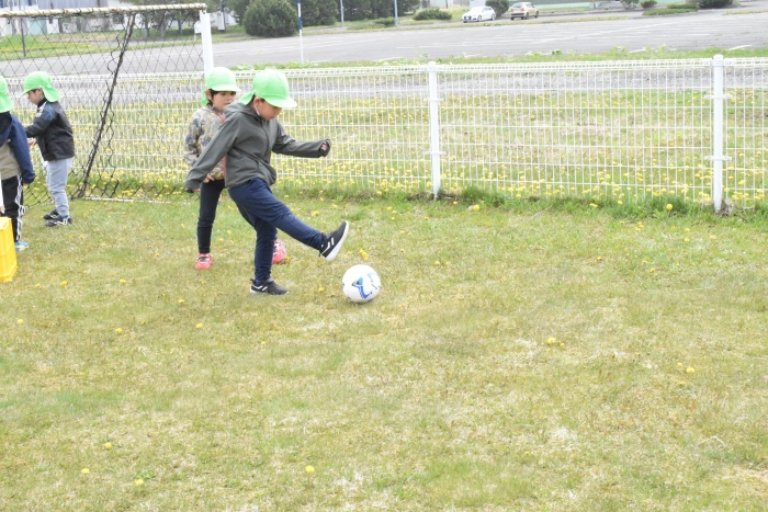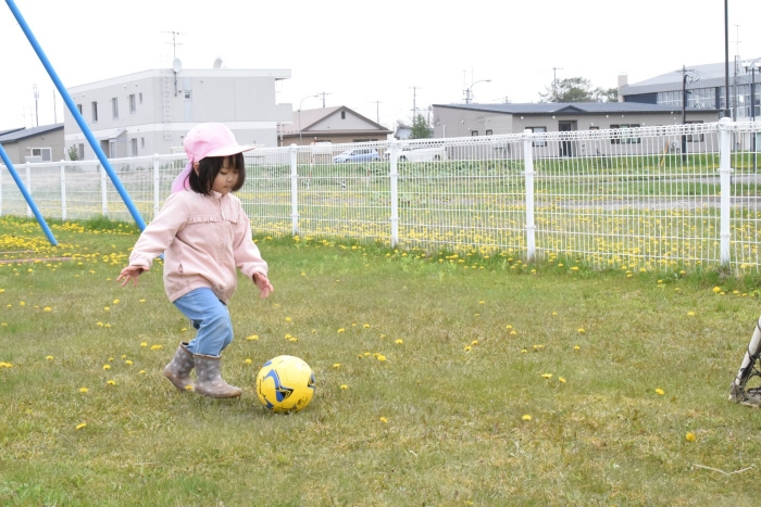 サッカーでは十分に触れるようにボールをたくさん出してみると、広いグランドで転がし始めました。