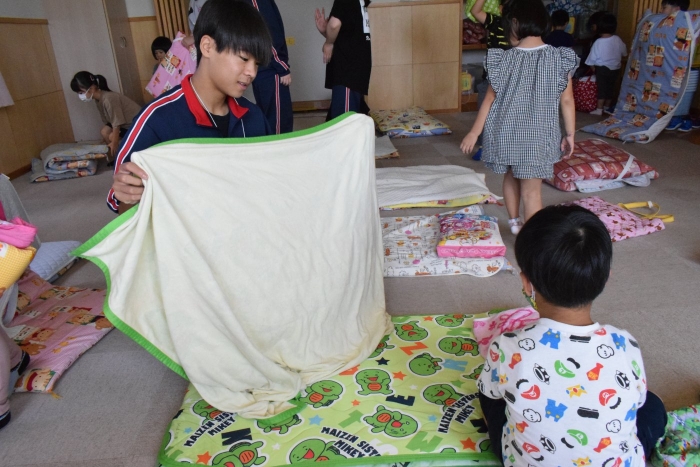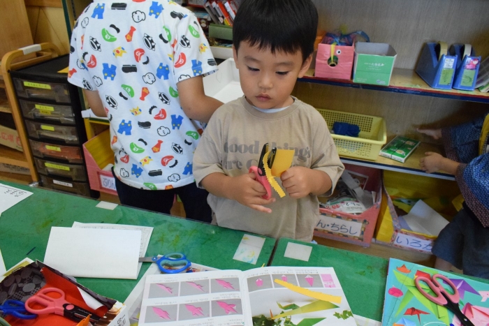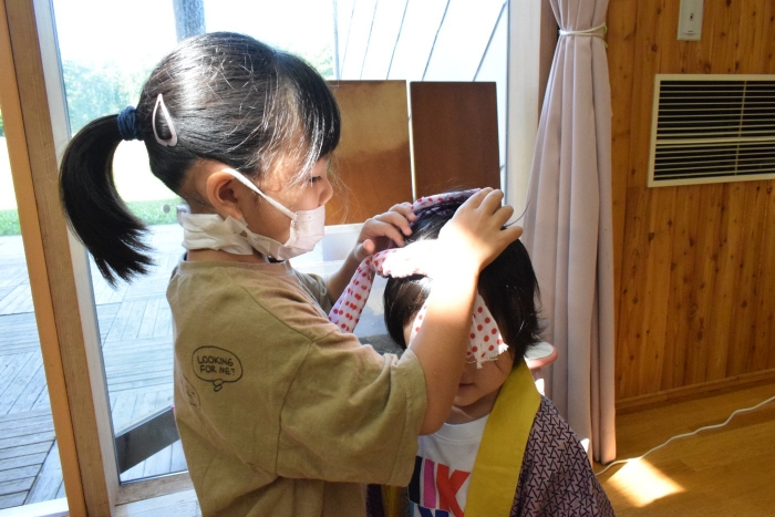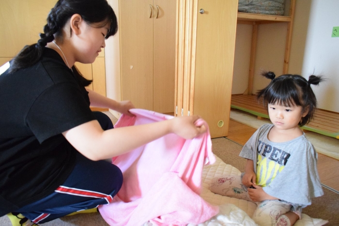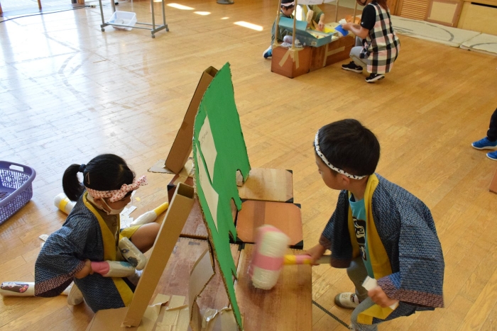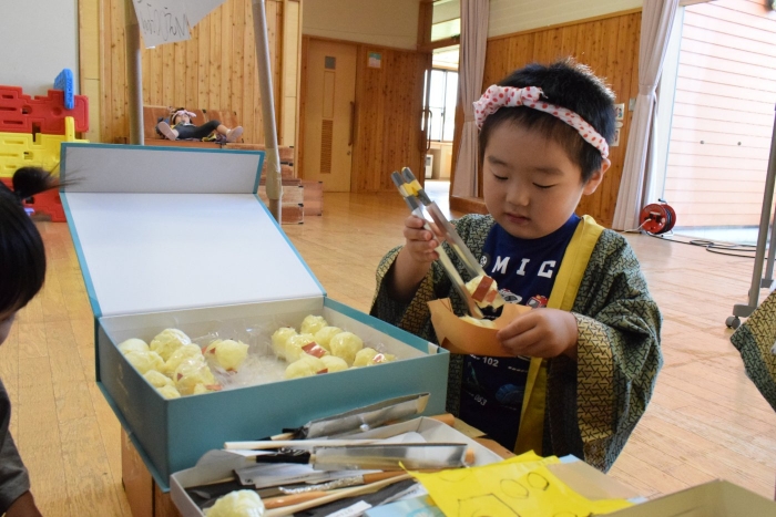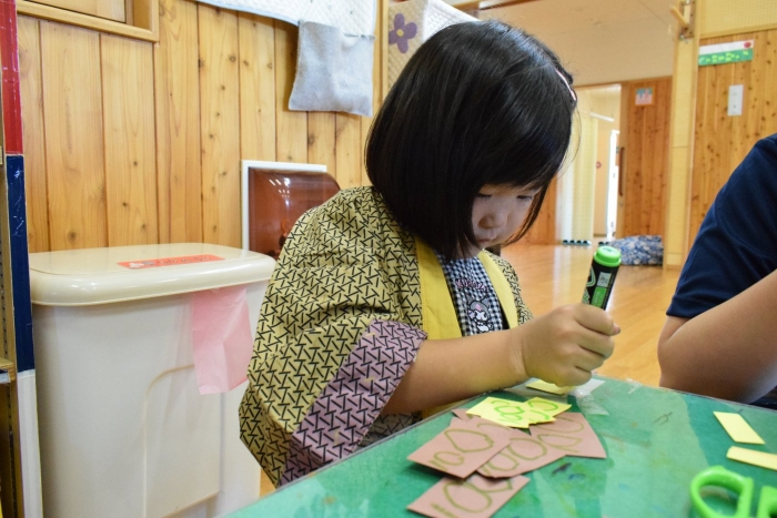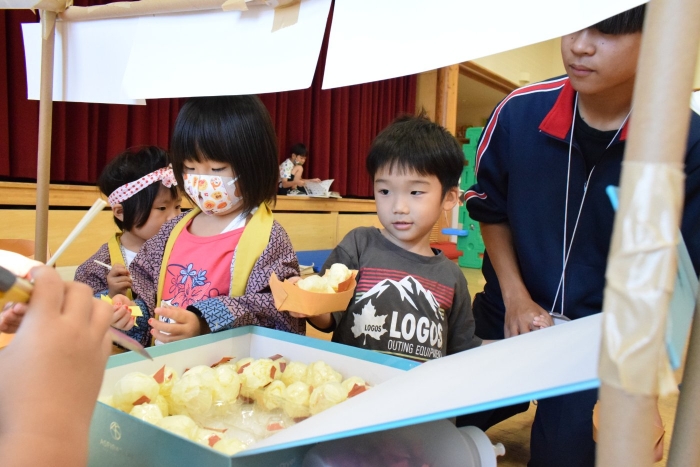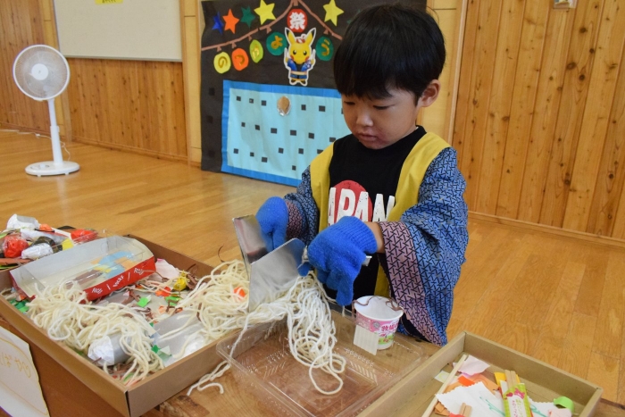 子どもたちのお昼寝をお手伝いした後は保育準備として縁日で使う物を作ってもらいました。子どもと関わる以外にも色々な仕事があることがわかったかな?(^^)/