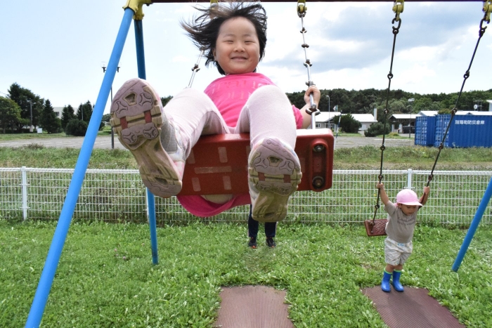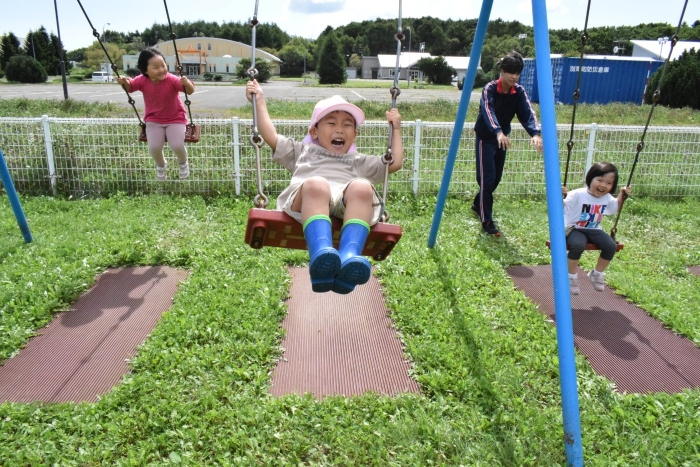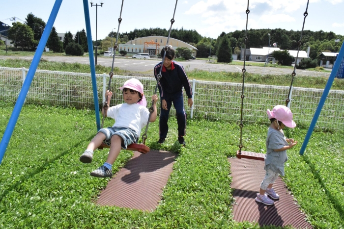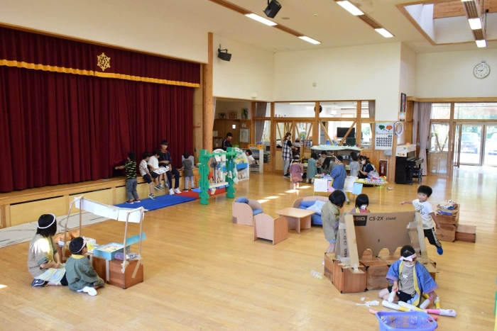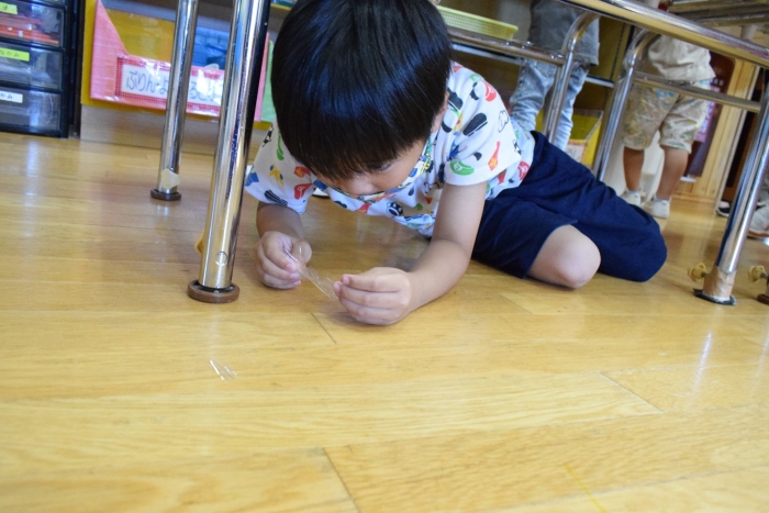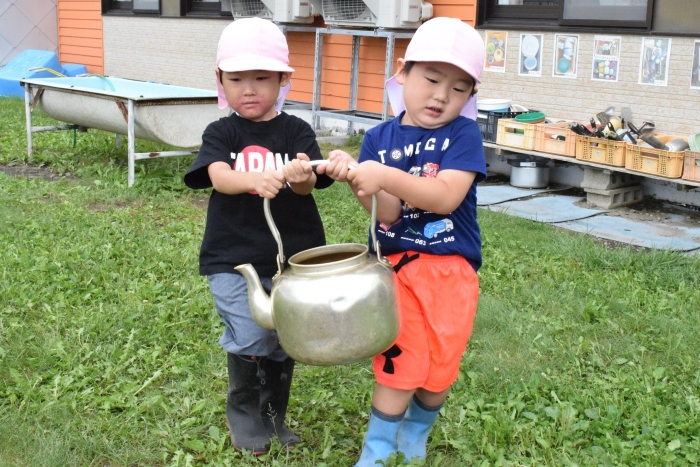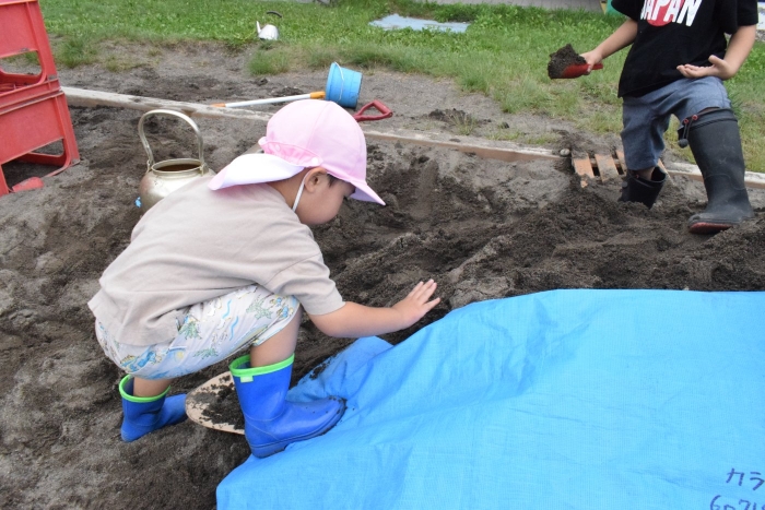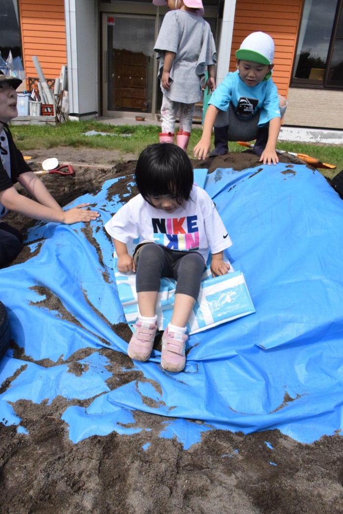 砂場では大きな砂山を滑りたい!と言った子の言葉で、どうやったら滑るのか、とブルーシートを張って試していました。やりたいことに向かって試行錯誤しながら遊びを進めていく過程が学ぶ力に繋がっていくのだと感じました。