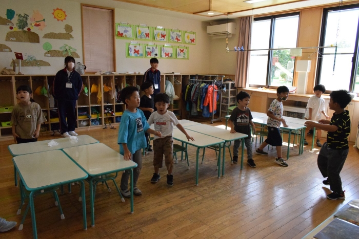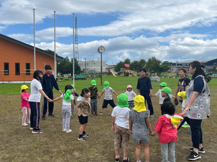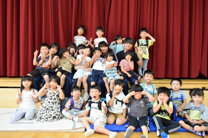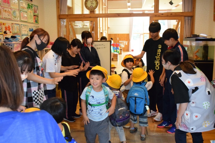今日で職業体験も終了です。最後に全園児で、たくさん遊んでもらったお礼を言いました。