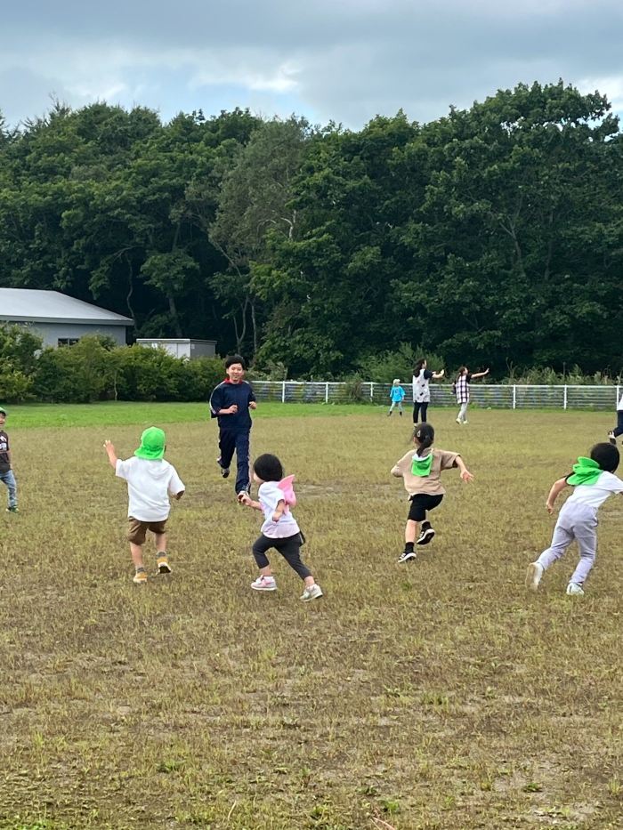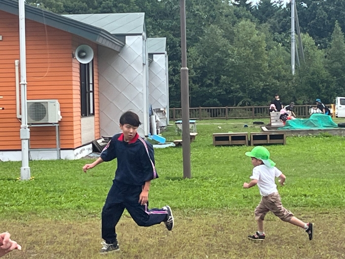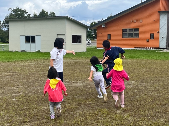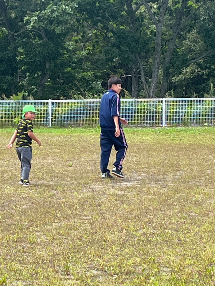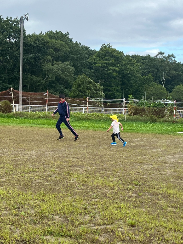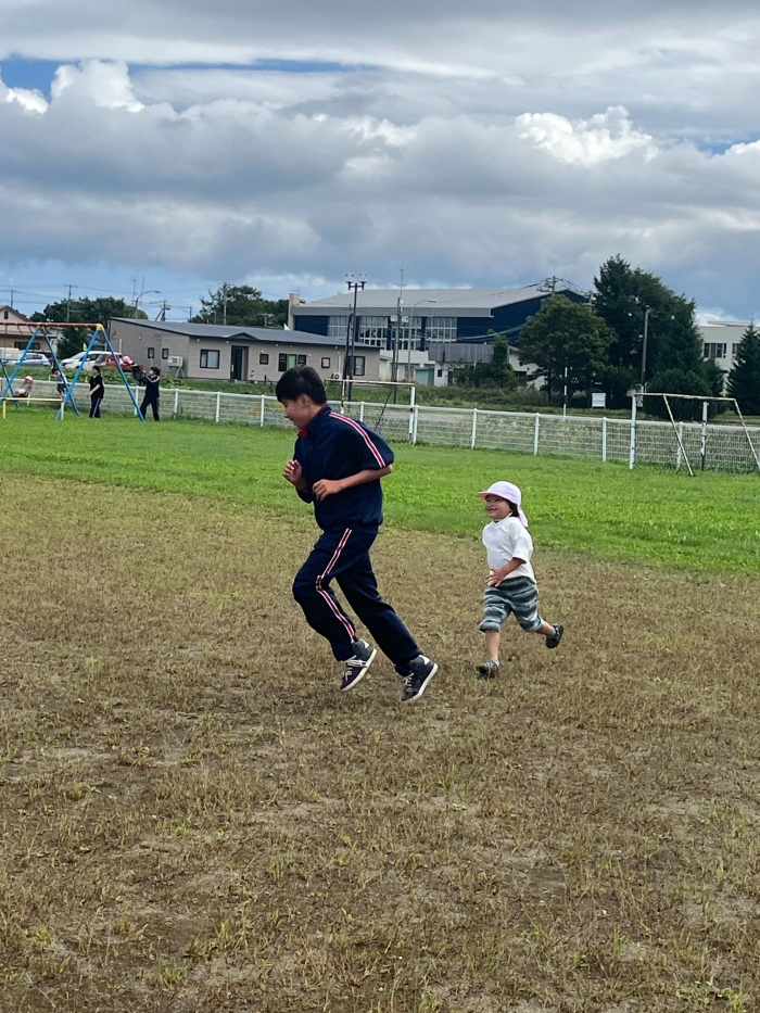 外遊びでは広いグランドで昨日に引き続き『バナナ鬼』や新しく『手つなぎ鬼』もやりました。中学生もハアハア言いながら本気で逃げ回っていましたよ。