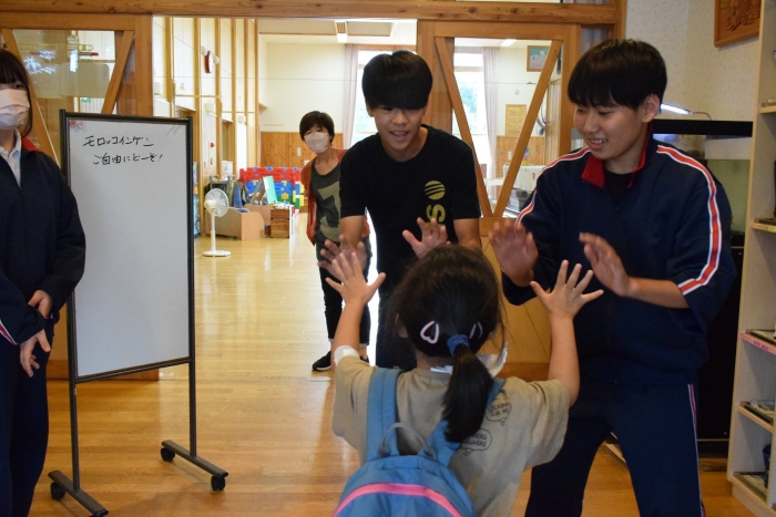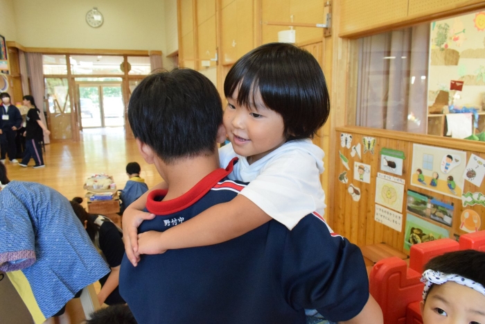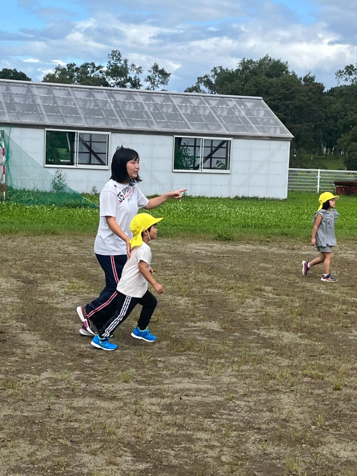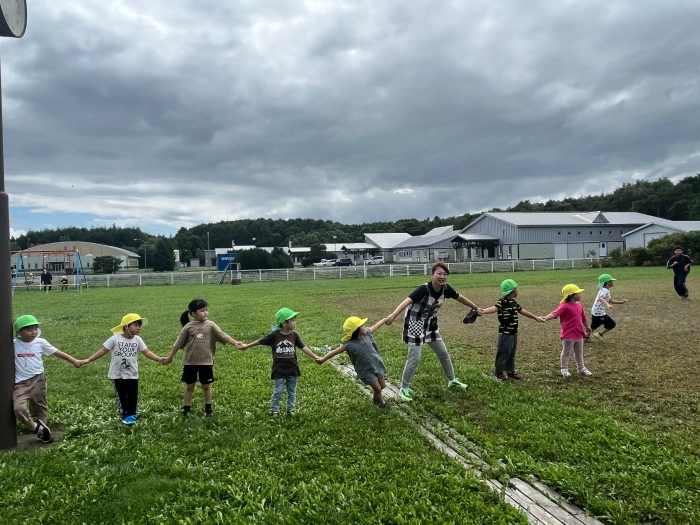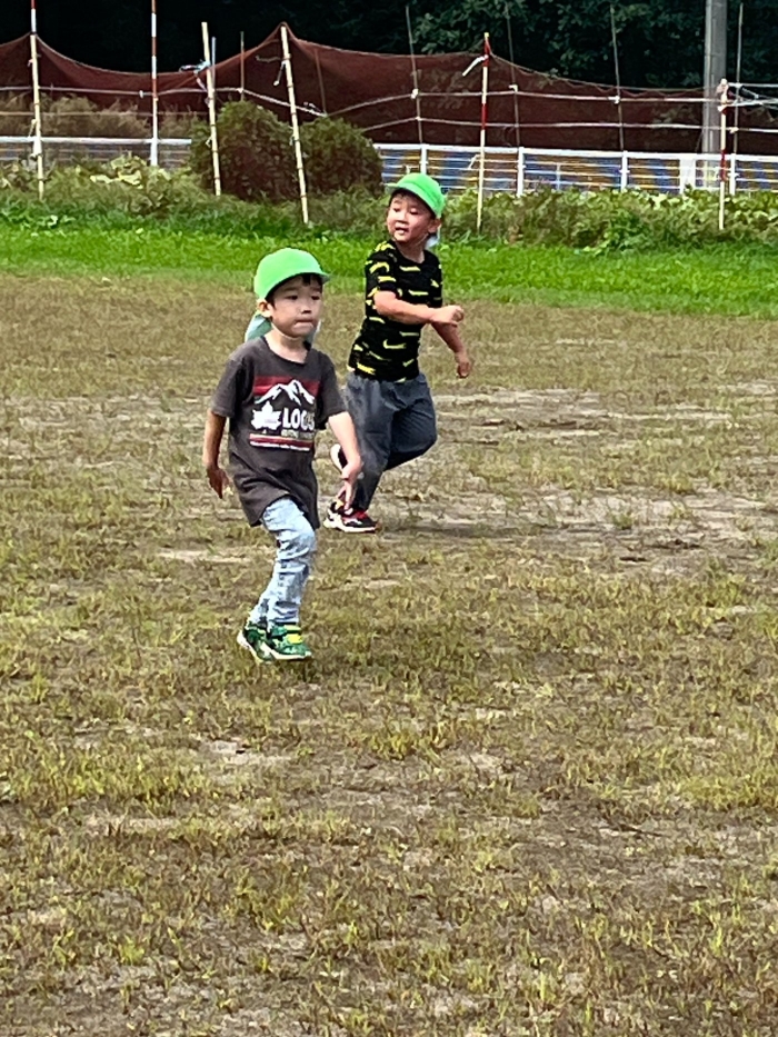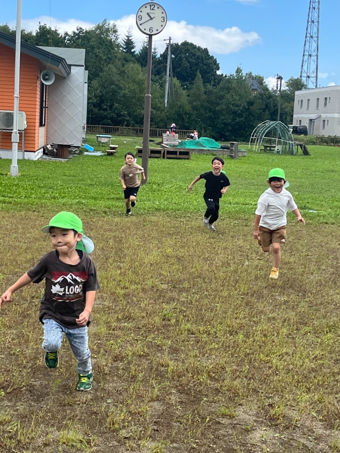 外遊びでは広いグランドで昨日に引き続き『バナナ鬼』や新しく『手つなぎ鬼』もやりました。中学生もハアハア言いながら本気で逃げ回っていましたよ。