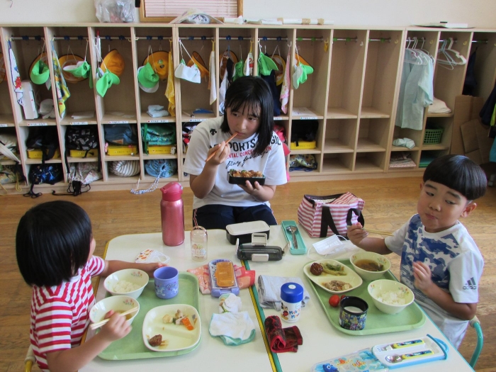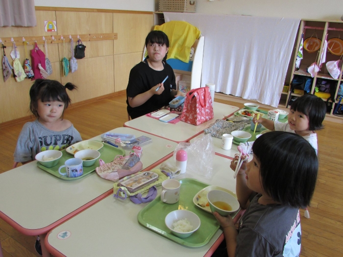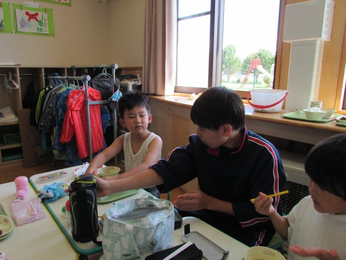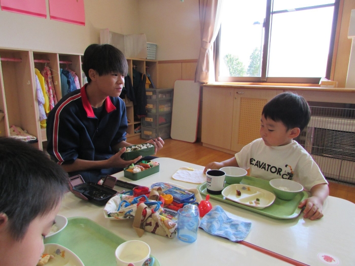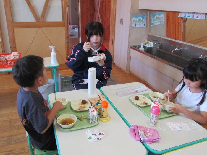 給食では今日も配膳のお手伝いや子どもたち一人一人への声掛けをしながら楽しい雰囲気で食卓を囲みましたよ!(^^)! お替りするときも中学生の先生にお願いしたりしてすっかり頼られていましたよ(^^)/
