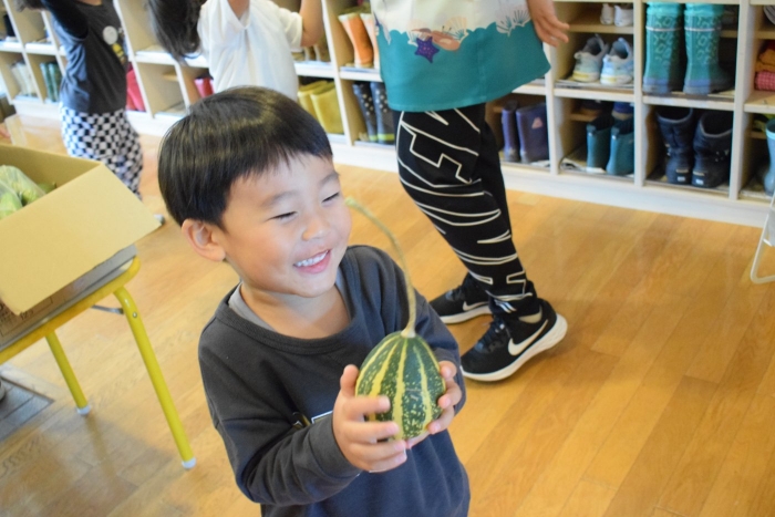 A先生が育てたおもちゃカボチャをたくさんいただきました。可愛い形にみんな大喜び!食べられないけど顔を描いてみようか!とさっそく思い思いの顔をカボチャに描いてみました。なかなか面白いものができましたよ。靴箱の上に飾っているのでぜひご覧ください。