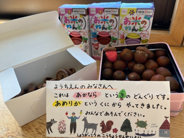 帰りに校長先生から大きなどんぐりを頂きました。お手紙とお米の粘土付きで。幼稚園でも作ってみてください、とのことでした。できたら公民館の作品展に飾れたらいいなと思っています。嬉しいサプライズに感謝です。