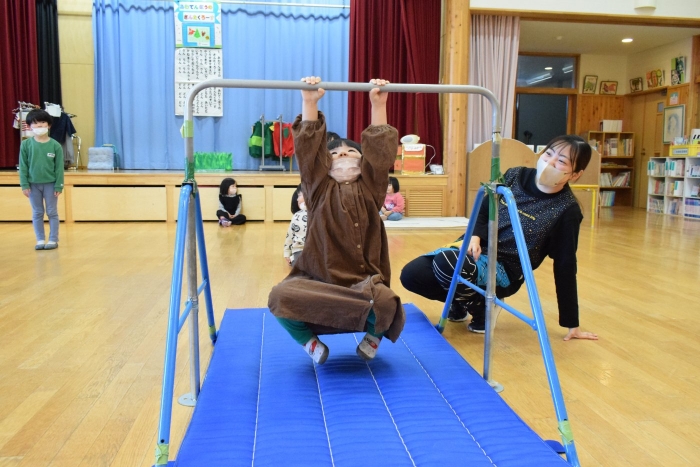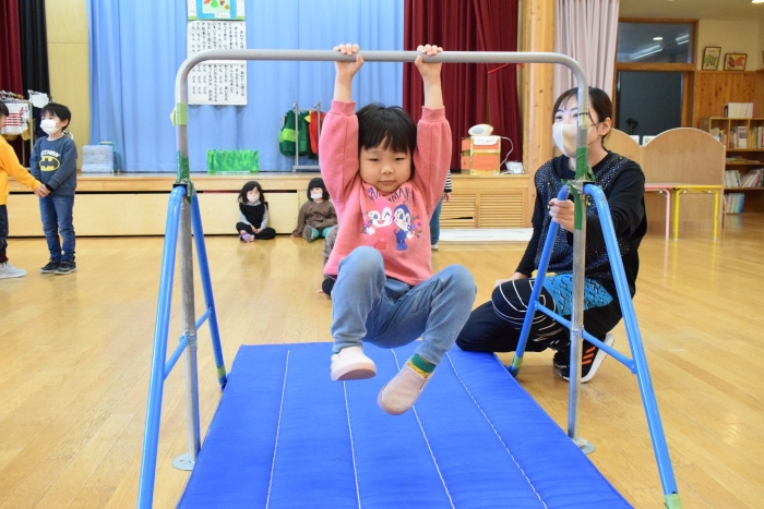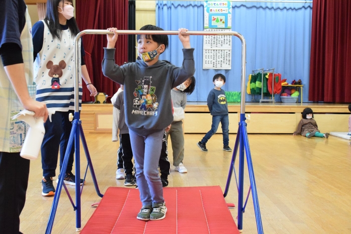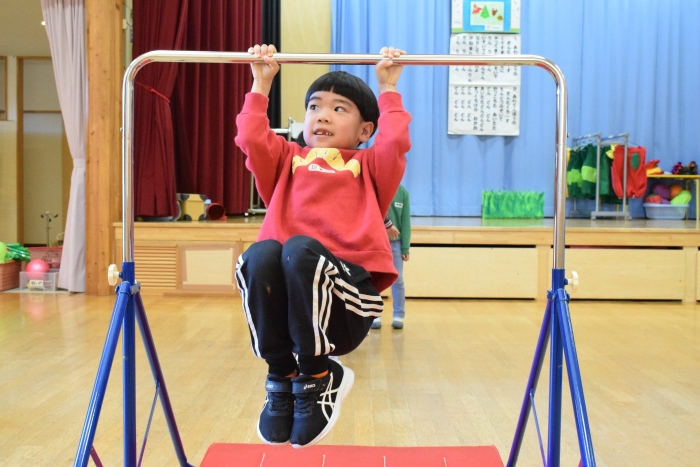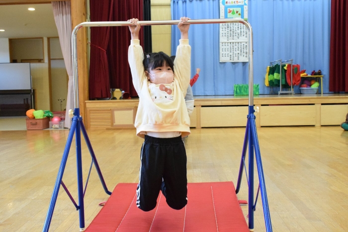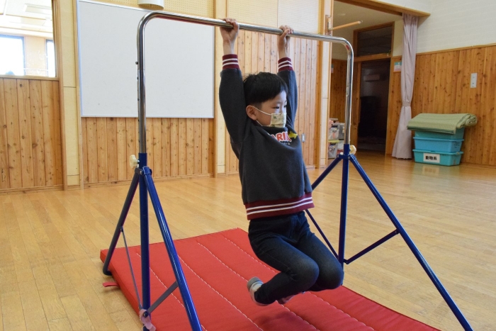 ぶら下がりはマットに足を付けないように腕の力を使って~
