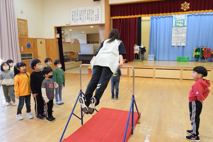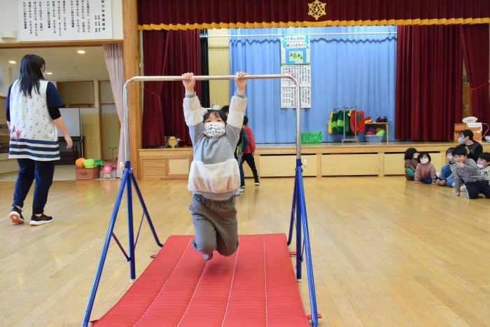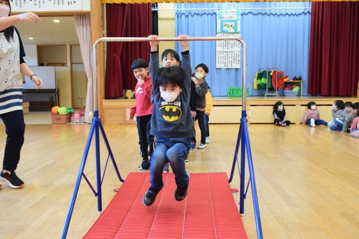 今回は鉄棒に挑戦。ぶら下がりから始まり、前回り、豚の丸焼き、コウモリ、と腕の力や腹筋、背筋を使う動きを楽しみながら取り入れていきました。