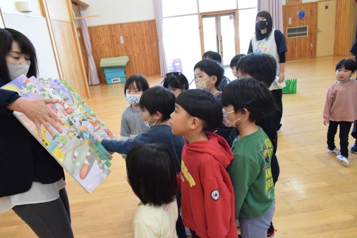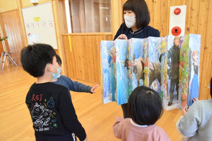今回はトリックアート的なもので、右から見た絵と左から見た絵が違うんです!あら不思議面(*'ω'*) 面白い仕掛けに子どもたちもビックリ!右に行ったり左に行ったりしながら変わる絵の不思議さを楽しんでいました。