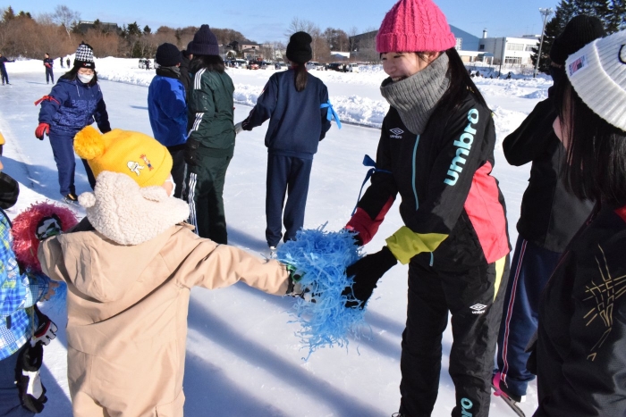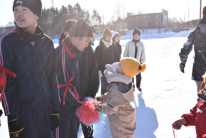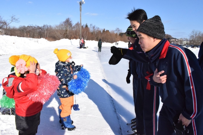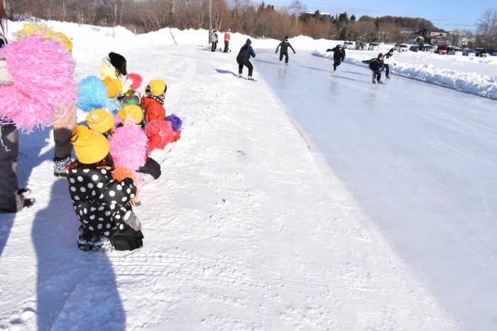 今日は中学校のスケート記録会。来ている子たちで応援に出かけました。覚えているお兄さんやお姉さん、先生たちを見つけて大喜び、ポンポンを振りながら「がんばって~」と大声で叫んでいましたよ。少しは力になったかな?(^^)/