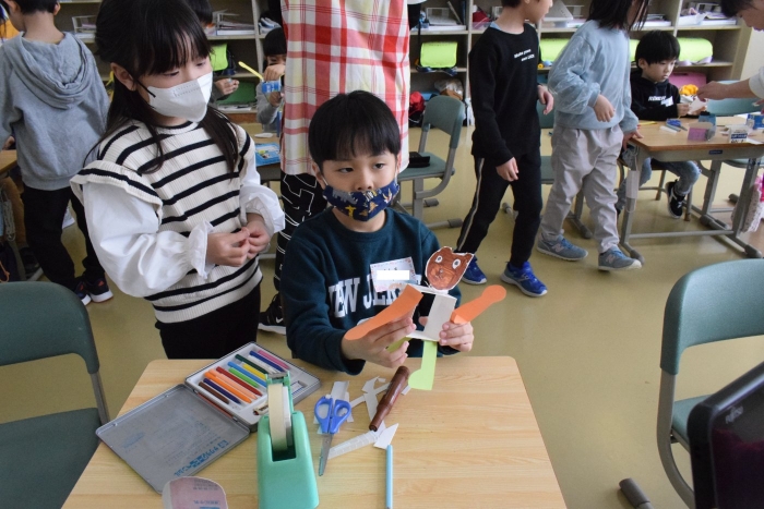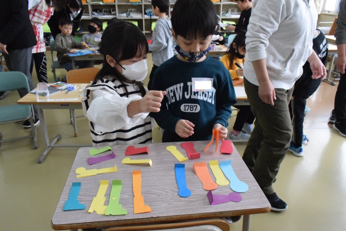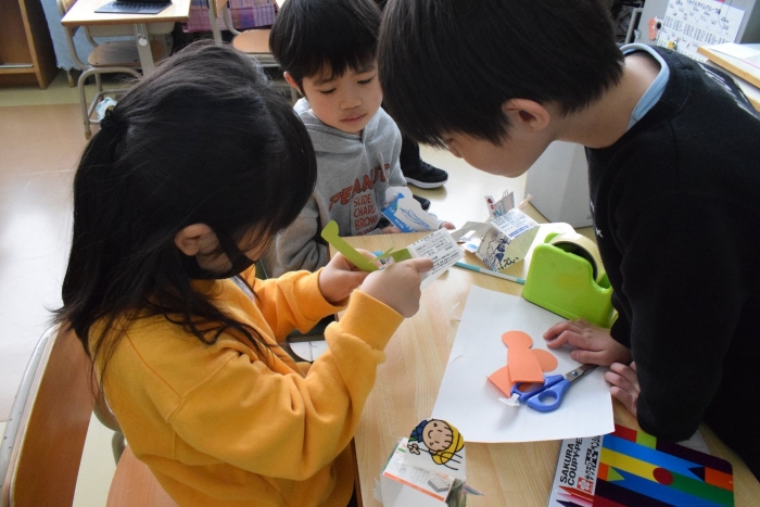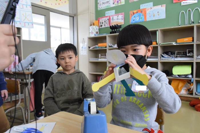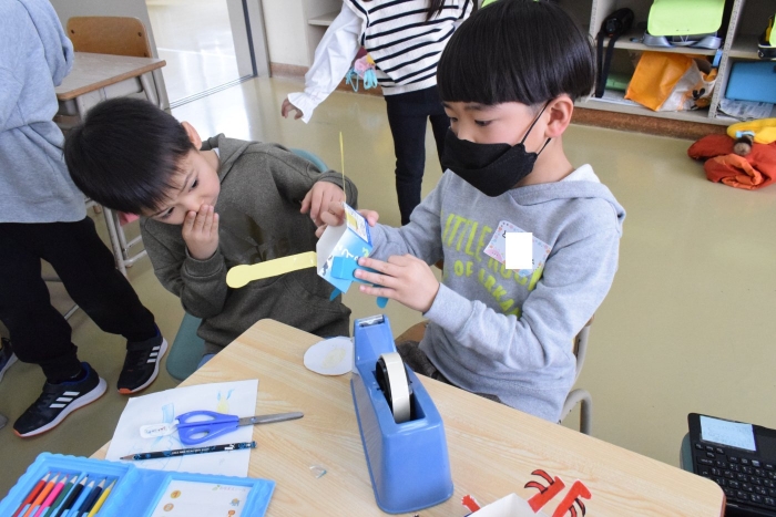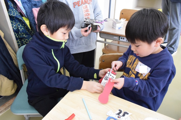 先日の小学校一日入学のときに1年生がさくらさんと一緒にやろうと準備していてくれた工作を今日一緒にやりに行きました。事前に1年生は自分の分を作っていたので教え方も上手、しかも丁寧。テープをちぎってくれたり、押さえててくれたりと、手取り足取り面倒を見てくれましたよ(^^)/ 正しい座り方や鉛筆の持ち方を教えてもらったり、自分の名前を書く練習もして、気持ちはもう一年生!(^^)/
