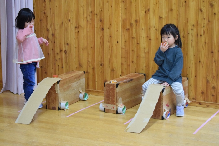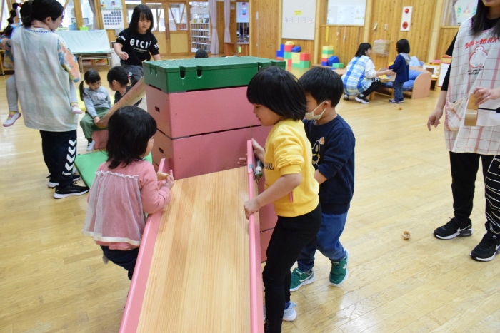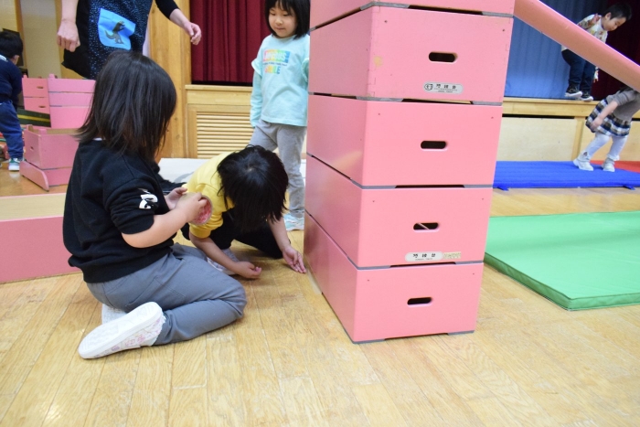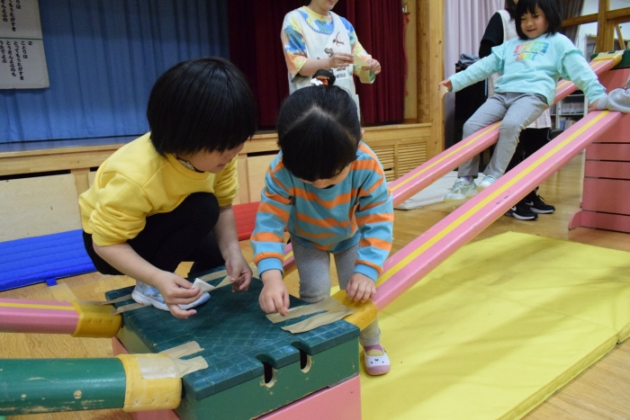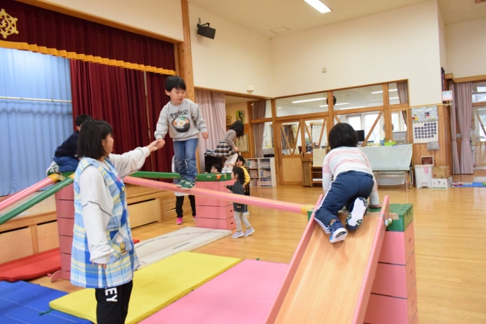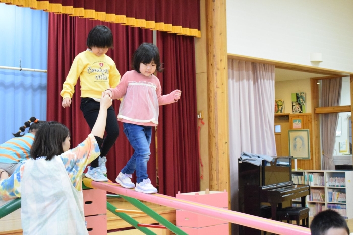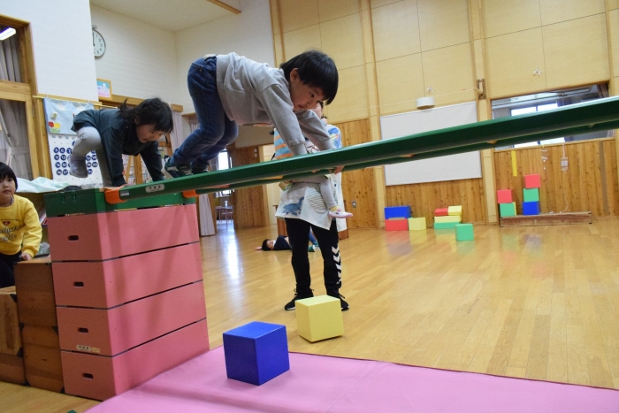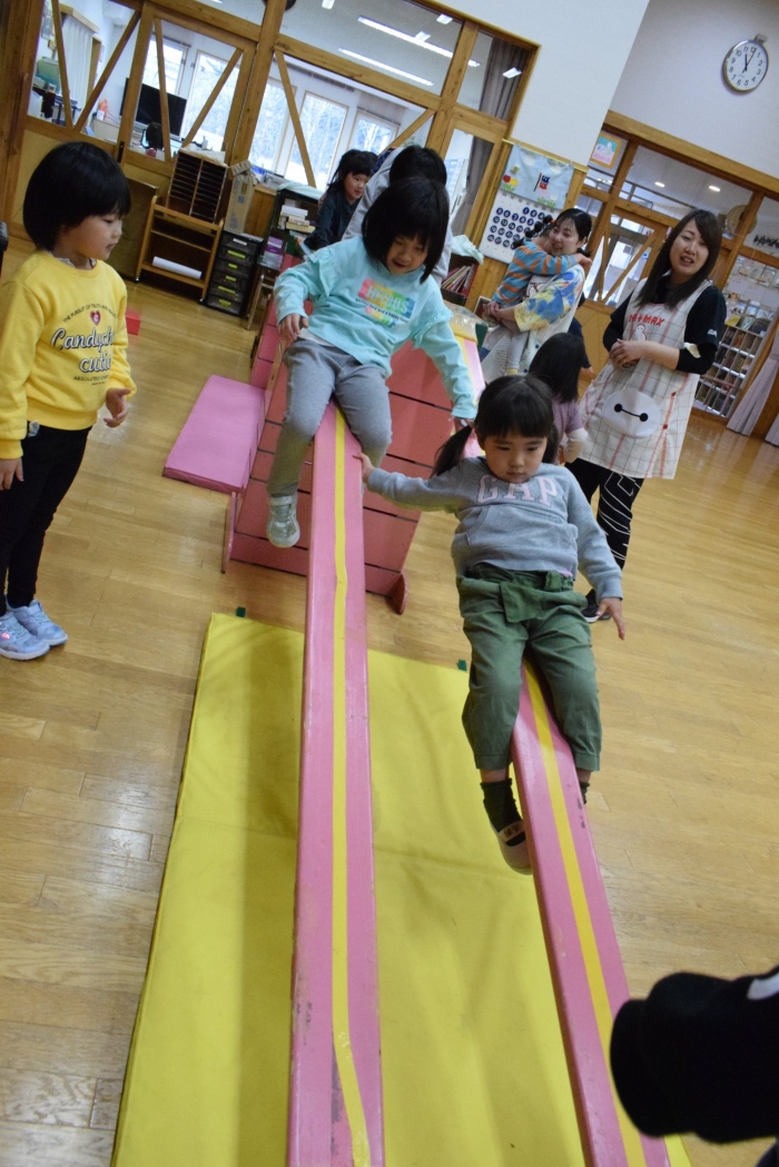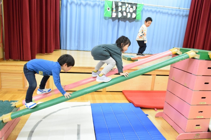 朝の遊びではお休み前から遊んでいた巧技台でさっそく渡ってみたり、滑ってみたり・・・。