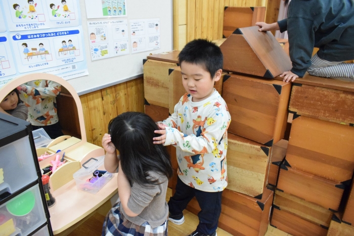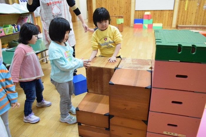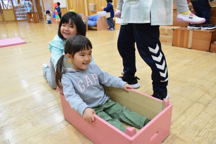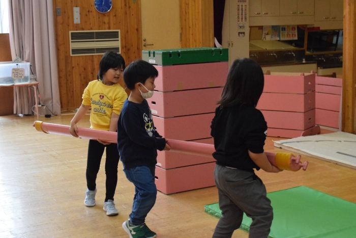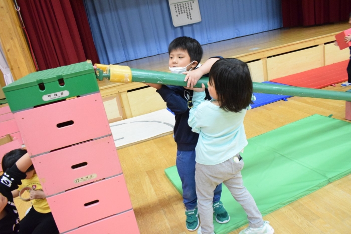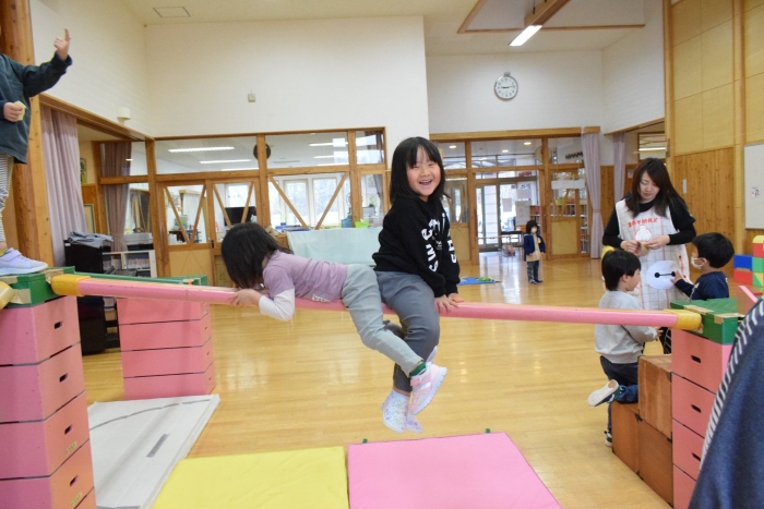 遊び慣れた遊具で全身を使っていろいろな動きを楽しんでいましたよ。ちょっと難しいと思っていたこともお友だちのやっている姿に刺激され、挑戦する気持ちがふつふつと沸き上がり、お友だちや先生の手を借りながら頑張る姿もたくさん見られていました。