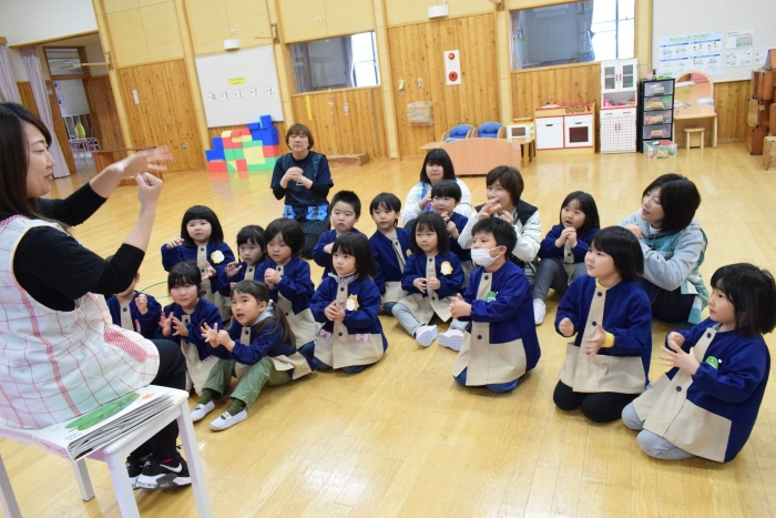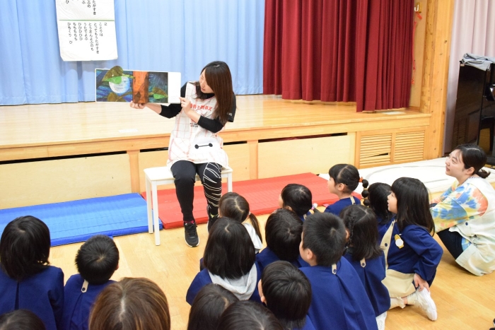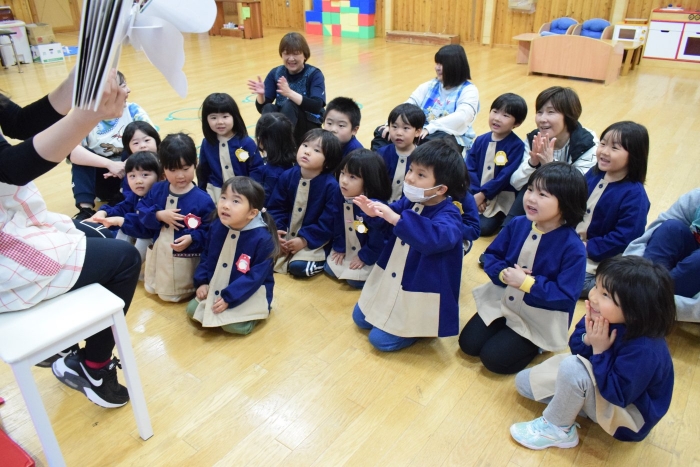 今日はA先生が『はらぺこあおむし』の飛び出す絵本を読んでくれました。すっかりお話が頭に入っている子どもたちは「それでもおなかはぺっこぺこ」と絵本の世界に入り込んで飛び出す仕掛けにワクワクしながら楽しんでいましたよ(^^)/